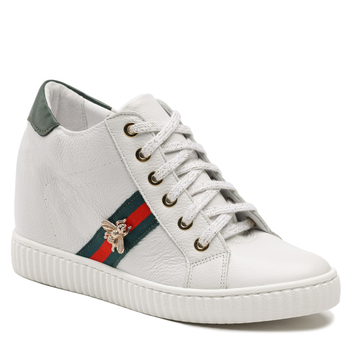 To, że buty na koturnie są modne, już wiesz. Możesz je znaleźć praktycznie w każdym sklepie stacjonarnym i internetowym. Każda z kobiet marzy o najmodniejszym modelu dla siebie. Jaka wersja jest trendy? Ostatnie sezony pokazały, że białe sneakersy na koturnie cieszą się największą popularnością. Pasują niemal do każdej stylizacji. Bardzo modne są buty damskie sportowe na koturnie z dodatkowymi akcentami. Zdobione sneakersy znajdziesz u R.Polańskiego. Buty są w uniwersalnym kolorze, a po bokach i przy cholewce posiadają wstawki. Na jednym z tych elementów została przymocowana ozdoba w kształcie pszczoły, która nadaje im oryginalny charakter.