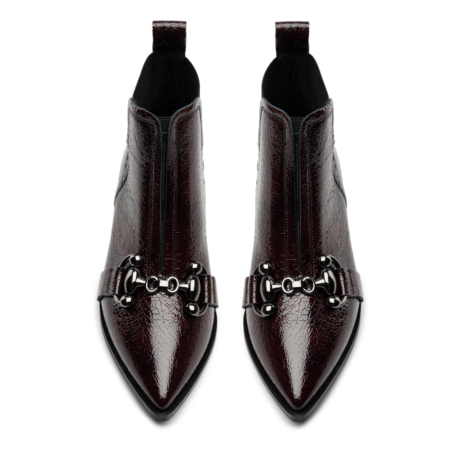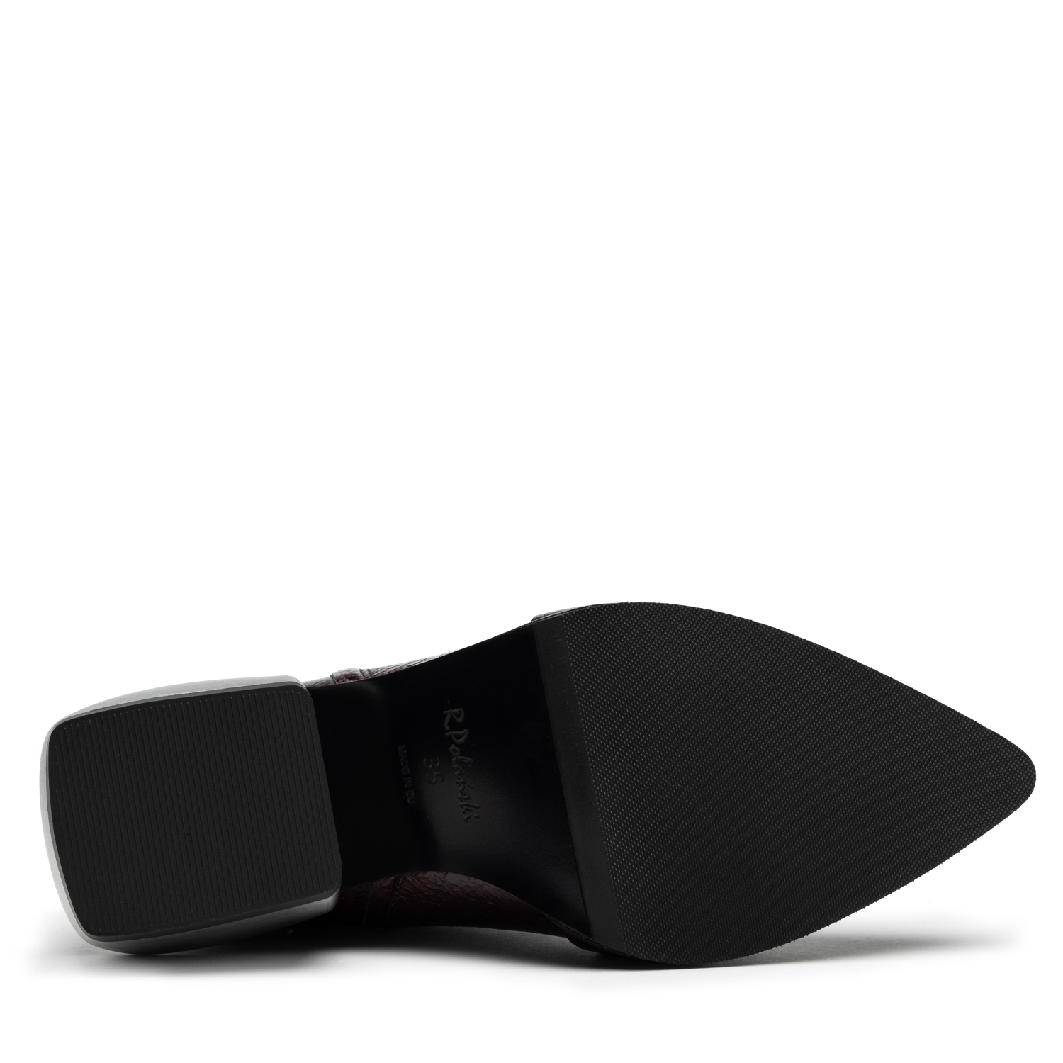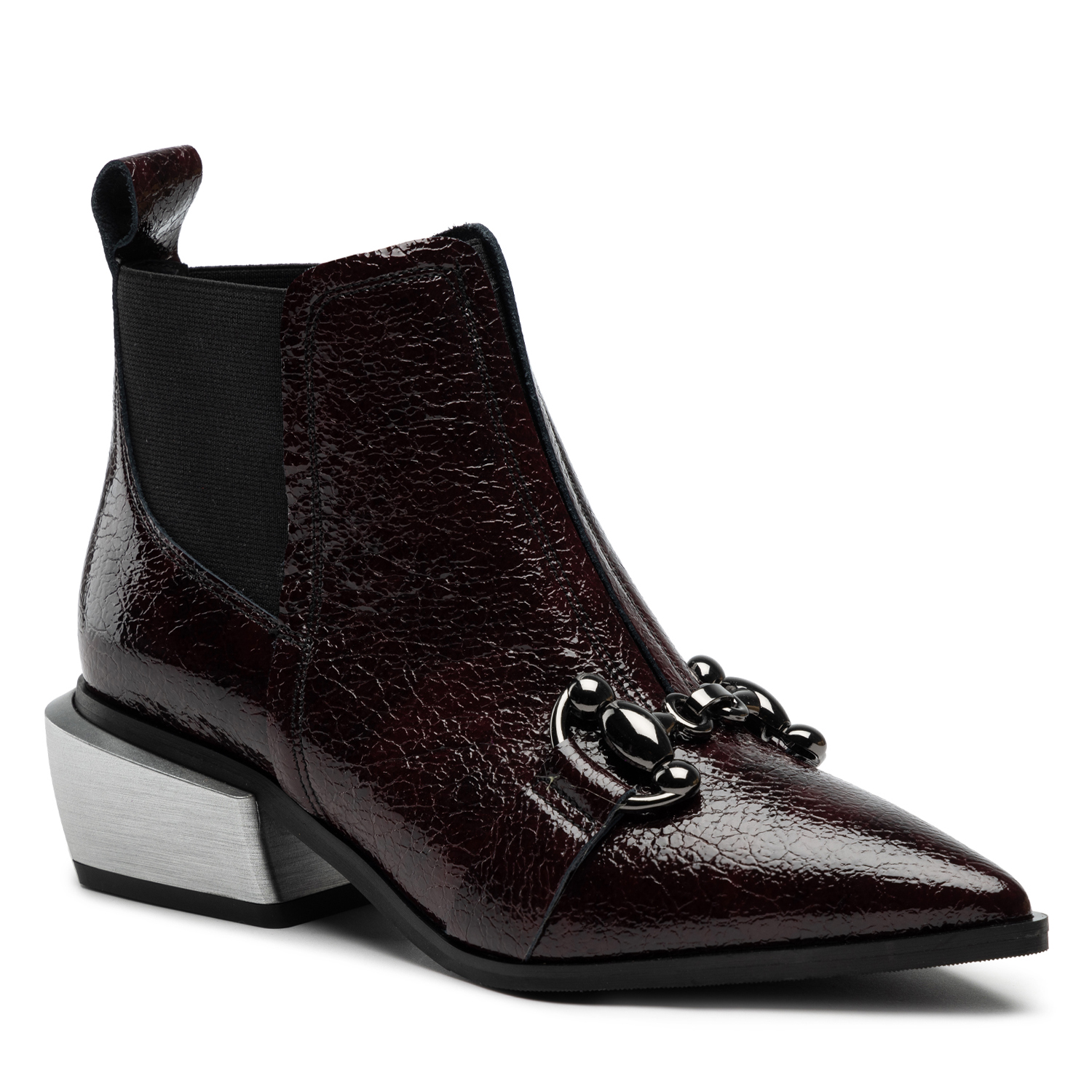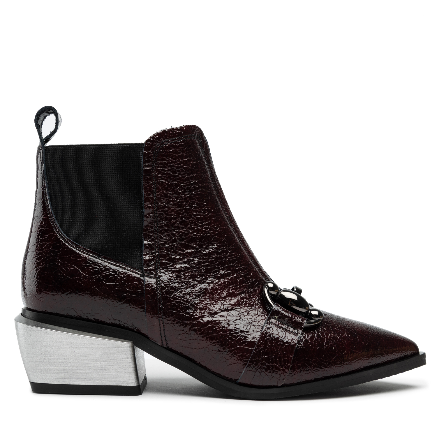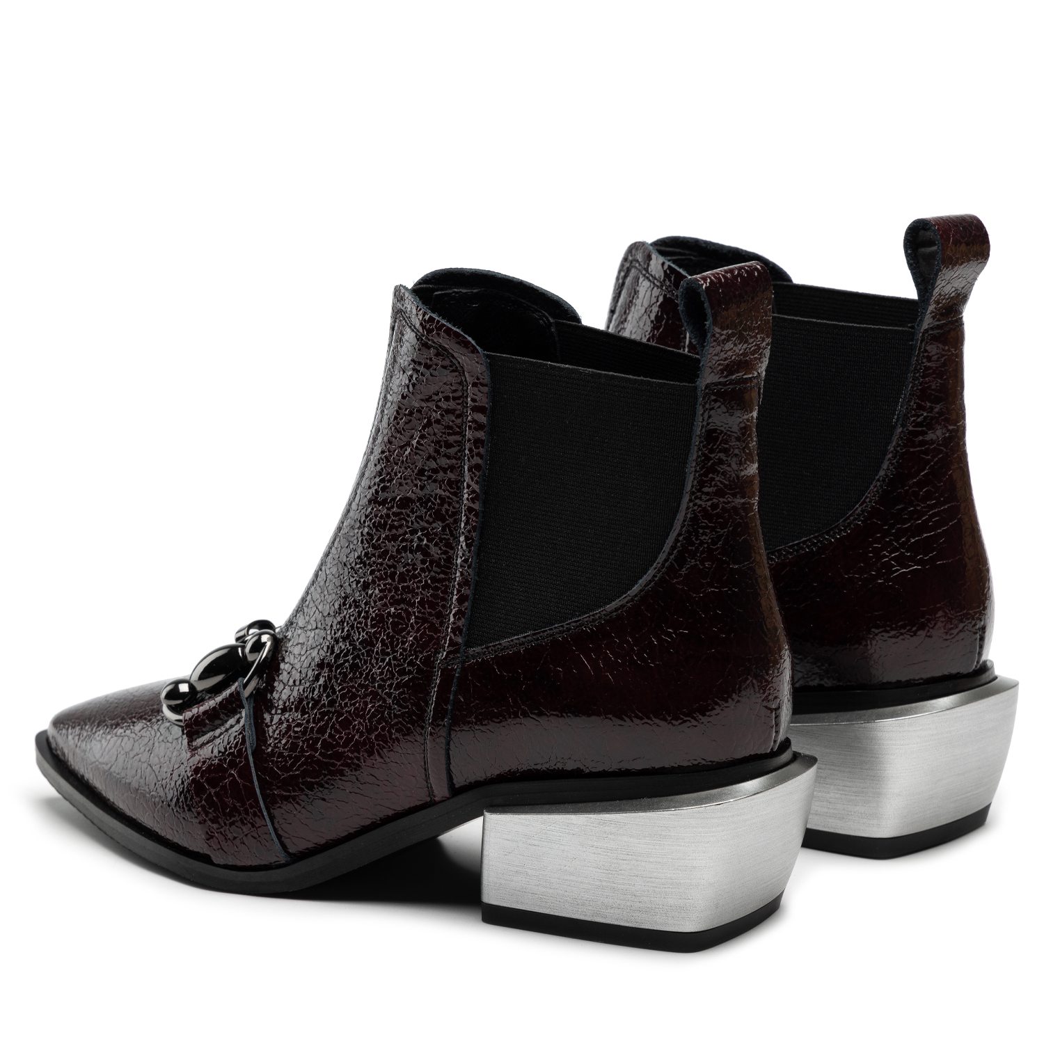 Bordowy NaplakBotki na obcasie wyprodukowano z naturalnej skóry i wyposażono w skórzaną wkładkę. Materiał wykorzystany do wyrobu podeszwy stanowi wysokogatunkowe tworzywo. But zdobi obcas w formie klocka o wysokości 4,5 cm, zaś całkowita wysokość botka wynosi ponad 17 cm, dzięki czemu obuwie sięga powyżej kostek. Buty nie posiadają zapięcia - są wygodnie wsuwane, a odzianą w nie stopę wysmukla nosek uformowany w szpic. Skórzana powierzchnia obuwia delikatnie połyskuje i posiada niejednolitą ozdobną teksturę. Z przodu botków umieszczona została błyszcząca dekoracyjna klamra z metalu.