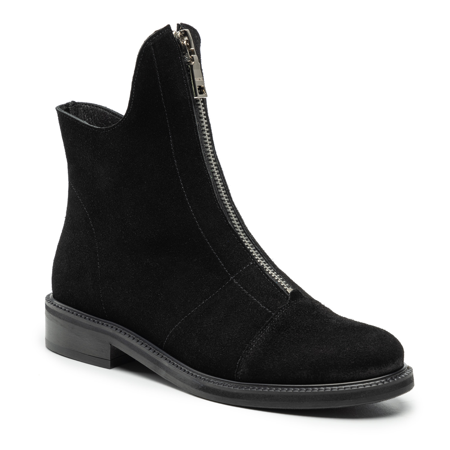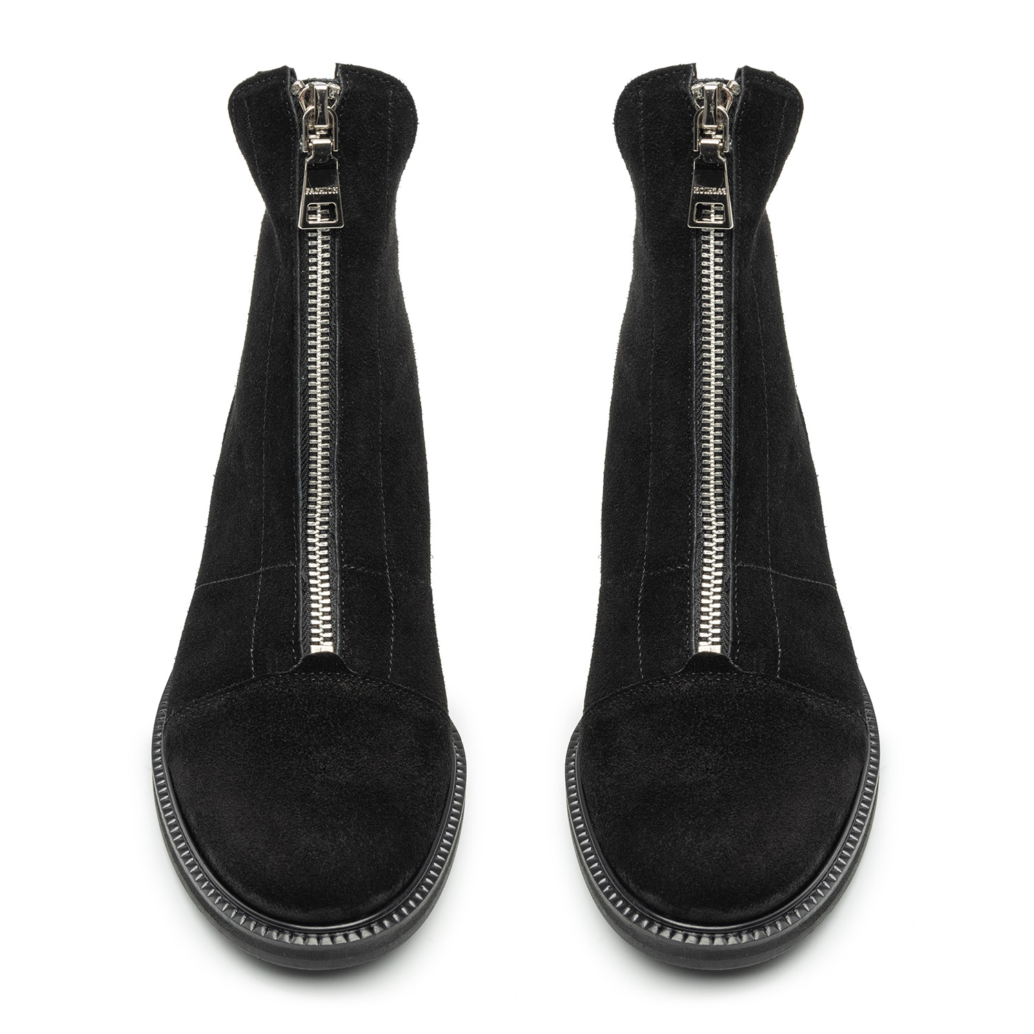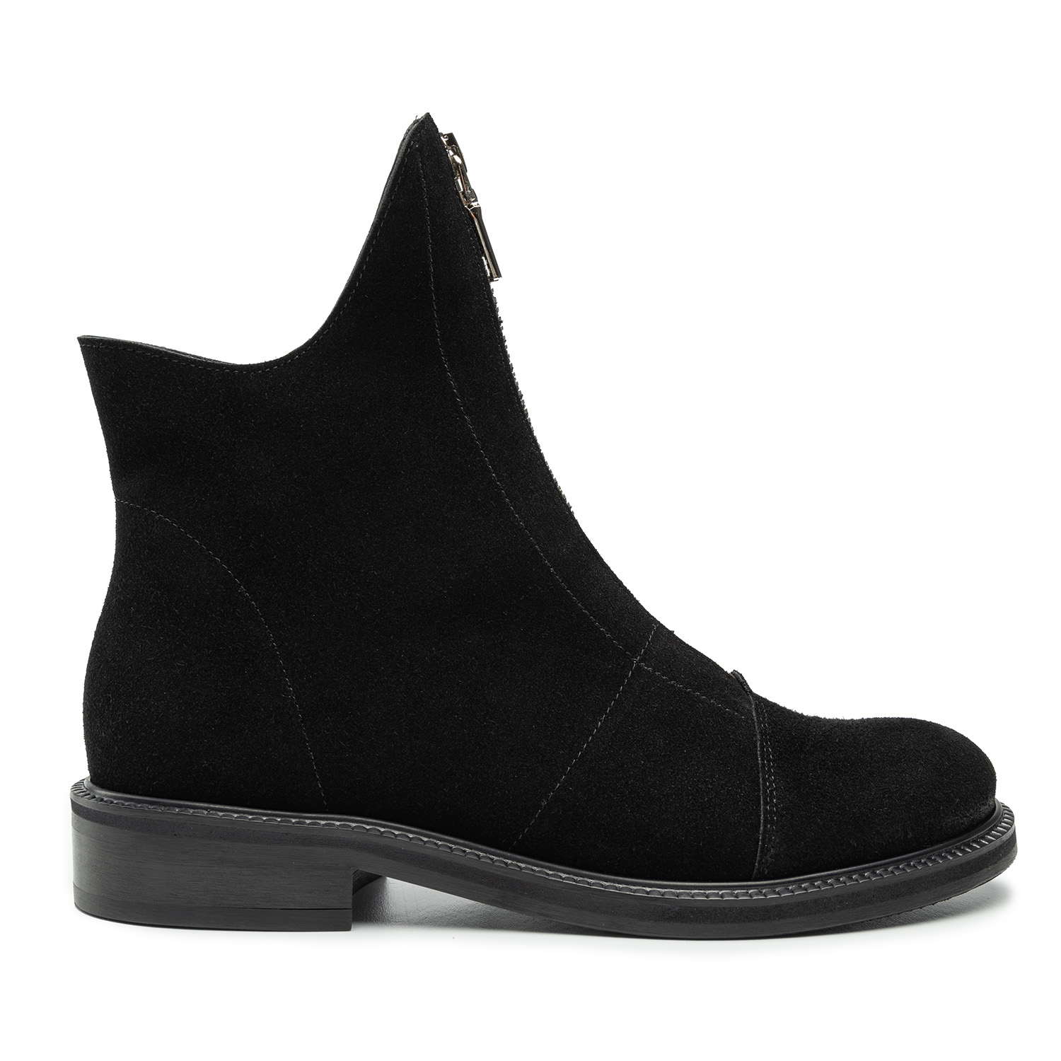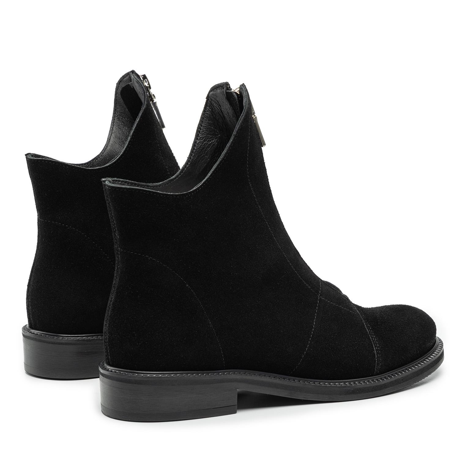 Czarne botki z naturalnej skóry zamszowej to produkt dedykowany paniom lubiącym przykuwać uwagę otoczenia. Buty przyciągają wzrok suwakami ozdabiającymi ich przednią część. Suwaki pełnią także rolę funkcjonalnego zapięcia. Eleganckiego sznytu dodaje obuwiu jego asymetryczna konstrukcja - przód botków jest o kilka centymetrów wyższy niż ich tylna część. Stopie wygodę zapewnia płaski obcas o wysokości 3 cm wykonany z wysokogatunkowego tworzywa, skórzana wkładka oraz okrągły nosek, nieograniczający swobody ruchu palców.