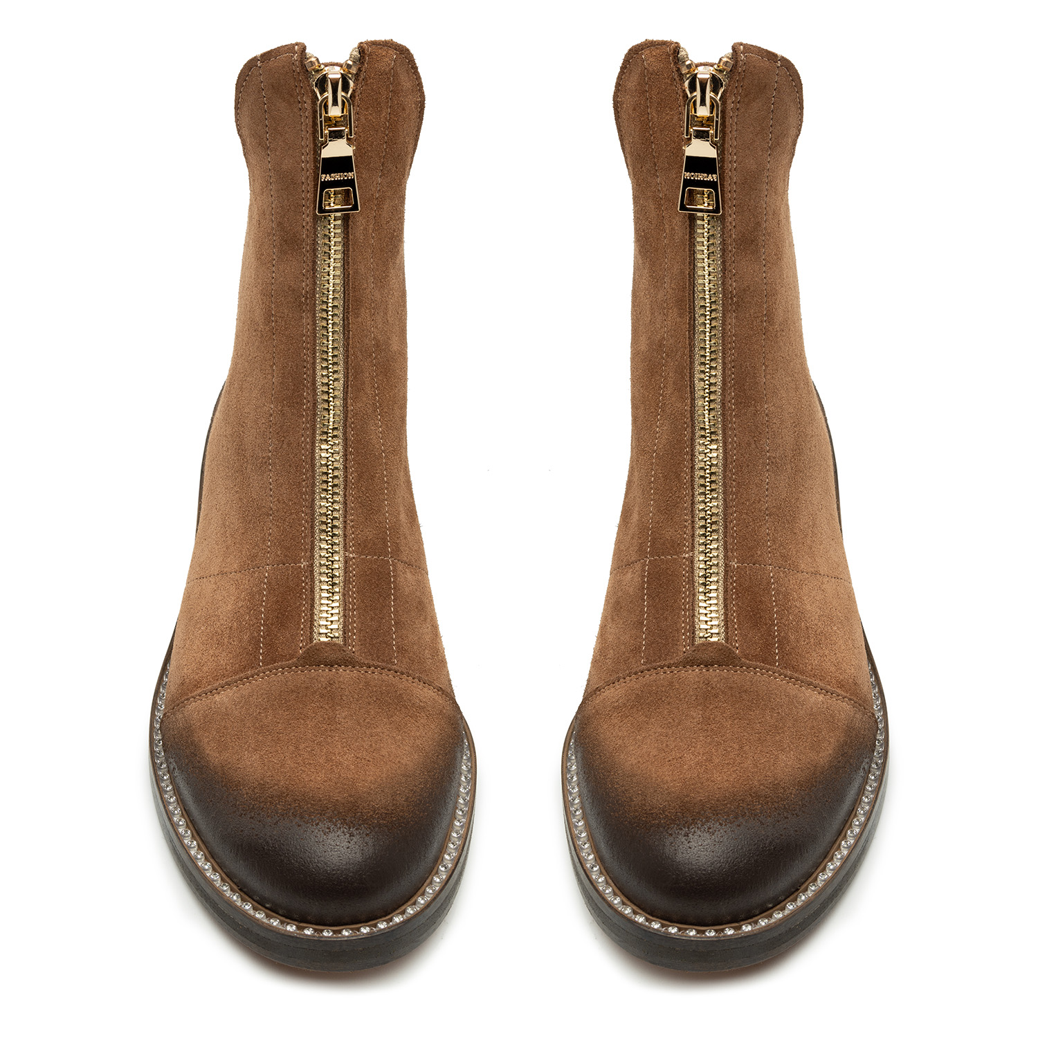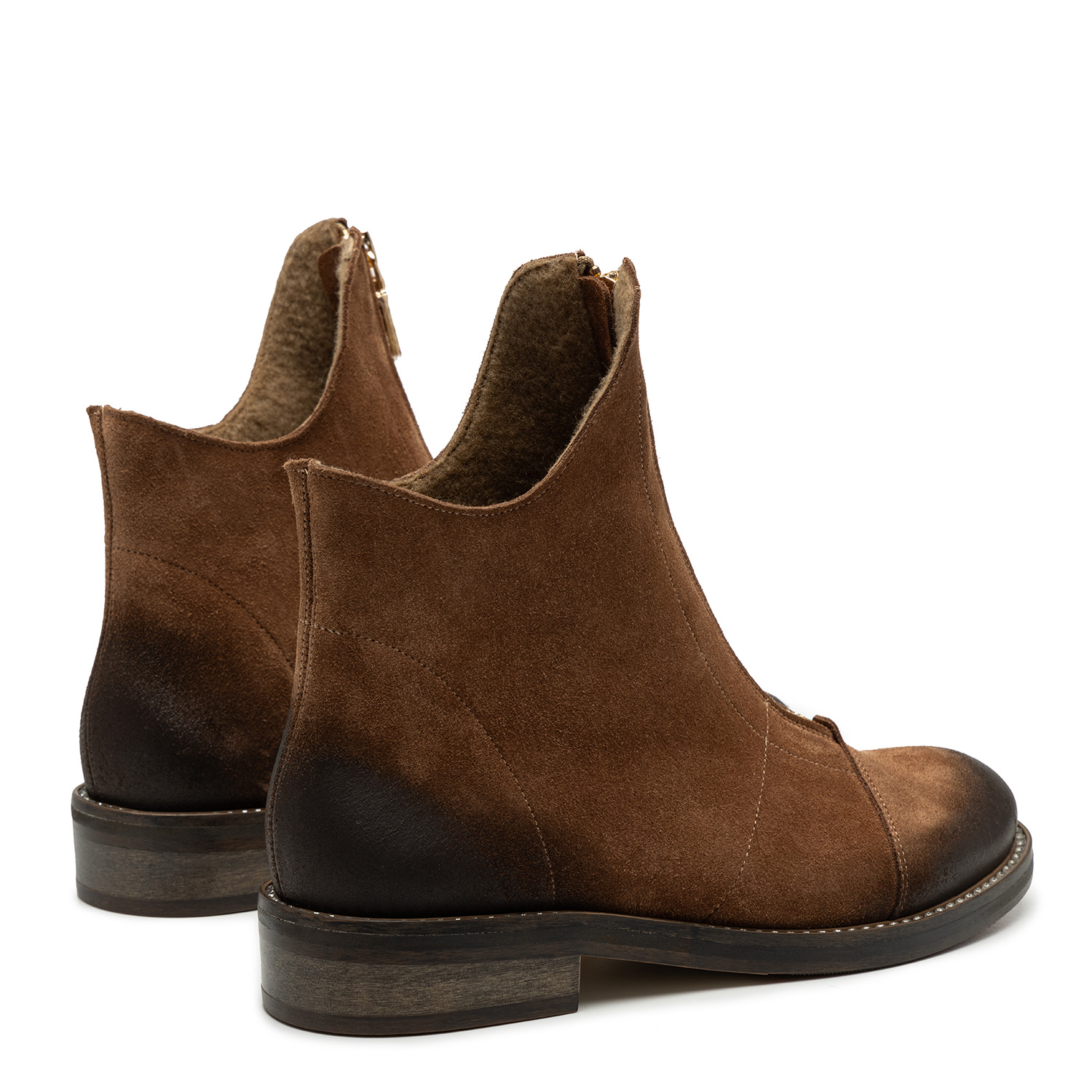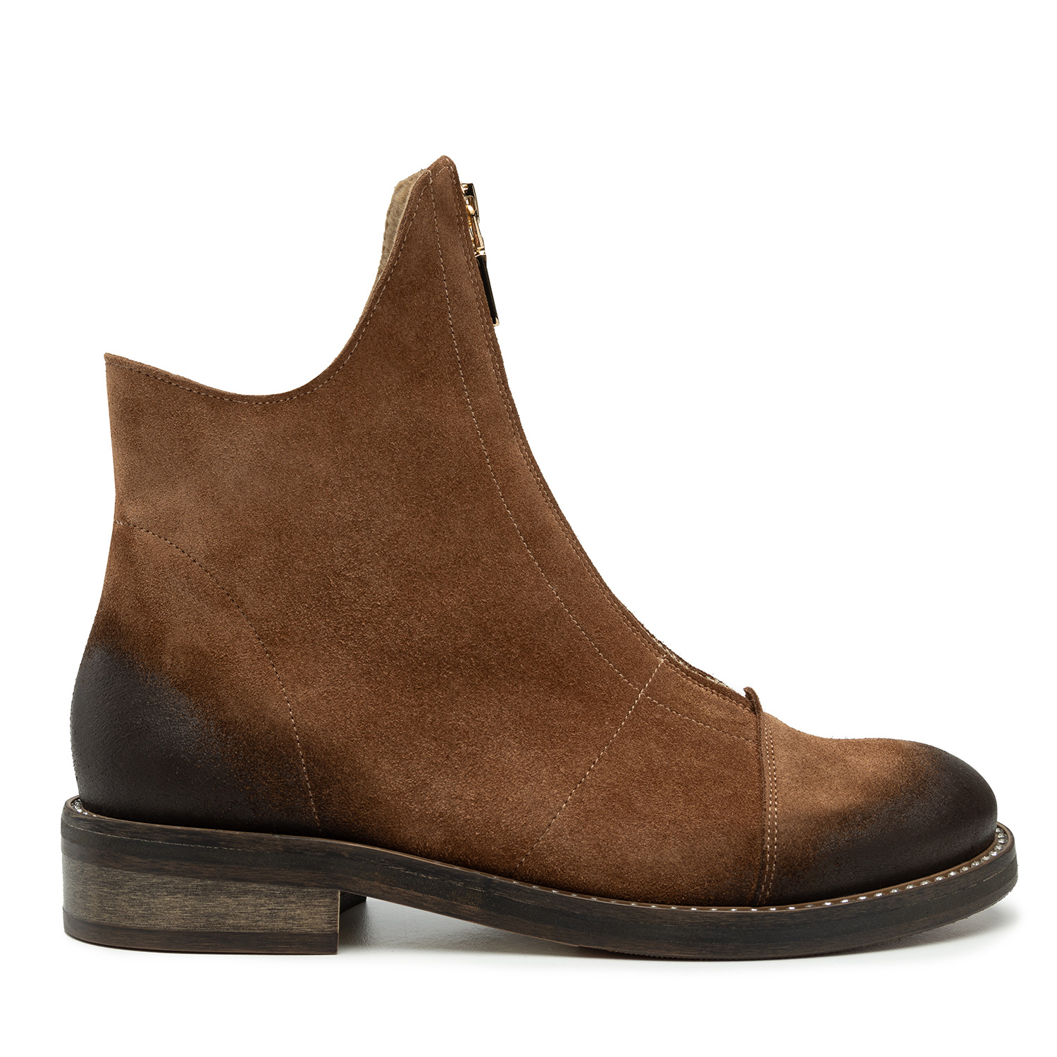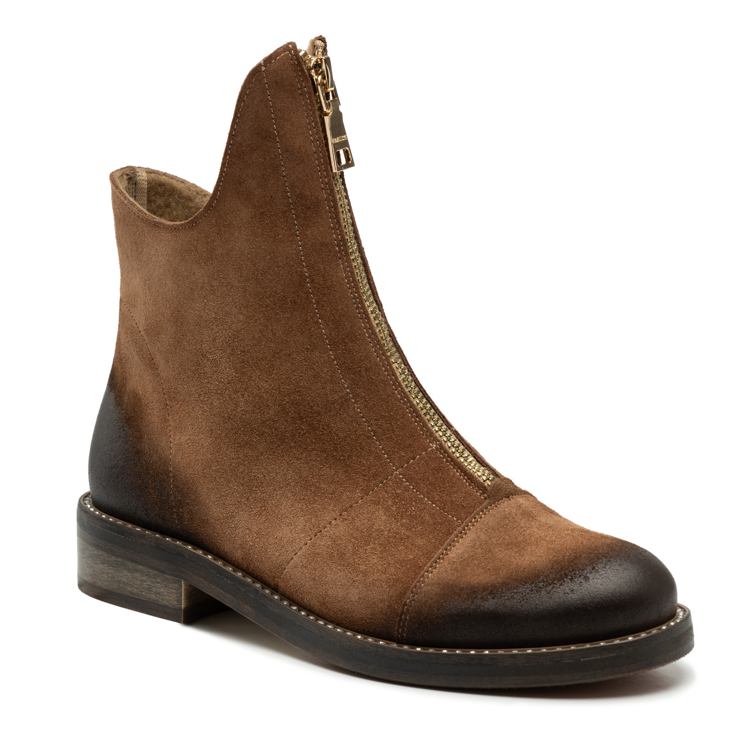 Tabacco ZamszBrązowe botki z naturalnej skóry zamszowej to produkt dedykowany paniom lubiącym przykuwać uwagę otoczenia. Buty przyciągają wzrok suwakami ozdabiającymi ich przednią część. Suwaki pełnią także rolę funkcjonalnego zapięcia. Eleganckiego sznytu dodaje obuwiu jego asymetryczna konstrukcja - przód botków jest o kilka centymetrów wyższy niż ich tylna część. Stopie wygodę zapewnia płaski obcas o wysokości 3 cm wykonany z wysokogatunkowego tworzywa oraz okrągły nosek, nieograniczający swobody ruchu palców. Środek butów wyściełany jest ociepleniem, dzięki czemu buty idealnie nadają się na większe mrozy.