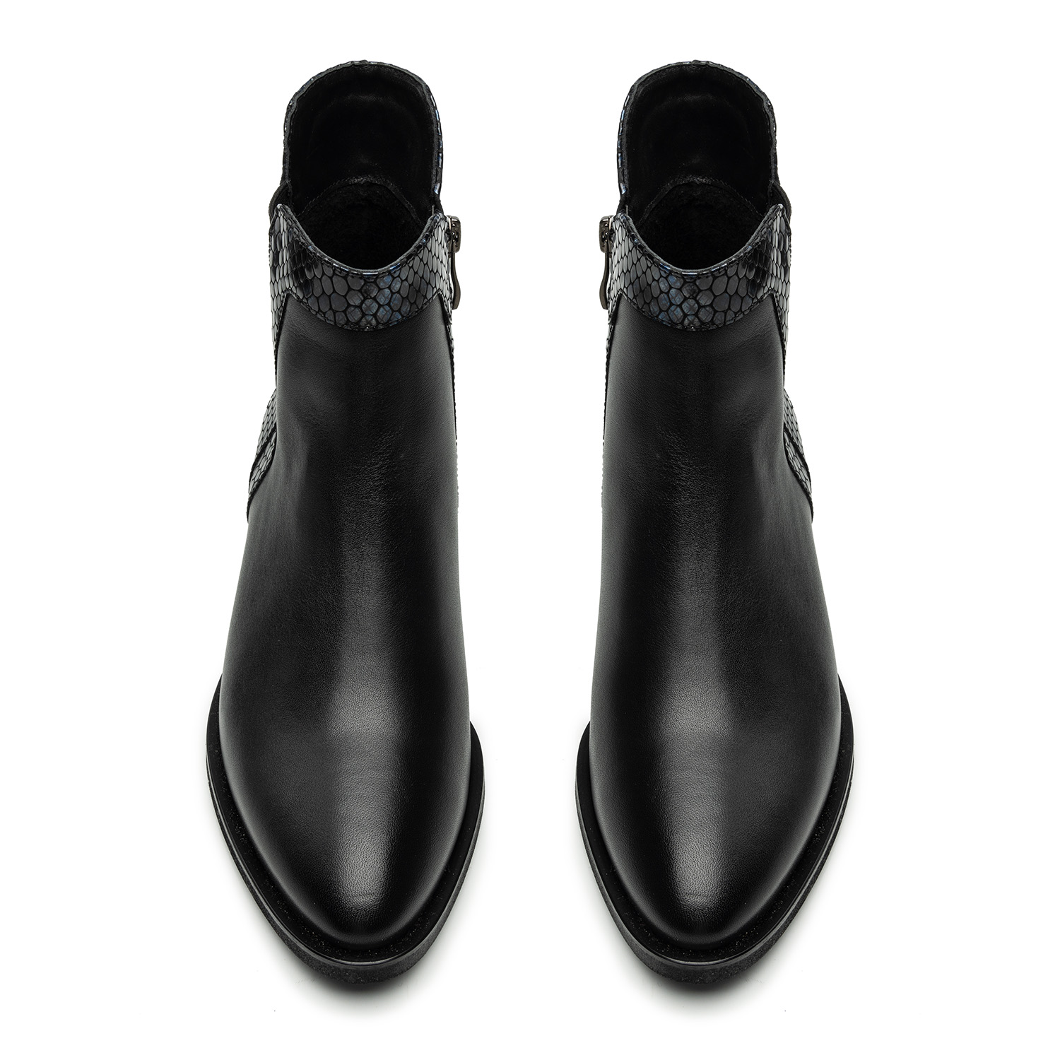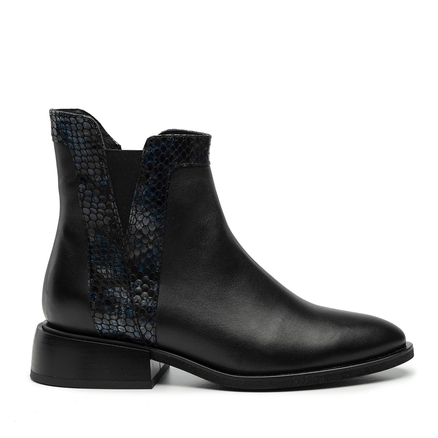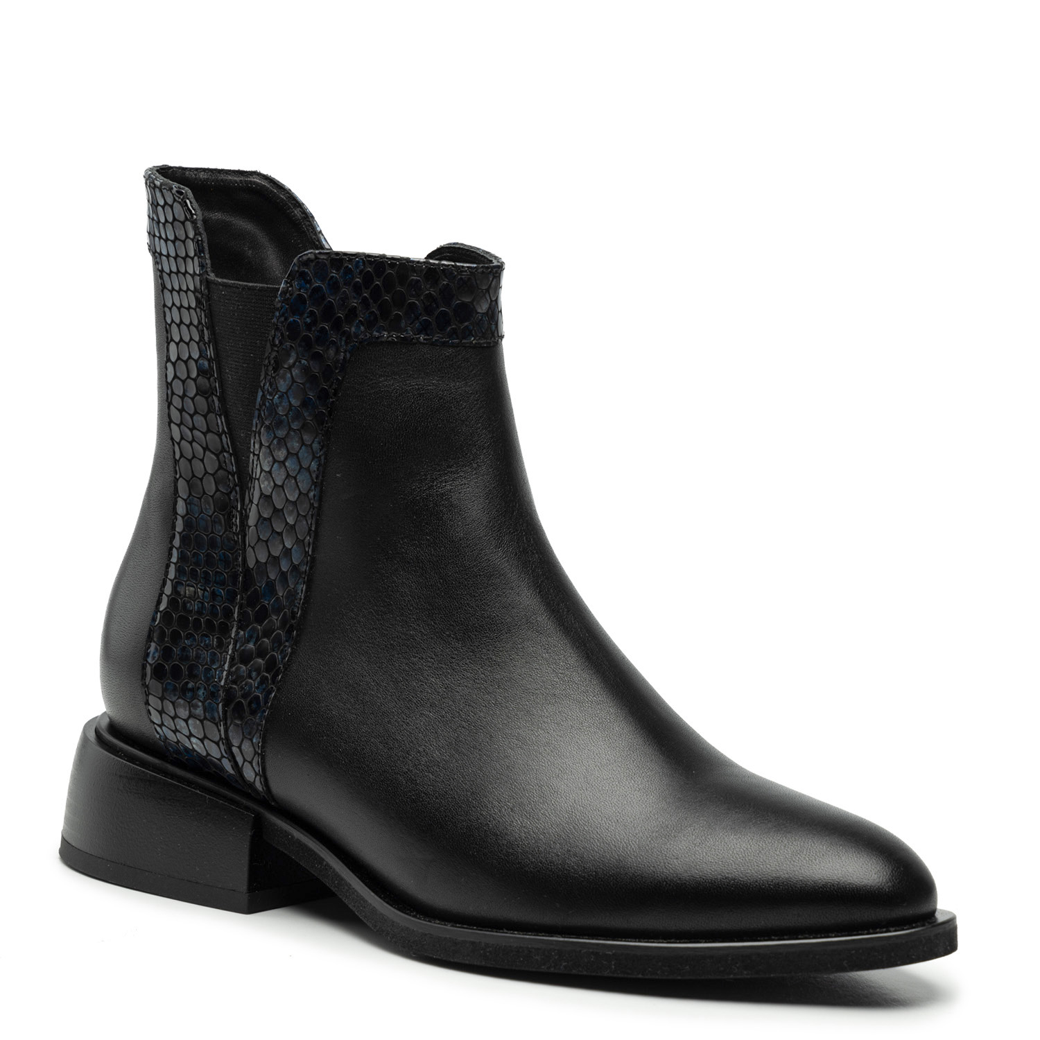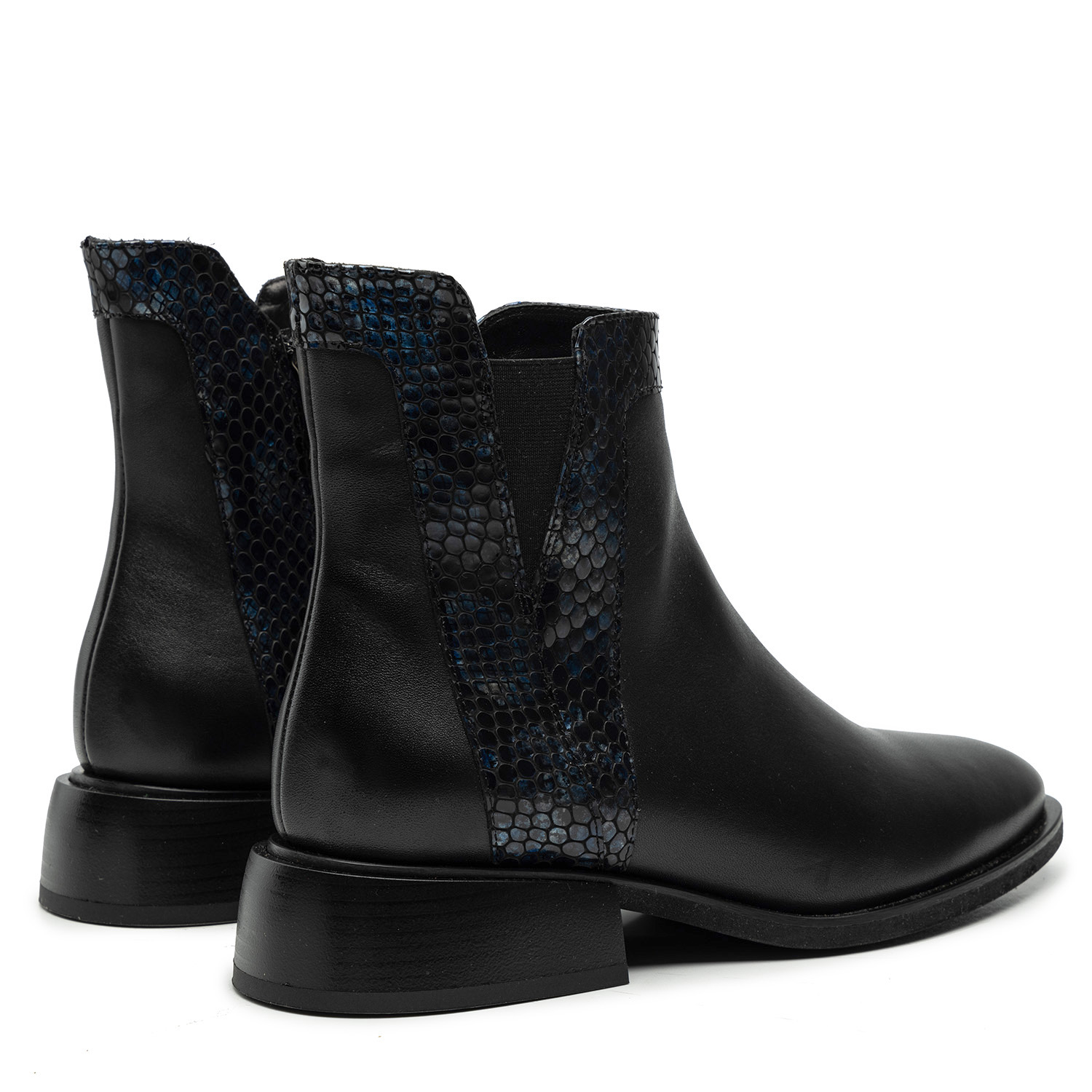 Czarne skórzane botki sztyblety przyciągają uwagę starannie przemyślanymi detalami. Wykonane są ręcznie z włoskiej skóry naturalnej i zostały wzbogacone o połyskujące na niebiesko wstawki imitujące skórę węża, które tworzą grę faktur.