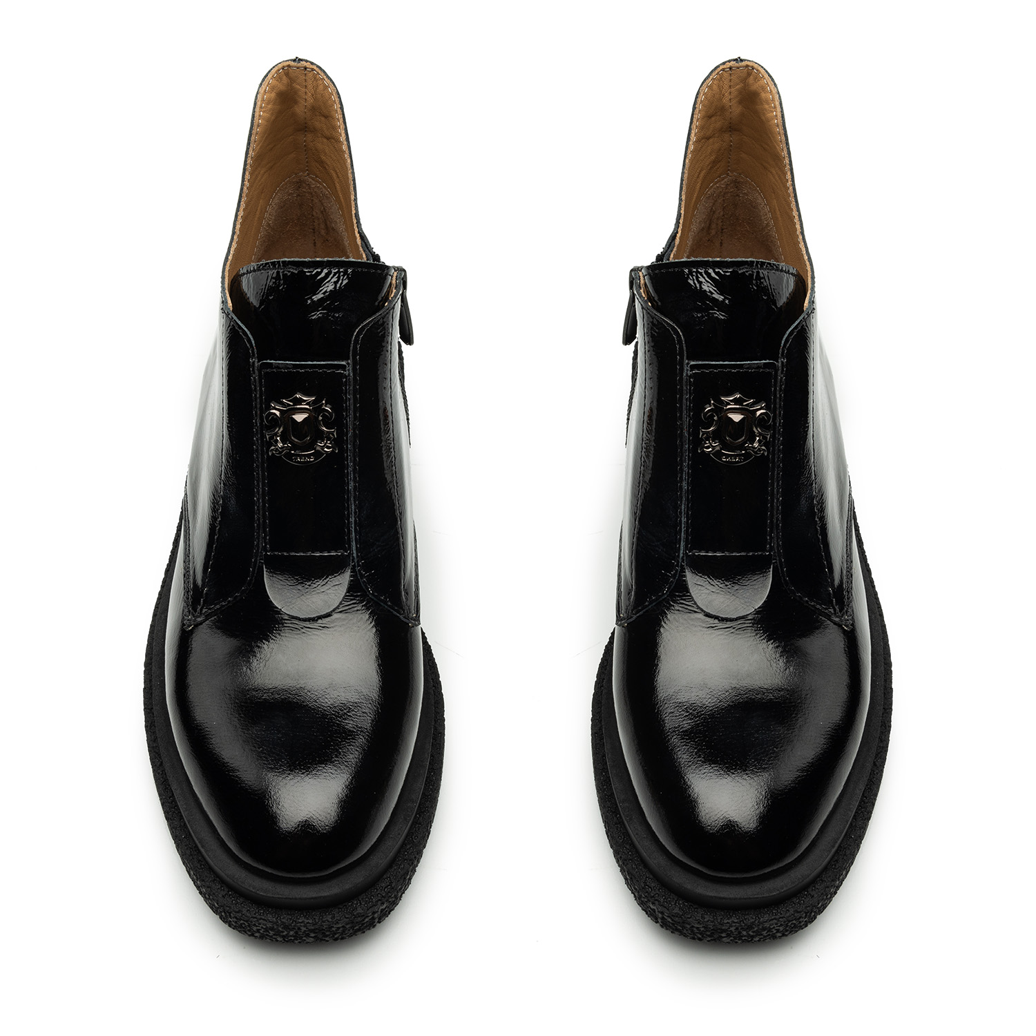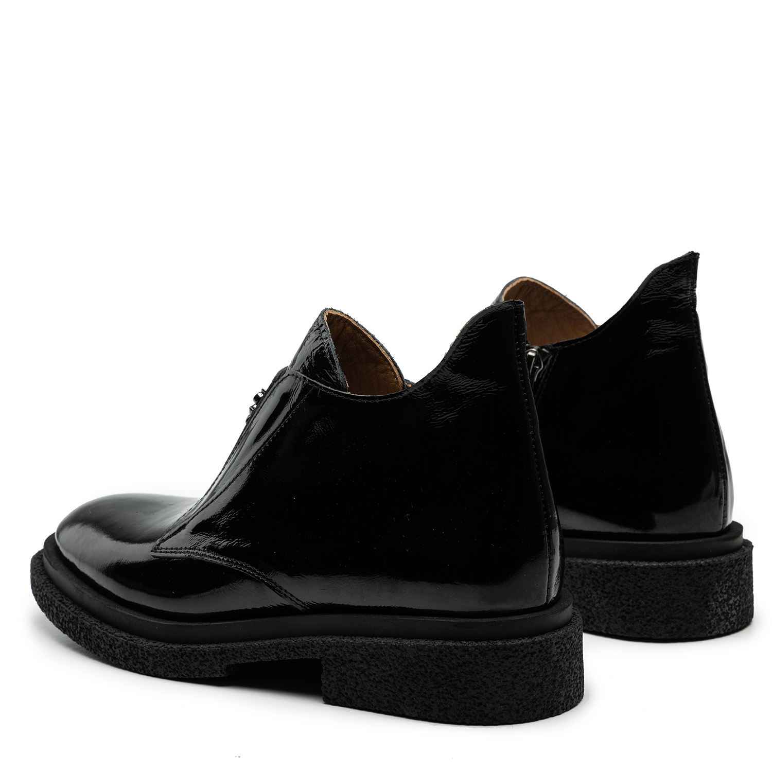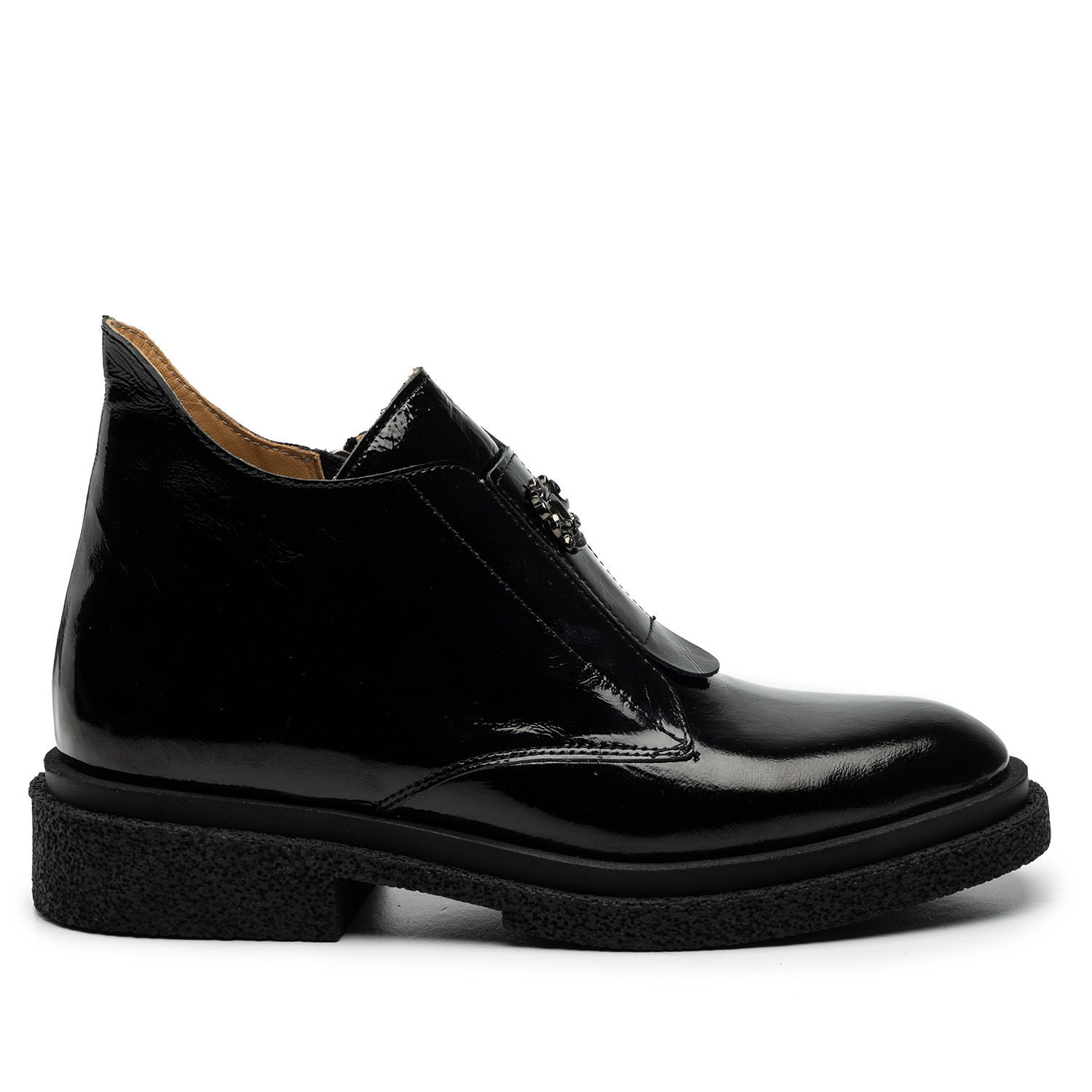 Botki damskie o wysokości całkowitej 15,8 cm wyróżniają się minimalistycznym designem. Gładka lśniąca cholewka została urozmaicona biżuteryjną ozdobą i dyskretnymi przeszyciami. Wsuwana konstrukcja z suwakiem ułatwia zakładanie, a chropowata płaska podeszwa zintegrowana z obcasem o wysokości 3,9 cm zapewnia dobrą przyczepność i stabilność. Wnętrze oraz wkładka wykonane są z miękkiej skóry naturalnej, gwarantują wyjątkowy komfort użytkowania.