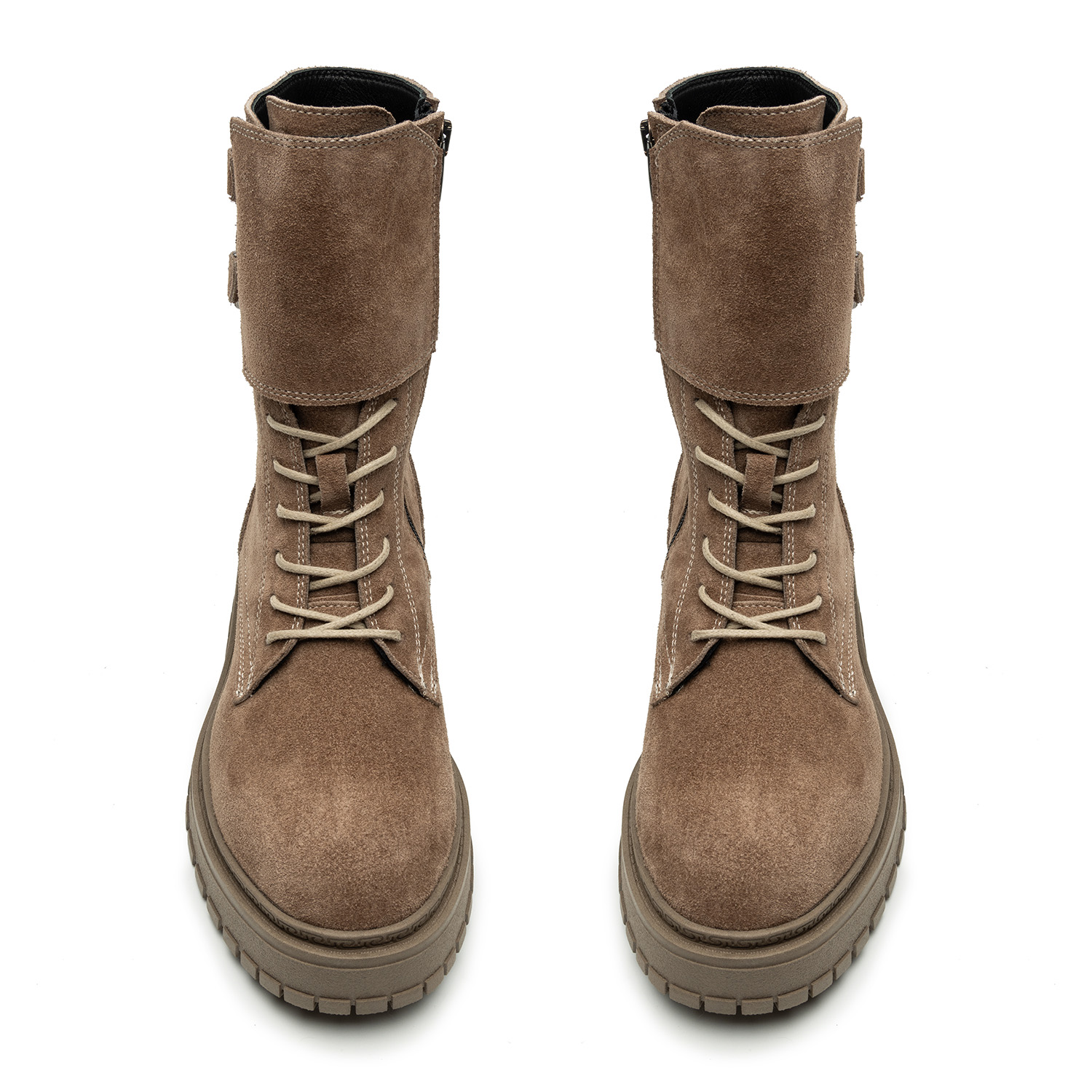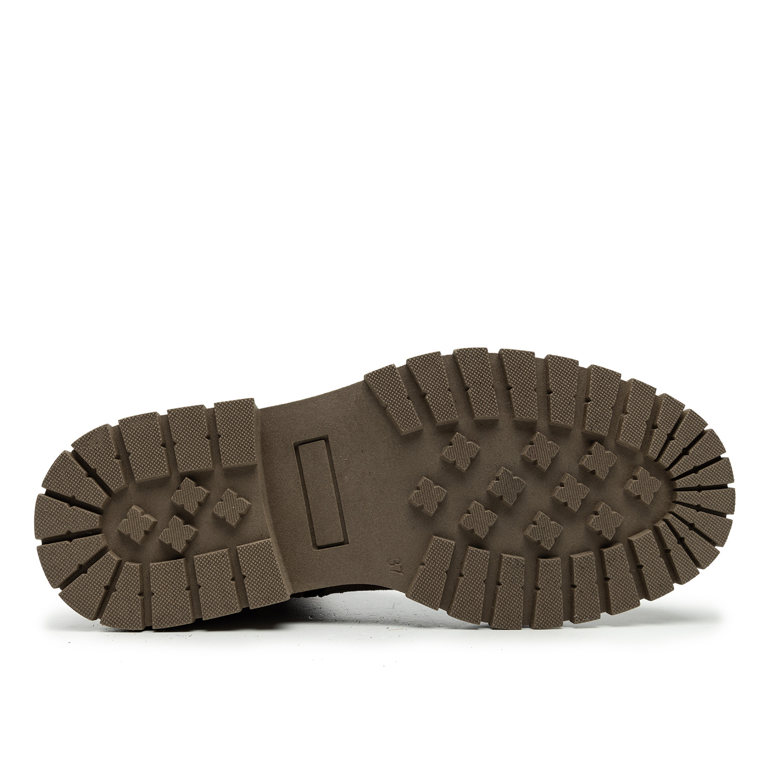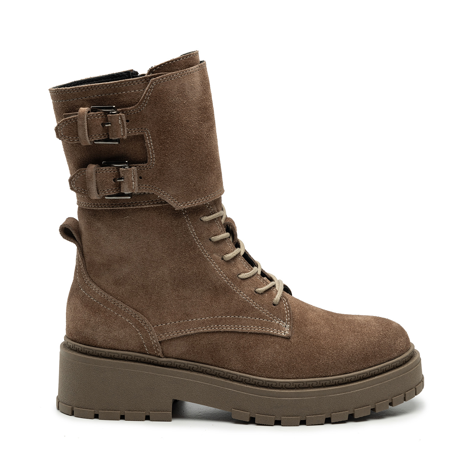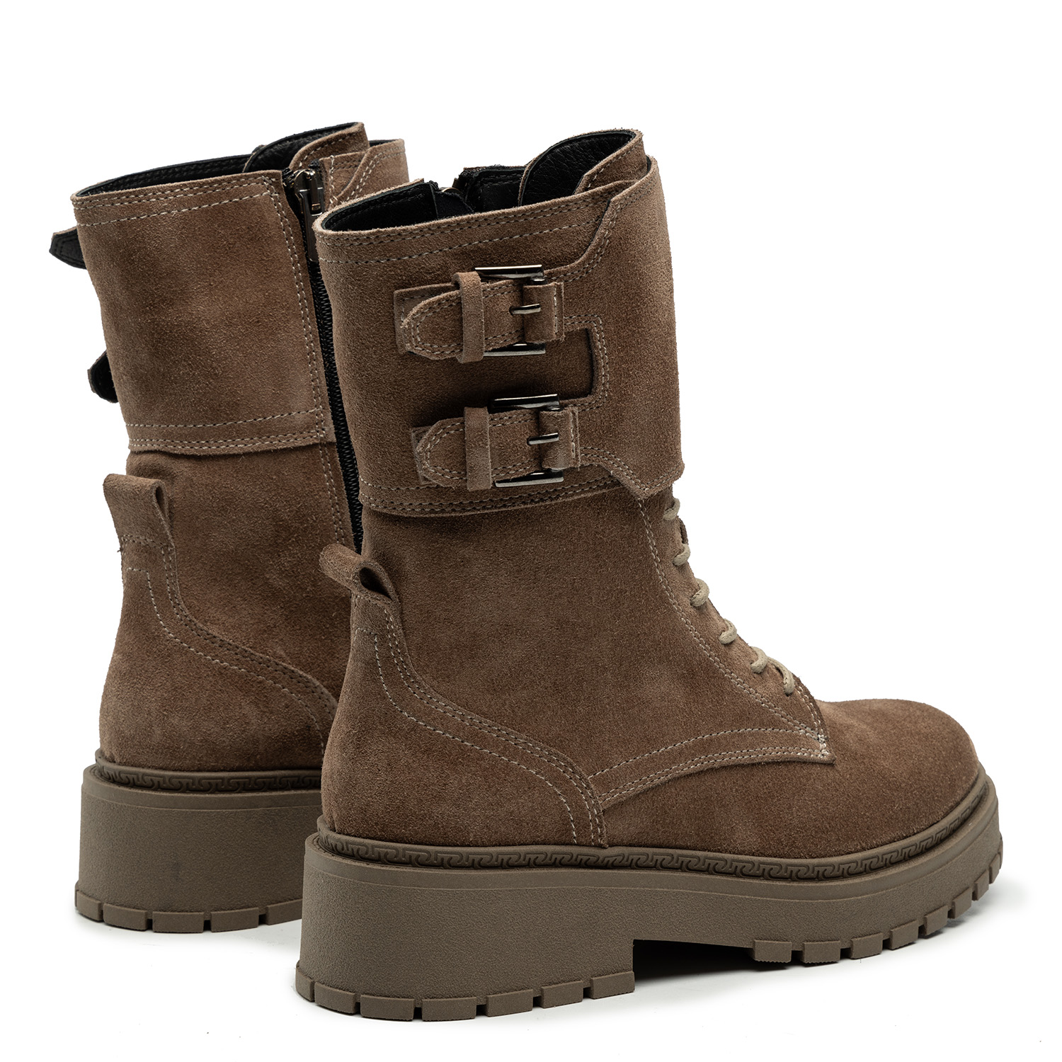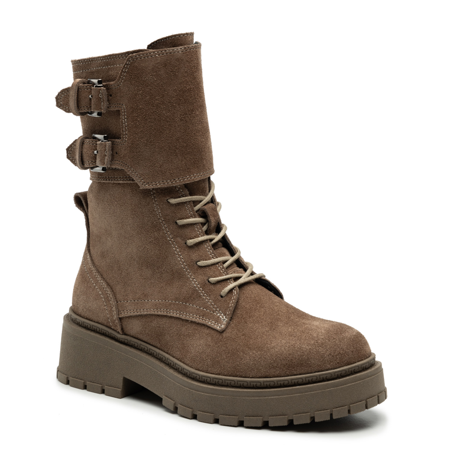Brązowe botki damskie z zamszu to model wyposażony w praktyczny system podwójnego zapięcia – klasyczne sznurowanie oraz boczny zamek błyskawiczny. Charakterystyczne klamry na cholewce nadają butom modny charakter. Komfortowa podeszwa typu track sole z wysokogatunkowego tworzywa gwarantuje przyczepność i stabilność podczas chodzenia, a zintegrowany z nią obcas mierzący 4,5 cm lekko podnosi sylwetkę. Wysokość całkowita tego modelu wynosi 24 cm.