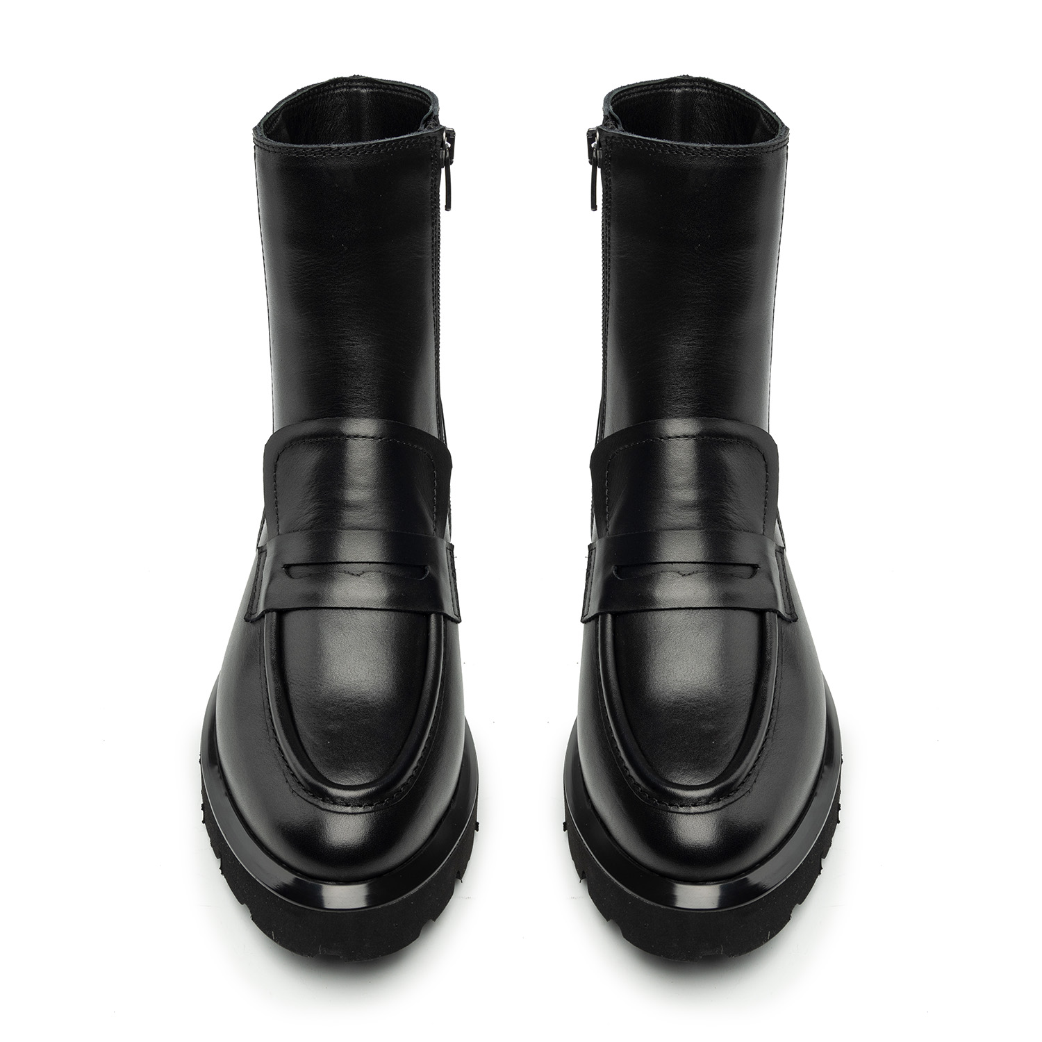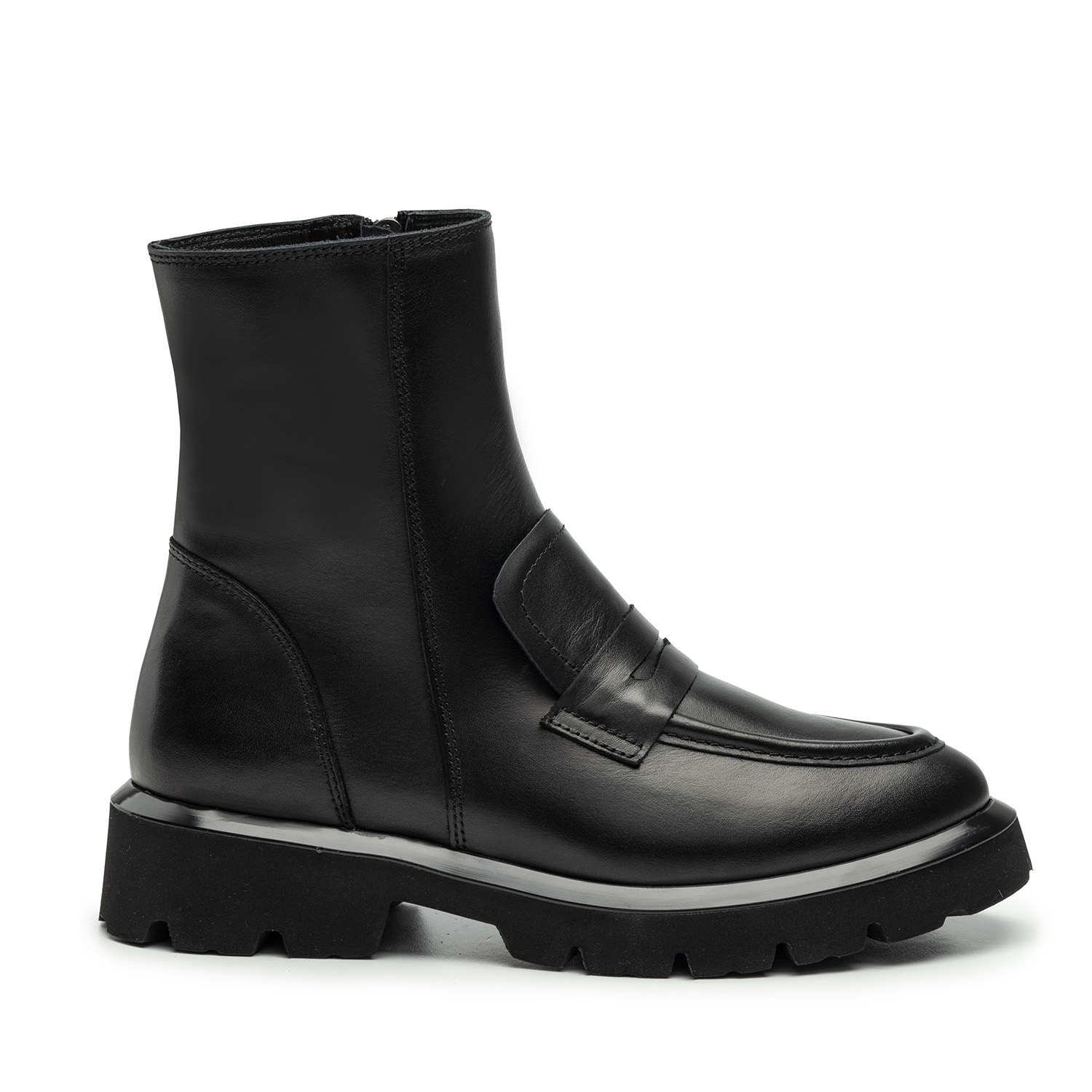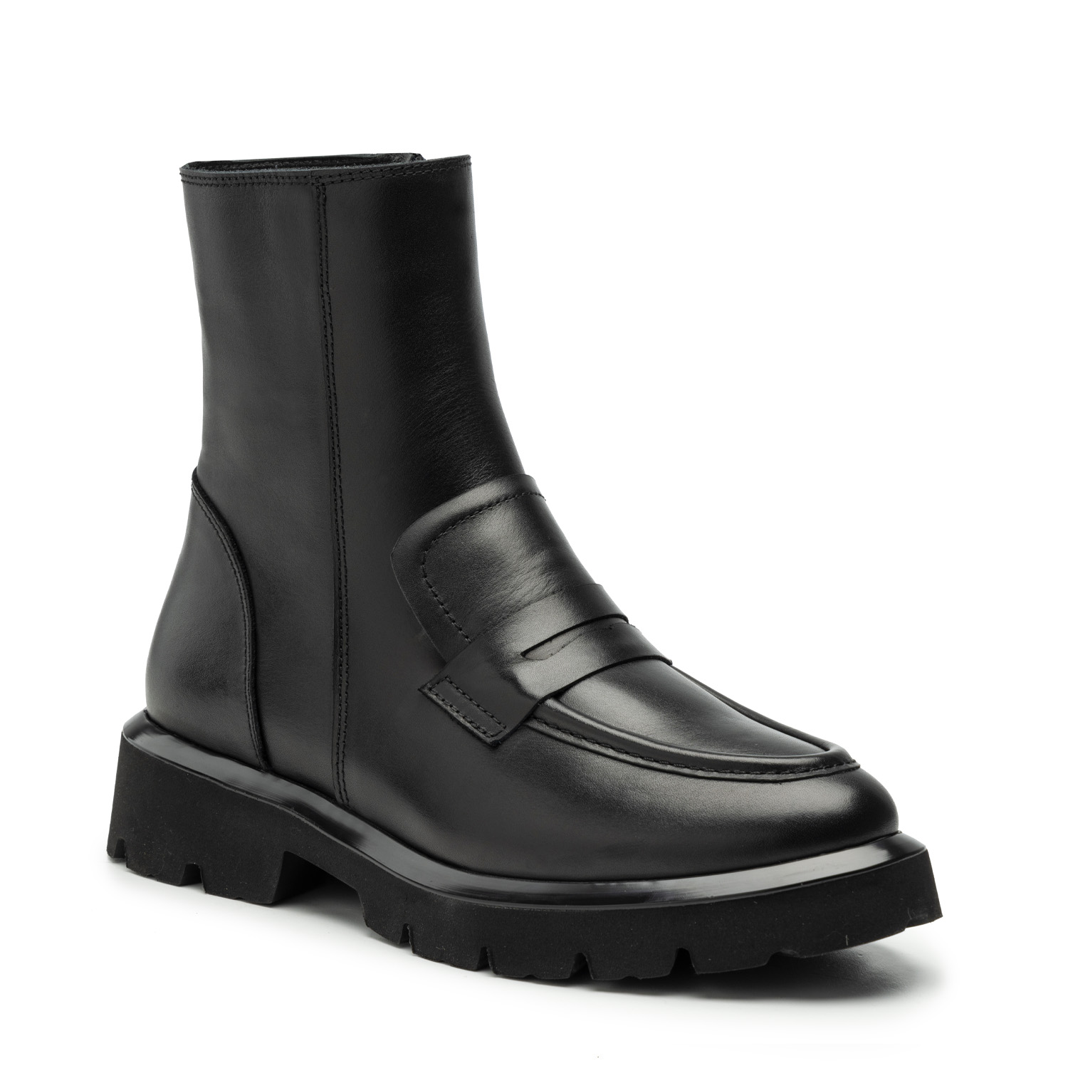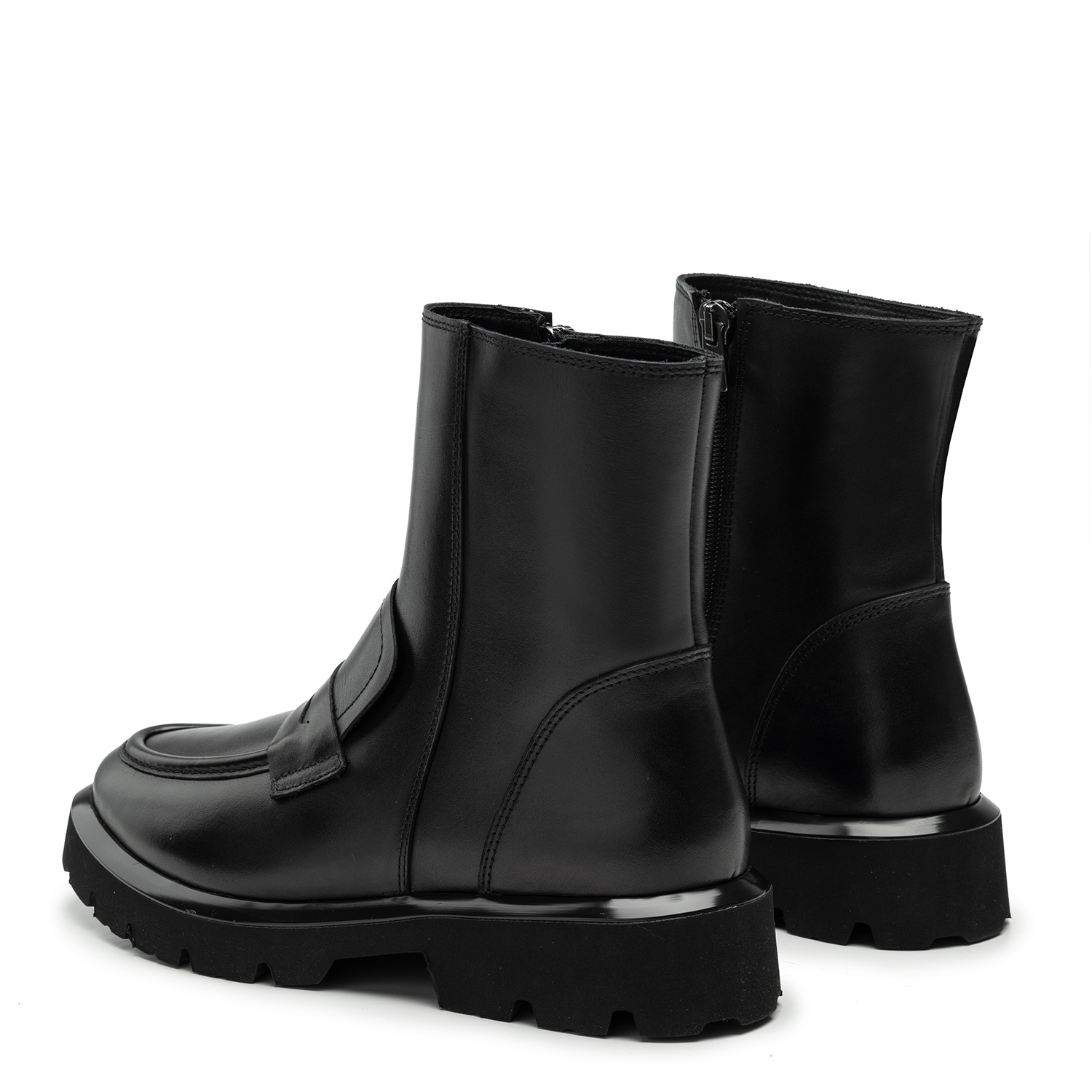 Czarne botki to ręcznie robione w Polsce obuwie damskie z wysokiej jakości skóry licowej. Ich fason łączy klasyczną konstrukcję mokasyn z modnym chunkydesignem. Dzięki czemu buty wyglądają nowocześnie i sprawdzą się w każdych warunkach – założysz je na co dzień, do biura i na miasto.