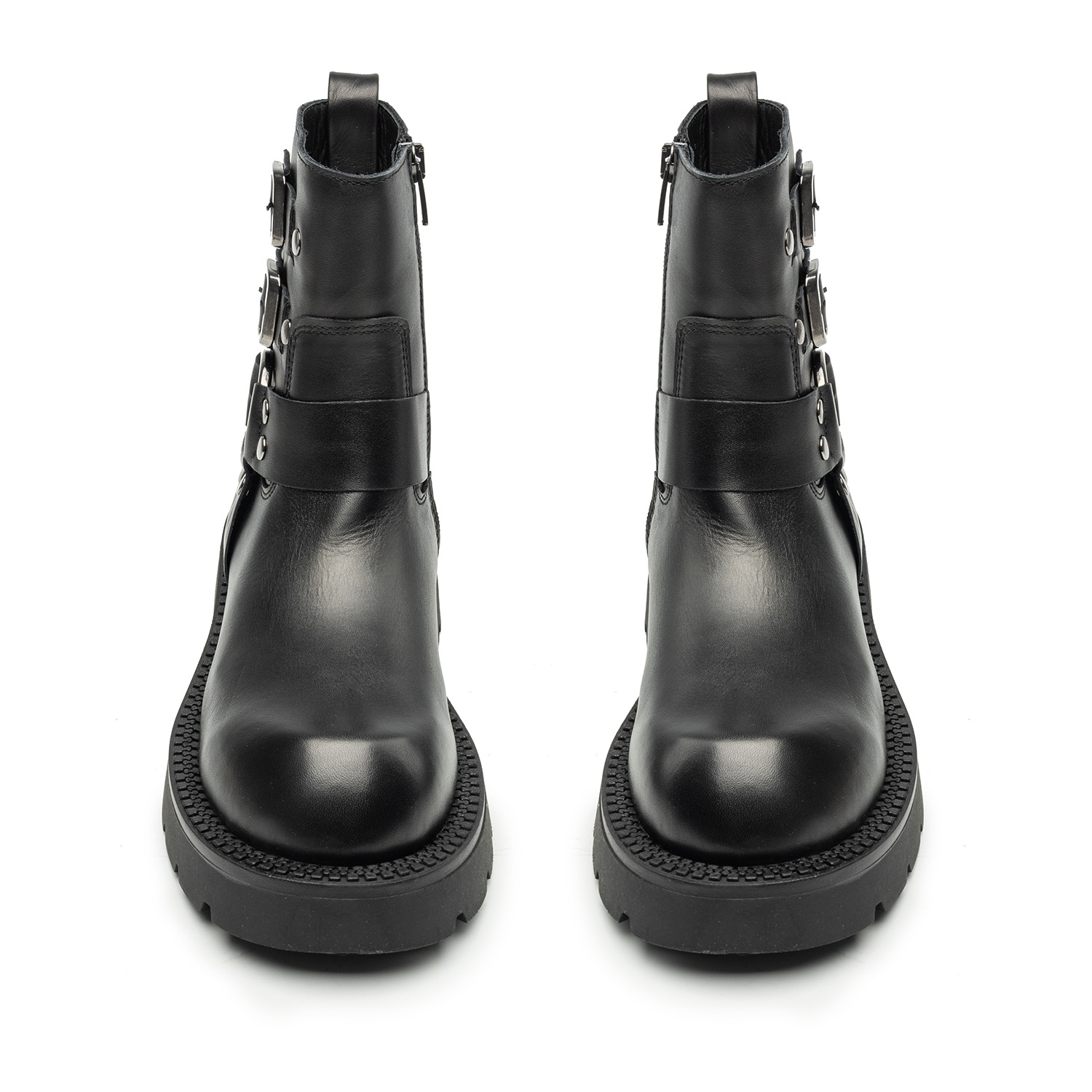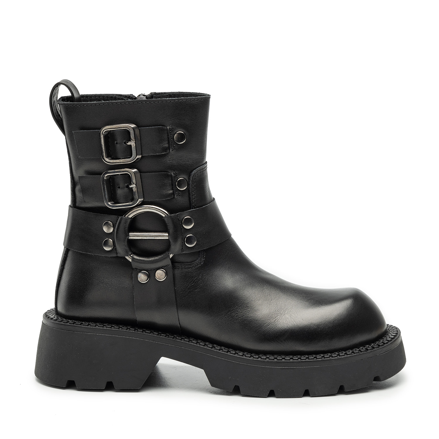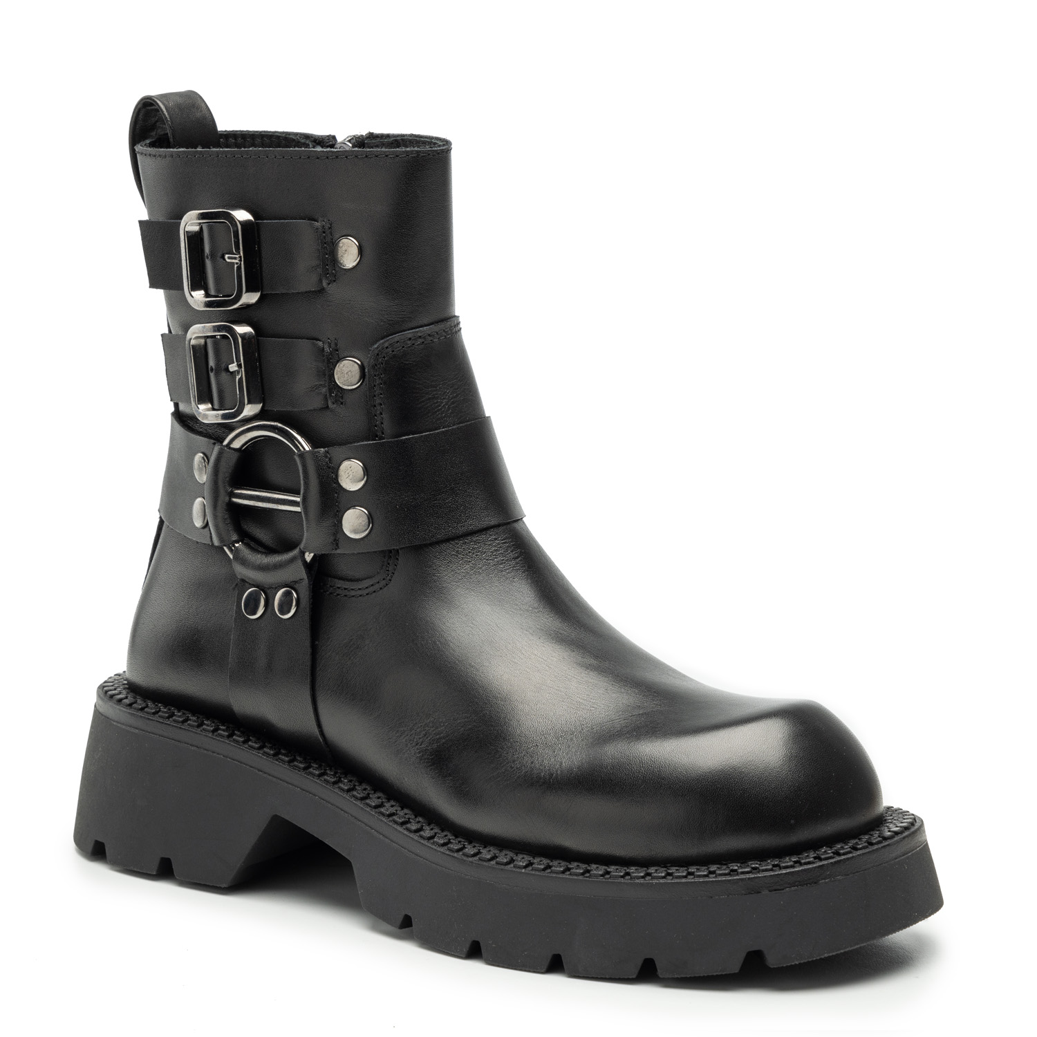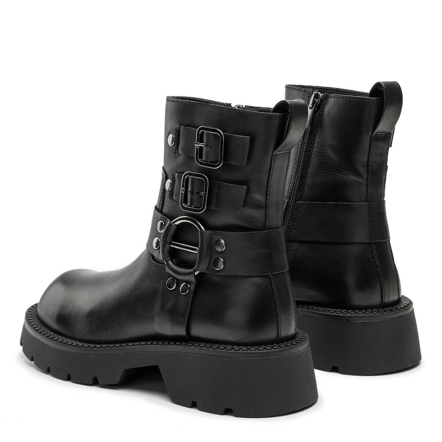 Skórzane czarne botki damskie z klamrami mają solidną konstrukcję, mocną podeszwę i surowy, wyrazisty design nawiązujący do stylu klasycznych bikerów. Zostały wykonane z wysokiej jakości skóry naturalnej i ozdobione metalowymi detalami w postaci klamer, kółek i metalowych nap, które podkreślają ich motocyklowy rodowód.