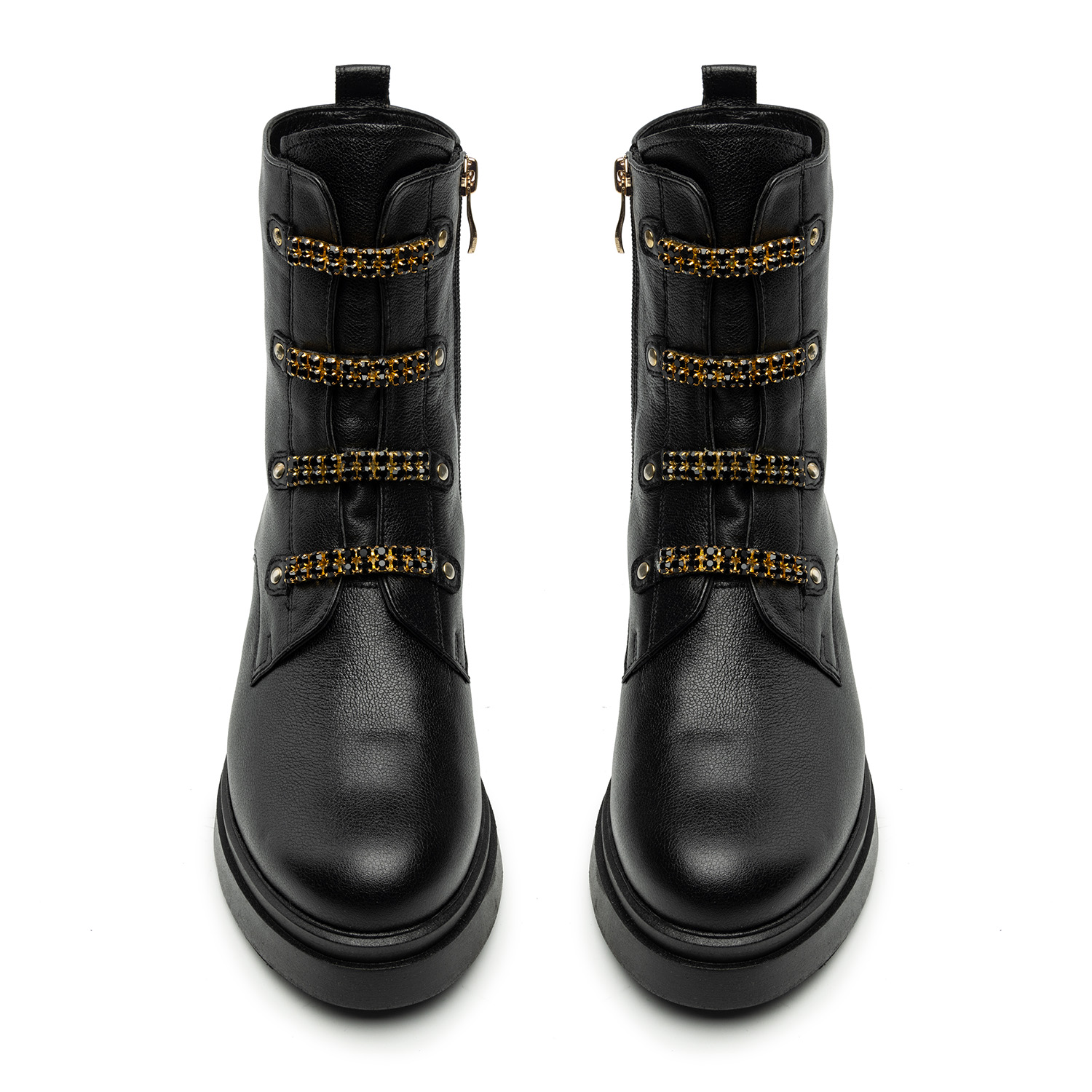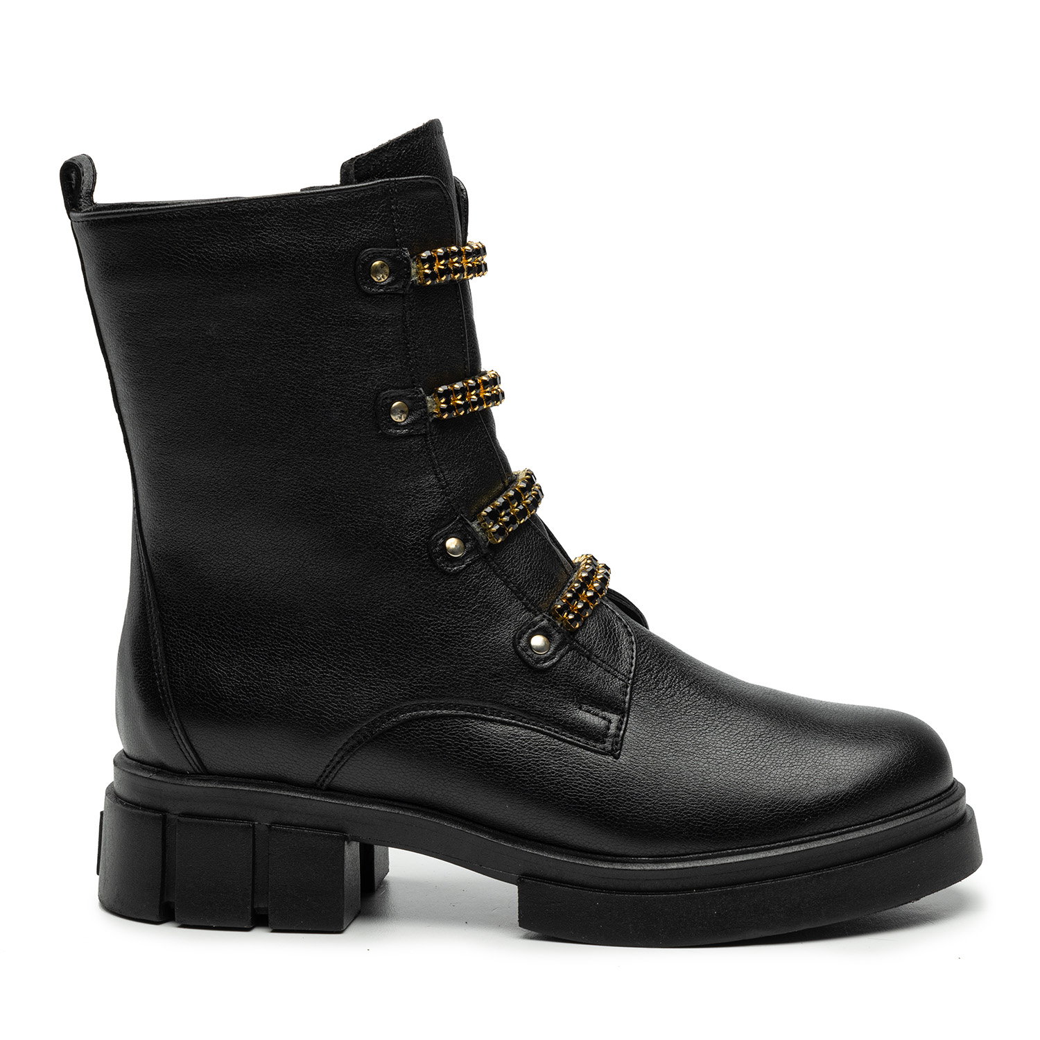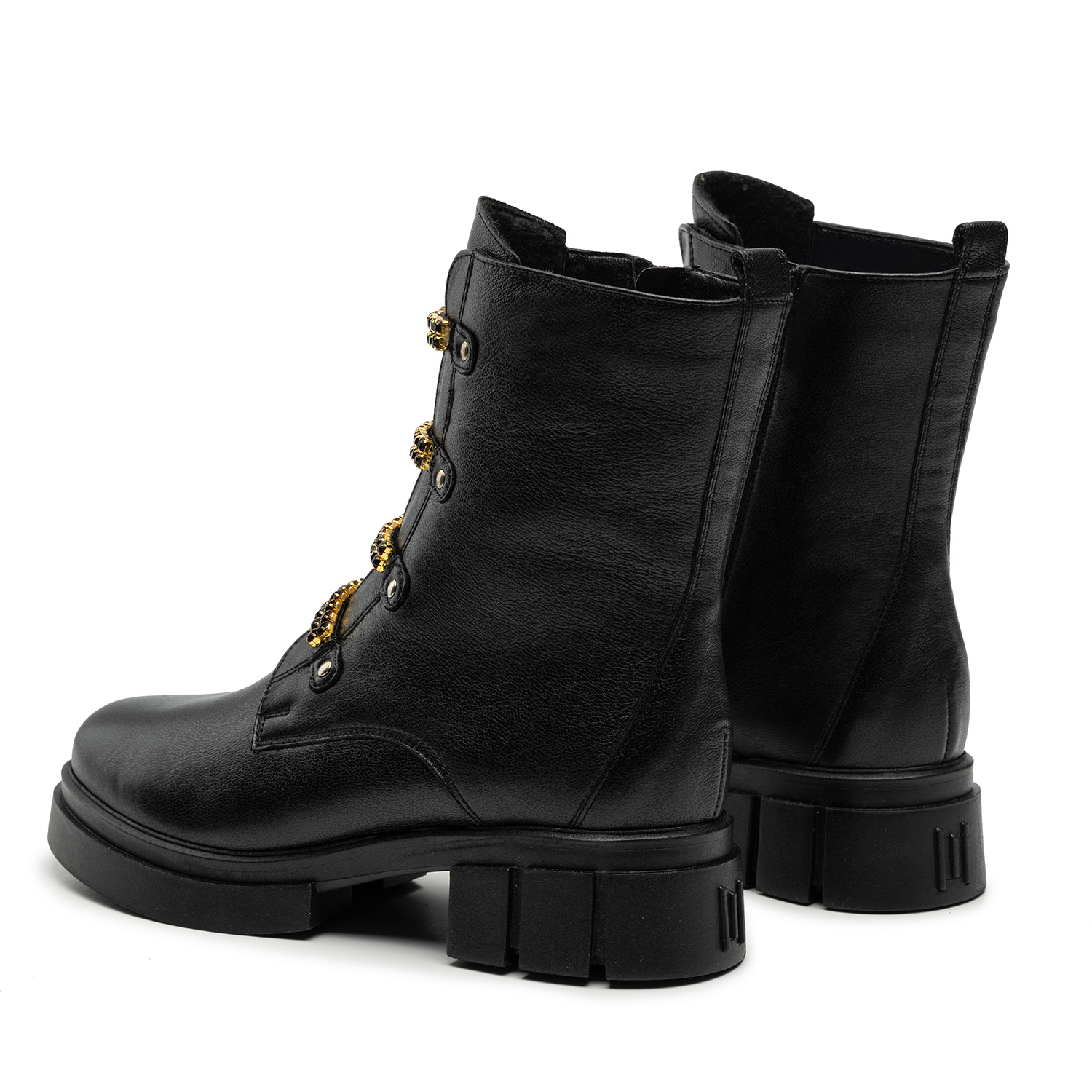 Wyprodukowane w Polsce workery damskie wykonane ze skóry naturalnej o gładkim licu. Cholewka z ociepleniem udekorowana paskami wysadzanymi złoto-czarnymi cyrkoniami i złotymi napami. Botki damskie ze skóry mają okrągły nosek, zapięcie na suwak błyskawiczny i masywną podeszwę z wyraźnie zarysowanym bieżnikiem – świetnie sprawdzą się jesienią i zimą, chroniąc przed niską temperaturą. Wysokość całkowita tego modelu wynosi 22,3 cm, a tęgość G 1/2.