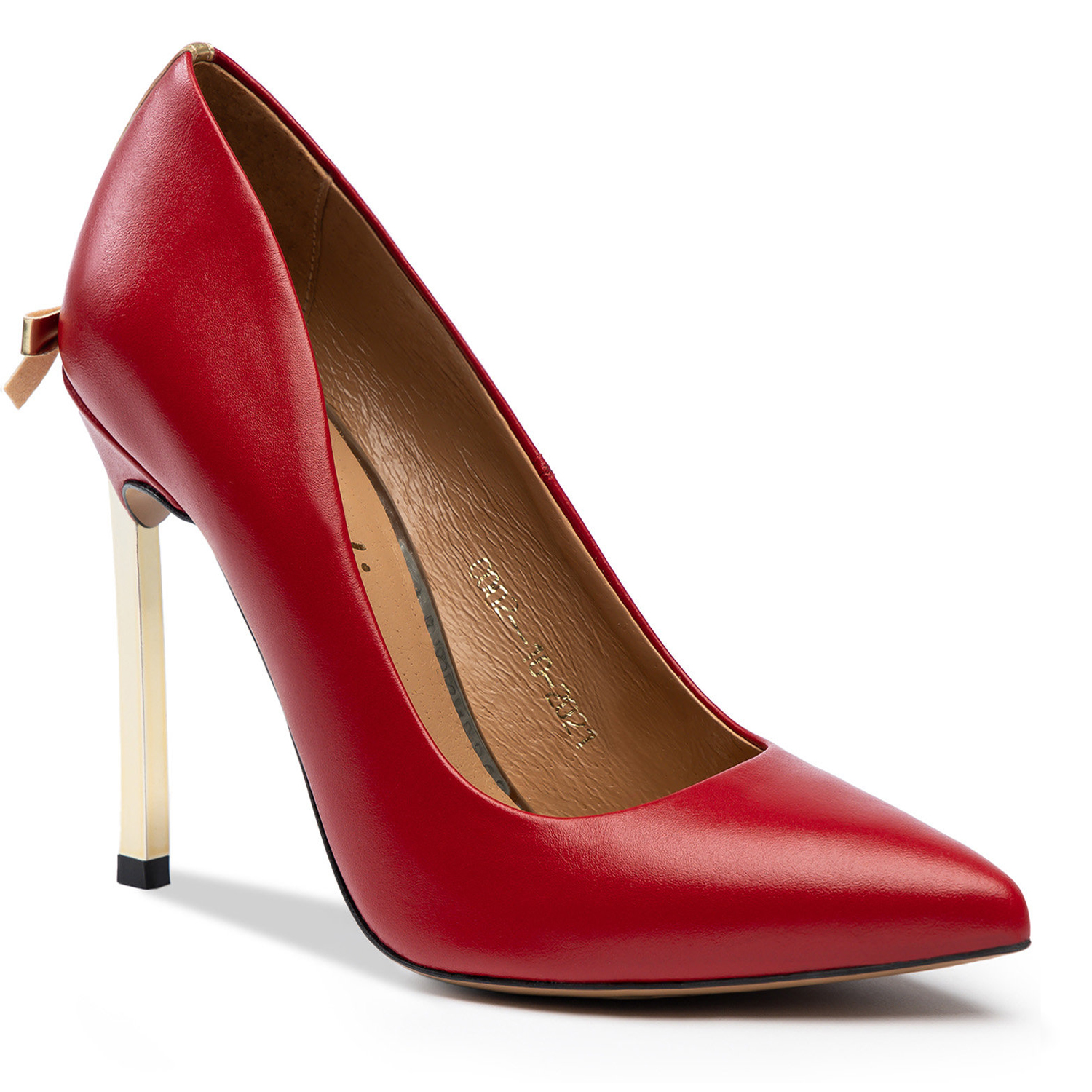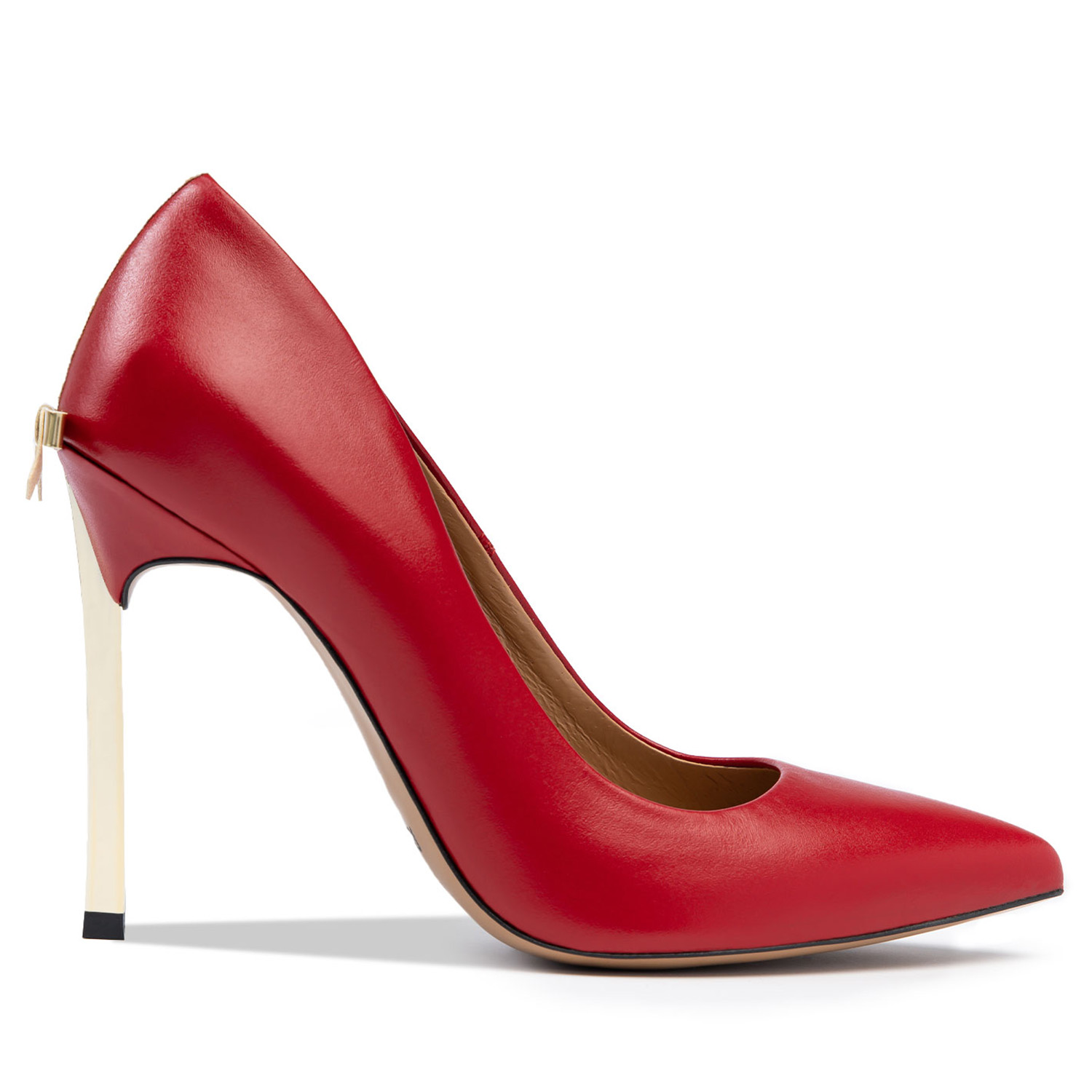 Opinie o Czerwone szpilki z kokardą na złotym obcasie 10 cm ze skóry naturalnej - Czerwony Lico/Złoty