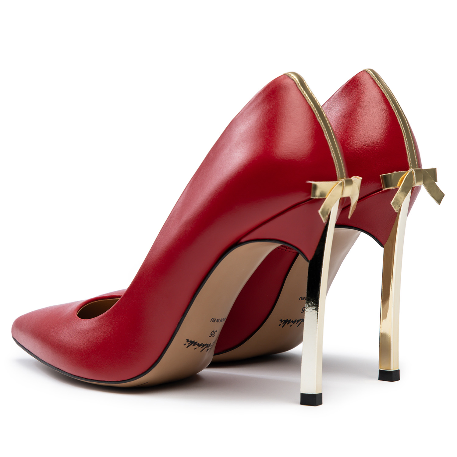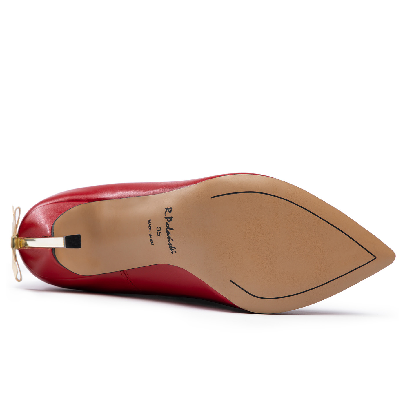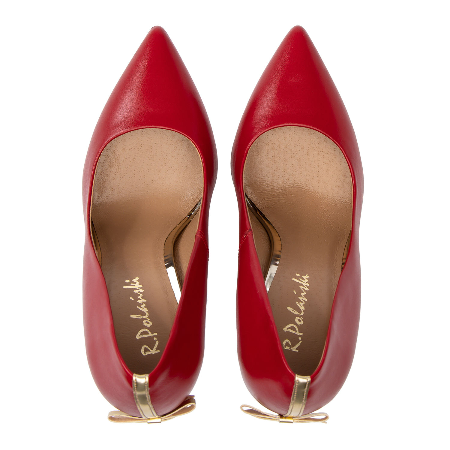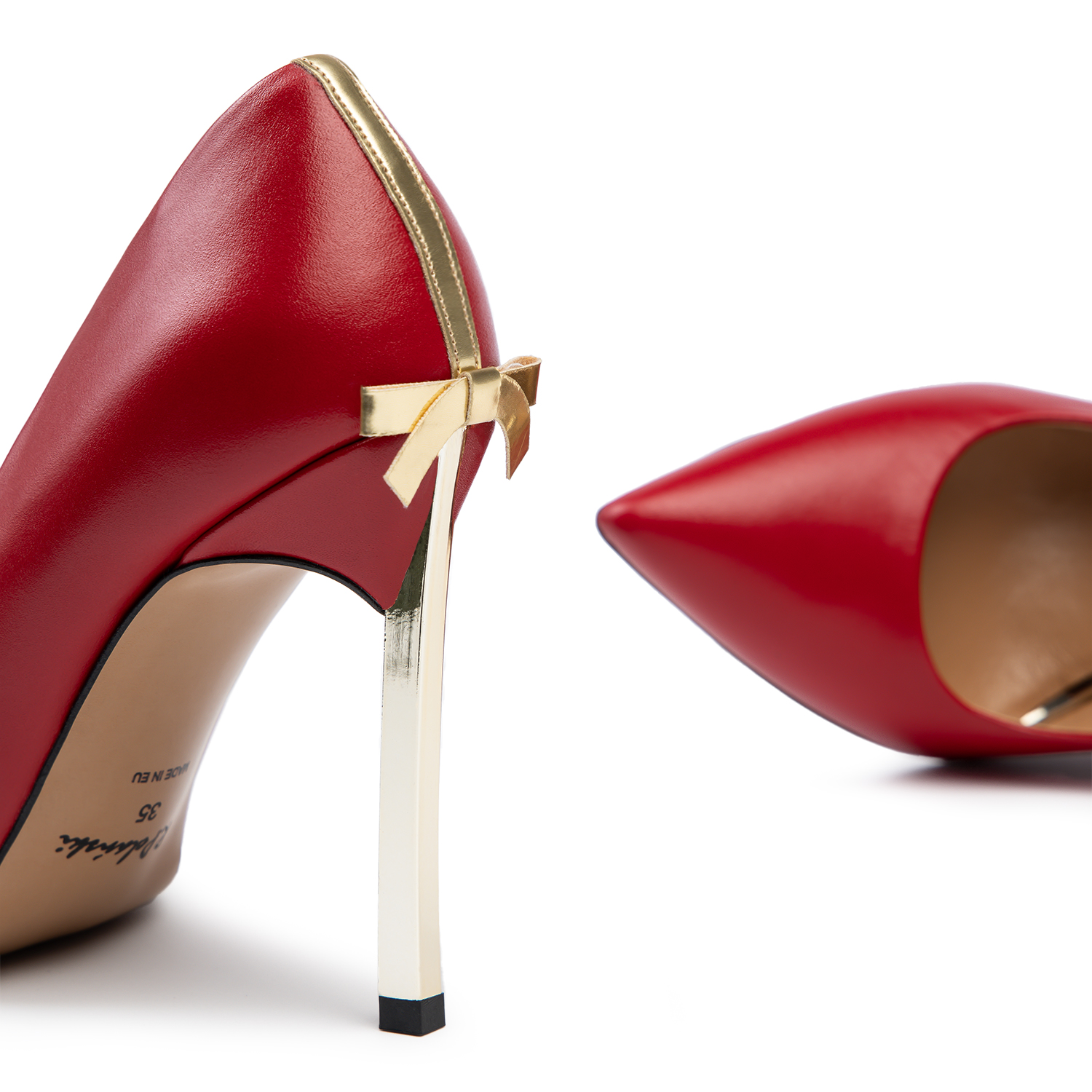 Czerwone szpilki z kokardą na złotym obcasie 10 cm ze skóry naturalnej