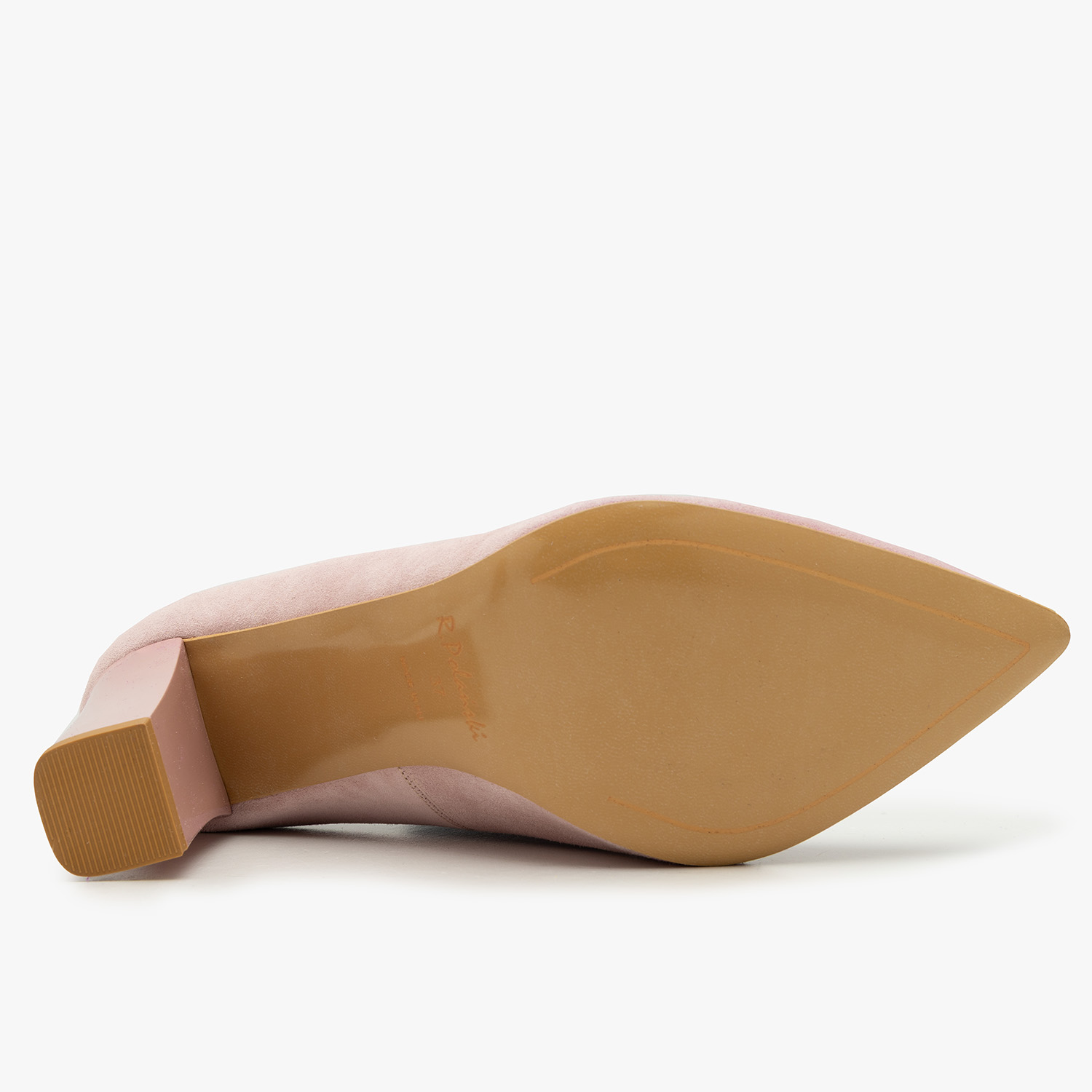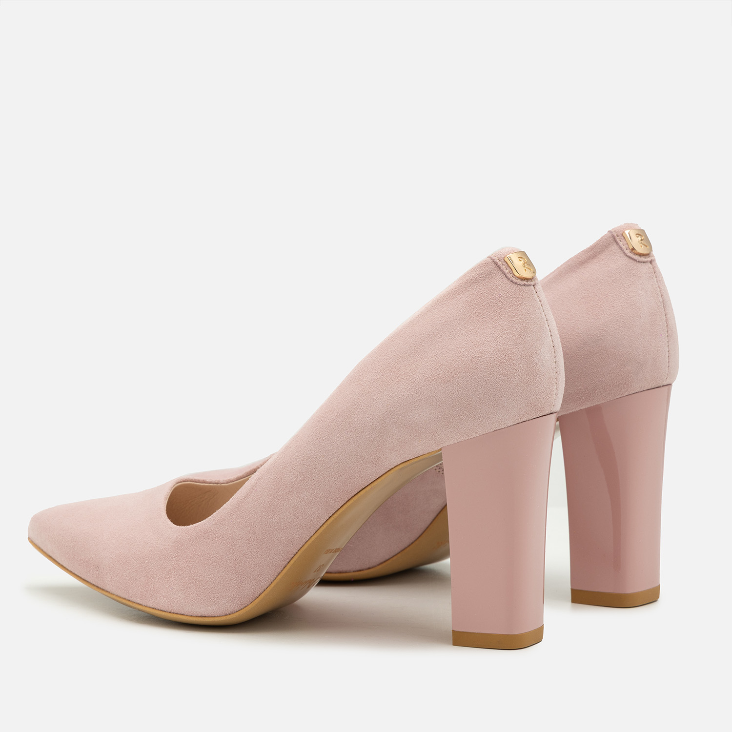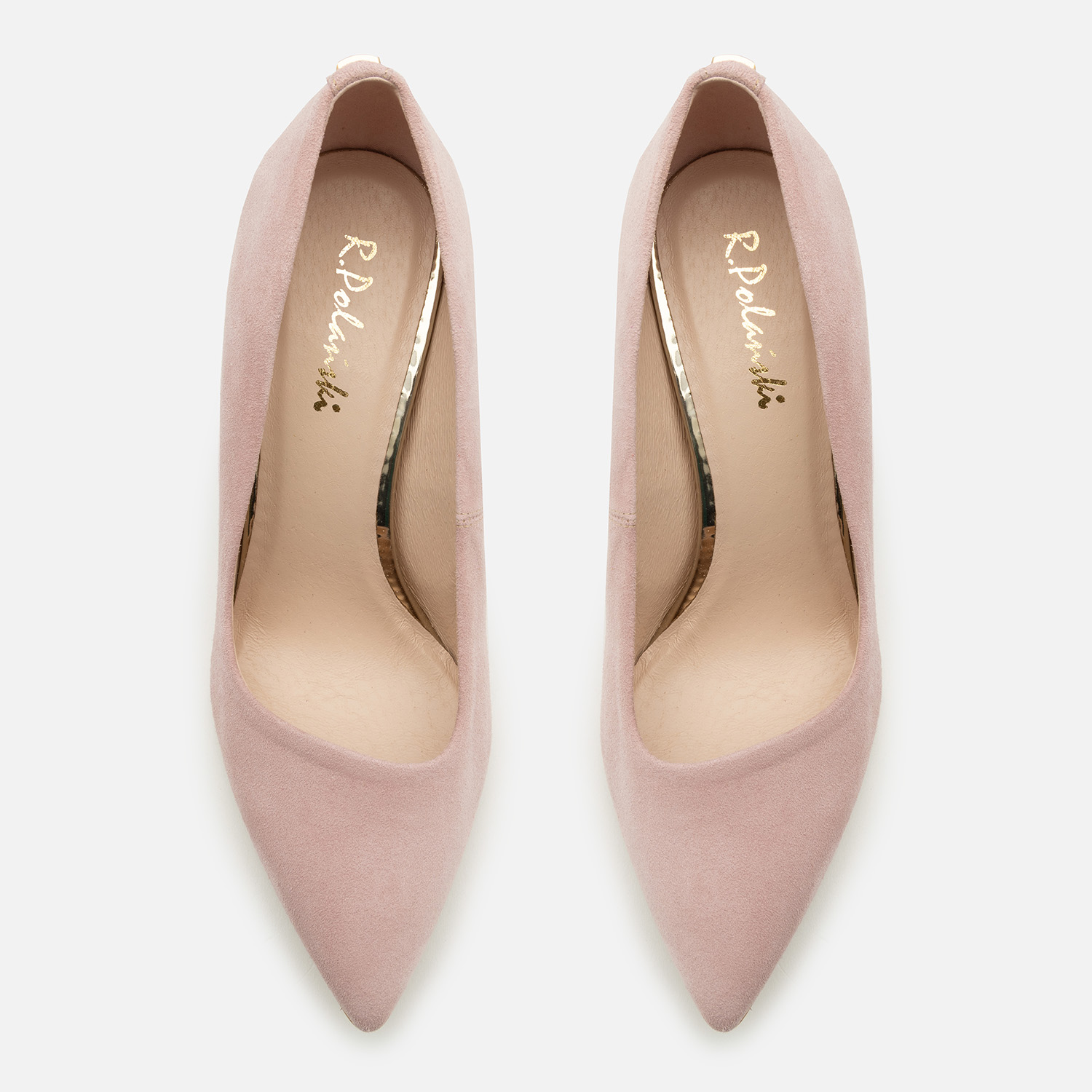 Czółenka zostały wykonane z naturalnej skóry zamszowej. Wnętrze oraz wkładka również zrobione są ze skóry, dzięki czemu Twoje stopy będą miały zapewnioną odpowiednią termoregulację. Dzięki zastosowaniu obcasów w formie słupków o wysokości 8,5 cm — buty zapewniają komfort użytkowania nawet podczas całonocnej zabawy. Dodatkowo obcasy z wysokogatunkowego tworzywa pozwalają zachować odpowiednie ułożenie i stabilność stopy. Ten model posiada dodatkowy element ozdoby w postaci złotej litery R na pięcie.