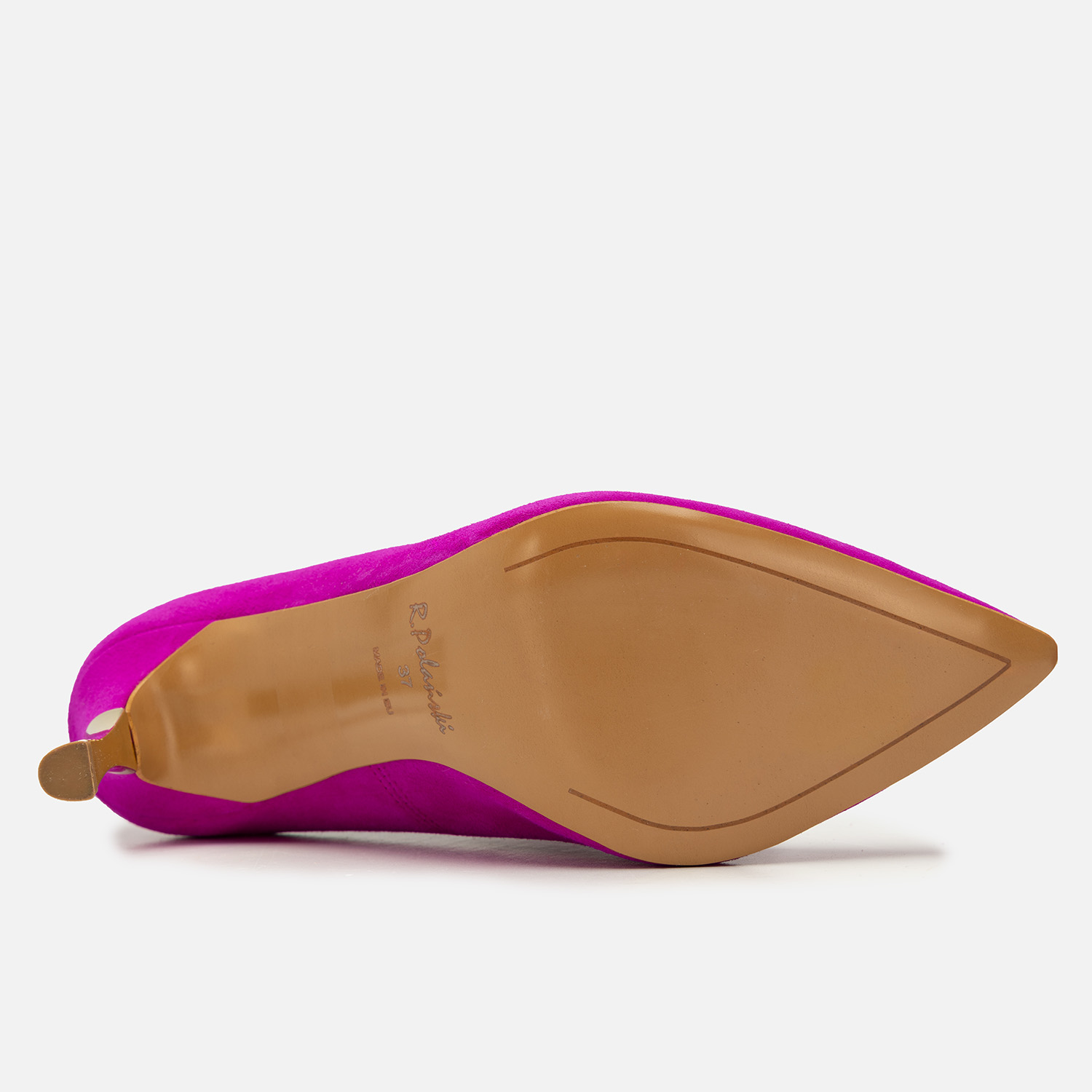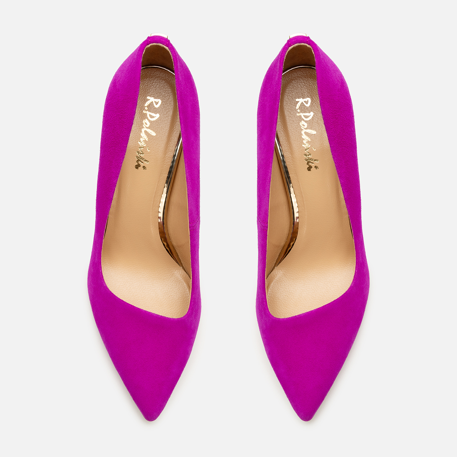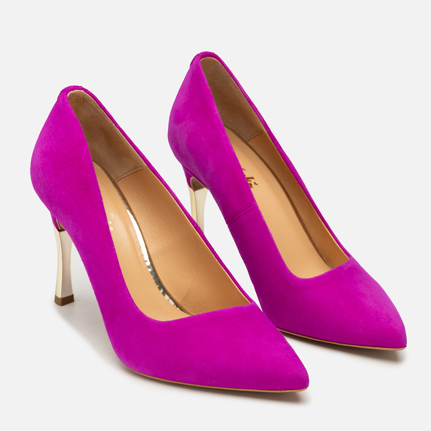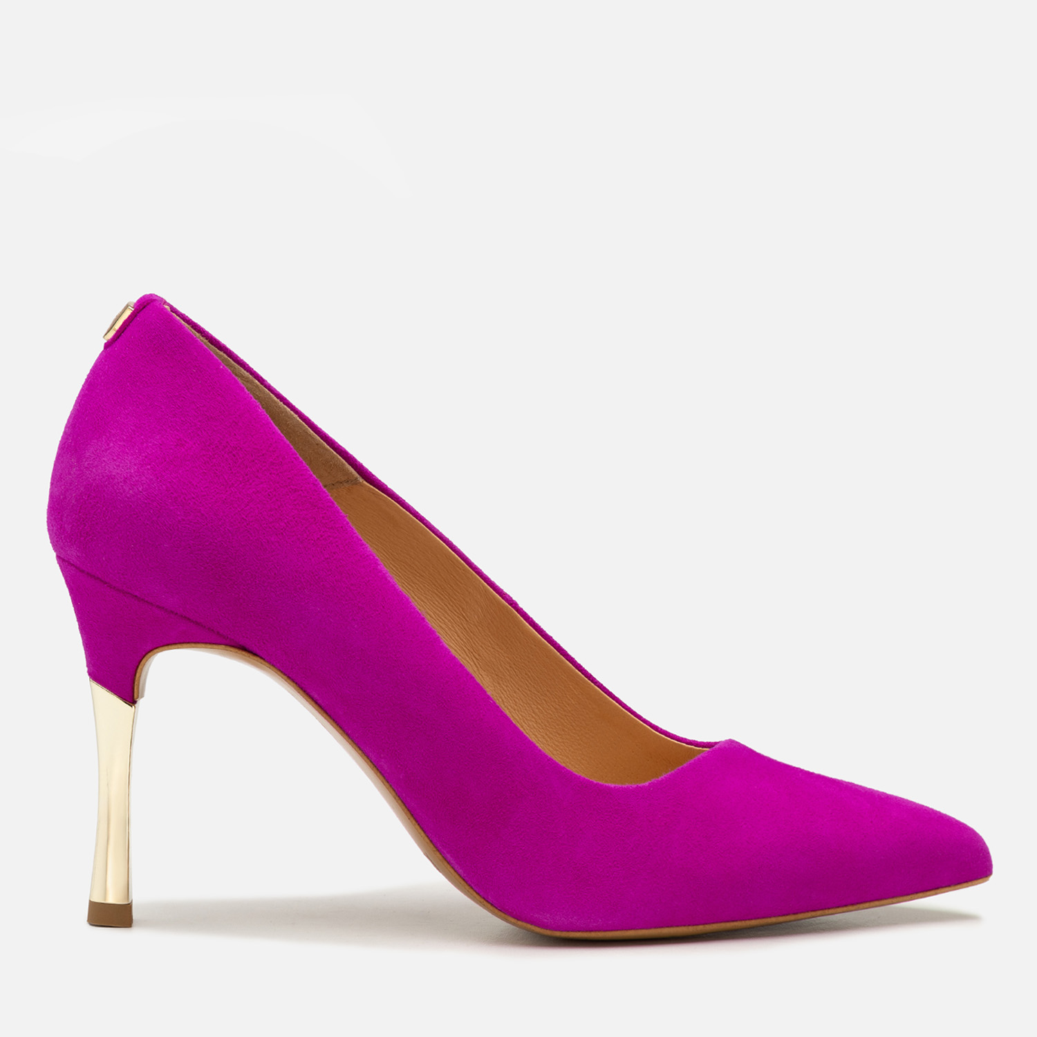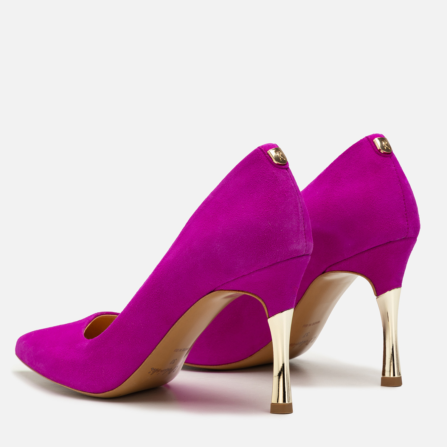 Do czego pasują szpilki w kolorze fuksji? Możliwości stylizacyjnych jest bez liku, jednak by uzyskać naprawdę zjawiskowy efekt, warto zadbać, by czółenka były wykonane z materiałów wysokiej jakości i starannie wykończone — tak jak w przypadku tego modelu. Naturalna skóra zamszowa została wybarwiona na wyrazisty odcień, a obcasy pokryto złocistą powłoką. Całość uzupełnia nienaganne szycie i ozdobna, ale subtelna blaszka z logo producenta.
