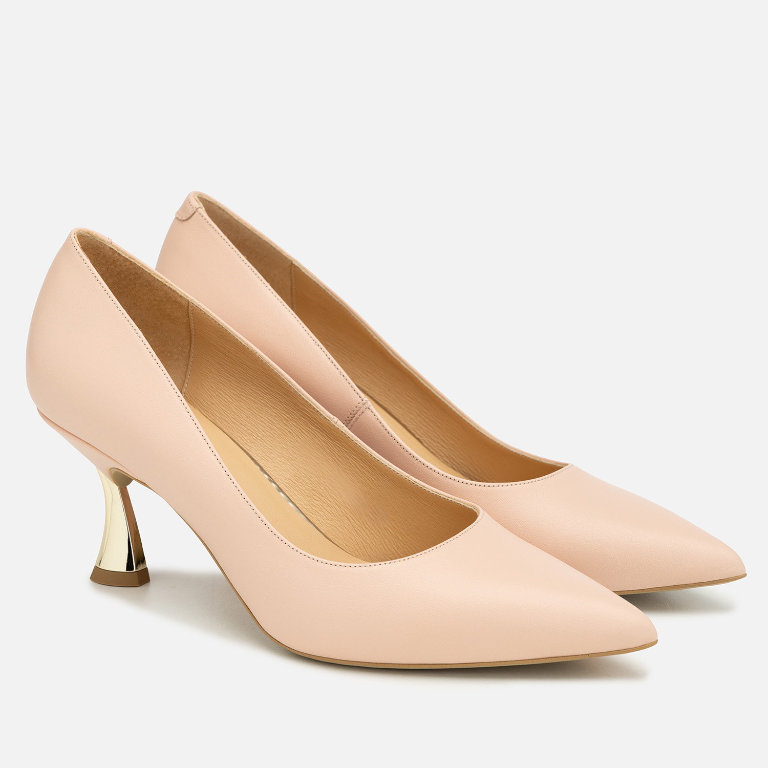 Czółenka damskie w pięknym kolorze, wykonane ze skóry naturalnej (wierzchnia warstwa: wysokogatunkowa skóra, wnętrze i wkładka: również skórzane, miękkie w dotyku i komfortowe podczas noszenia). Te buty to propozycja dla pań, które lubią zyskać wraz z obuwiem kilka dodatkowych centymetrów wzrostu, ale jednocześnie zależy im na dużej stabilności podczas chodzenia i wygodzie. Obcas typu kieliszkowego ma stosunkowo niewielką wysokość - 6,6 cm, a dzięki swojej budowie zapobiega kołysaniu się i utracie równowagi. Warto też dodać, że prezentuje się wyjątkowo atrakcyjnie dzięki zabarwieniu na metaliczne, lustrzane złoto.