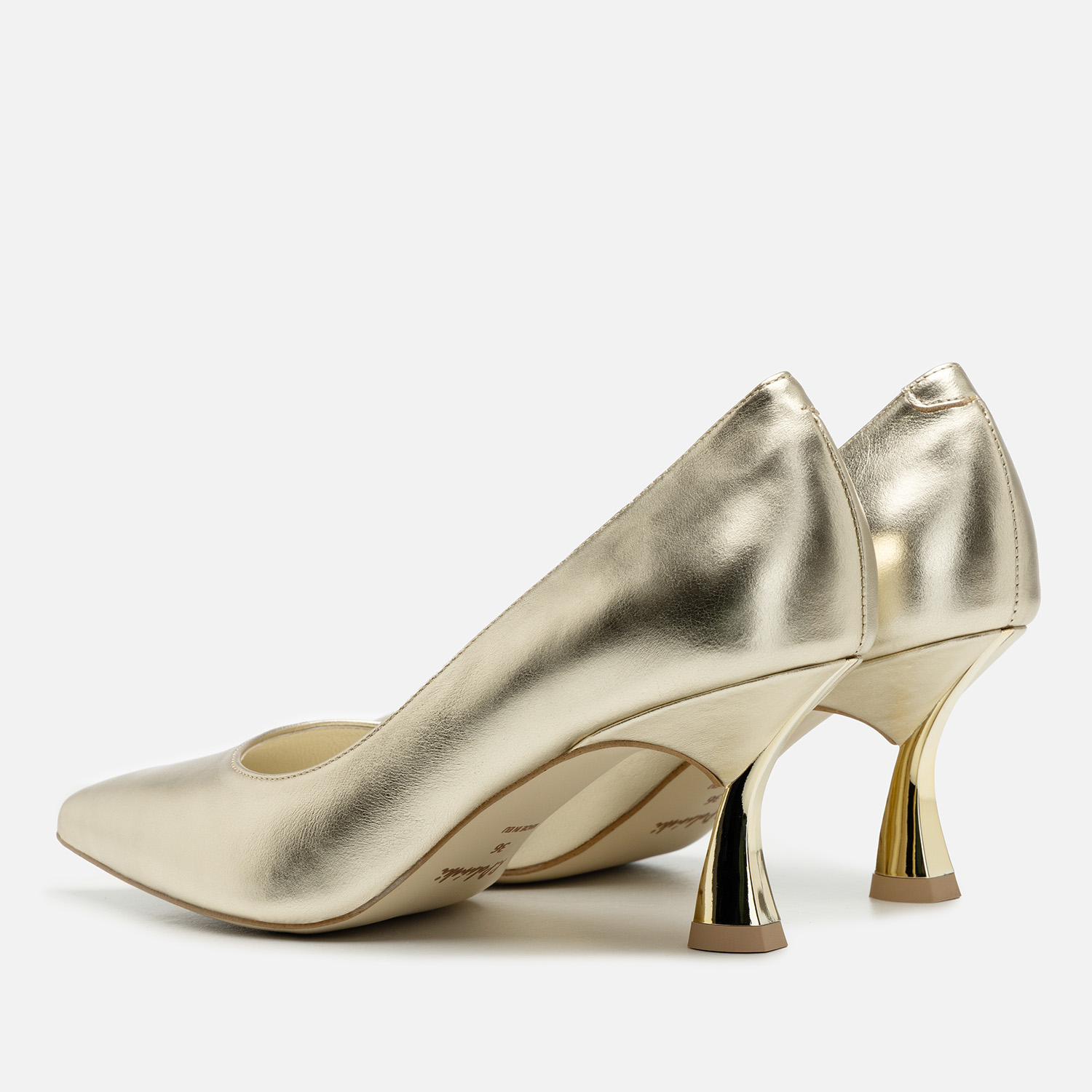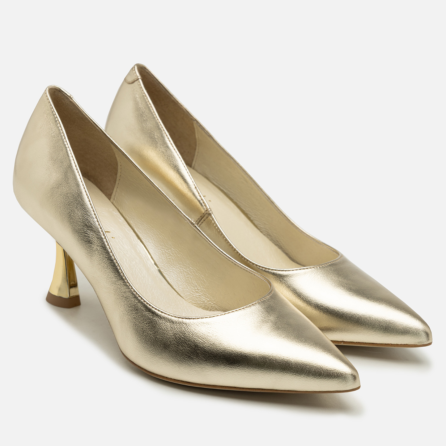 Czółenka damskie w pięknym kolorze, wykonane ze skóry naturalnej (wierzchnia warstwa: wysokogatunkowa skóra, wnętrze i wkładka: również skórzane, miękkie w dotyku i komfortowe podczas noszenia). Te buty to propozycja dla pań, które lubią zyskać wraz z obuwiem kilka dodatkowych centymetrów wzrostu, ale jednocześnie zależy im na dużej stabilności podczas chodzenia i wygodzie. Obcas typu kieliszkowego ma stosunkowo niewielką wysokość - 6,6 cm, a dzięki swojej budowie zapobiega kołysaniu się i utracie równowagi. Warto też dodać, że prezentuje się wyjątkowo atrakcyjnie dzięki zabarwieniu na metaliczne, lustrzane złoto.