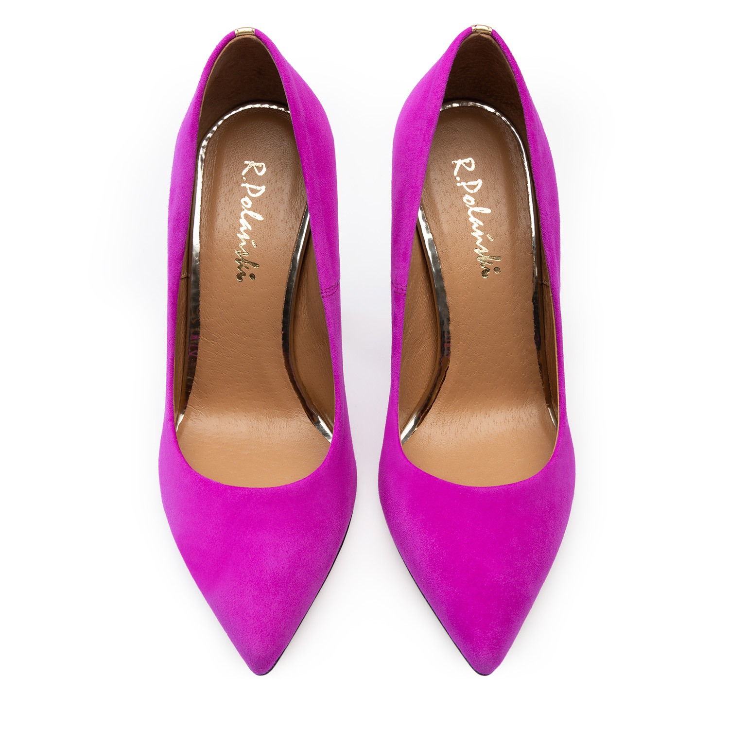 Fuksjowe szpilki z kokardą na złotym obcasie 10 cm ze skóry zamszowej