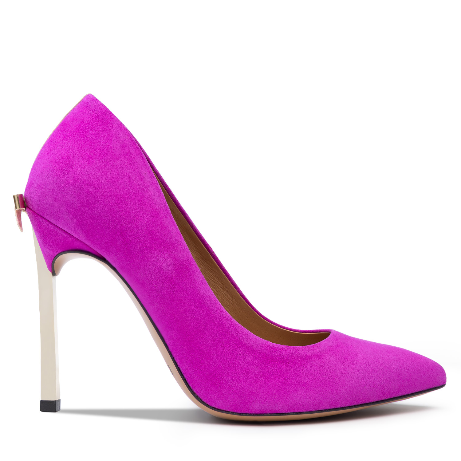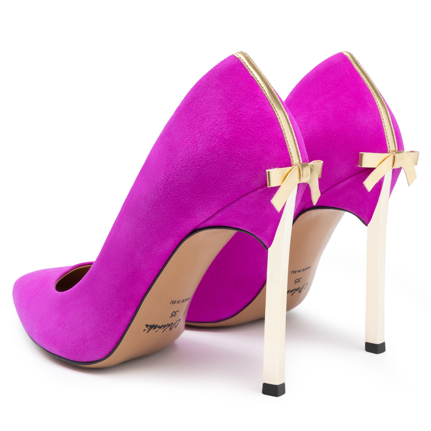Głęboki, nasycony odcień fuksji na aksamitnej skórze zamszowej przyciąga wzrok i hipnotyzuje. Ten klejnotowy kolor stanowi perfekcyjne tło dla biżuteryjnych detali. Wysoki na 10 cm, smukły obcas oraz spektakularna, ręcznie formowana złota kokarda na pięcie lśnią blaskiem szlachetnego złota. To połączenie jest niezwykle eleganckie i pełne charakteru, tworząc obuwie, które jest prawdziwym dziełem sztuki.