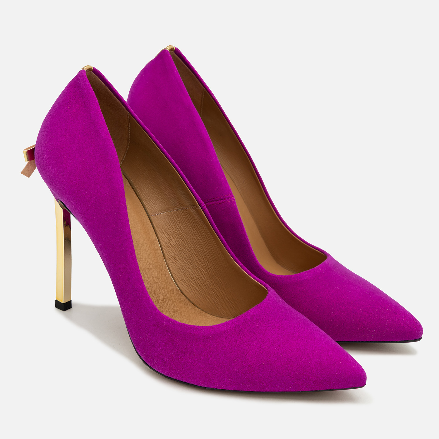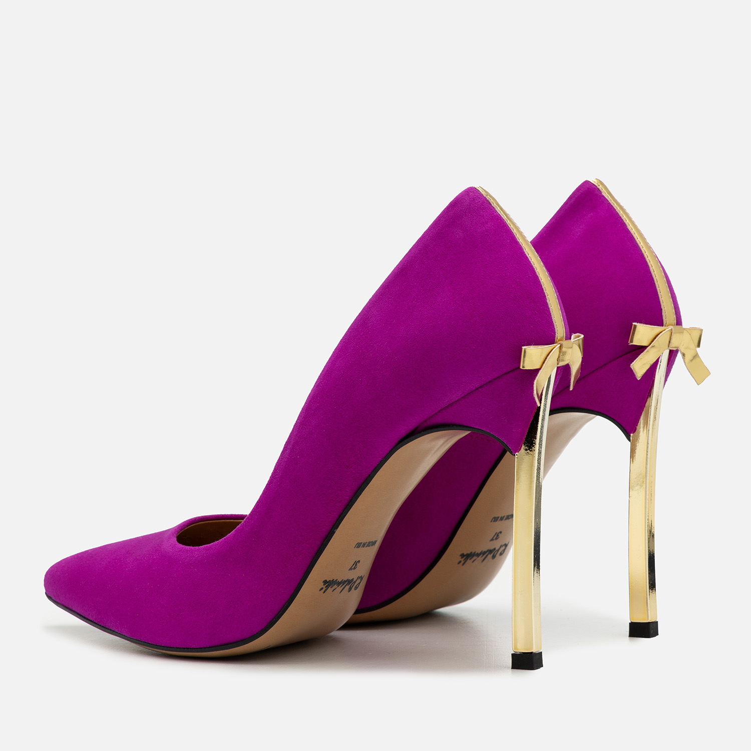 Fuksjowe szpilki z kokardą na złotym obcasie 10 cm ze skóry zamszowej