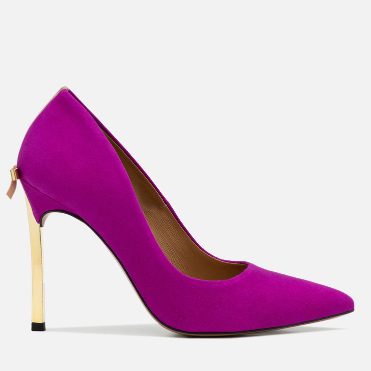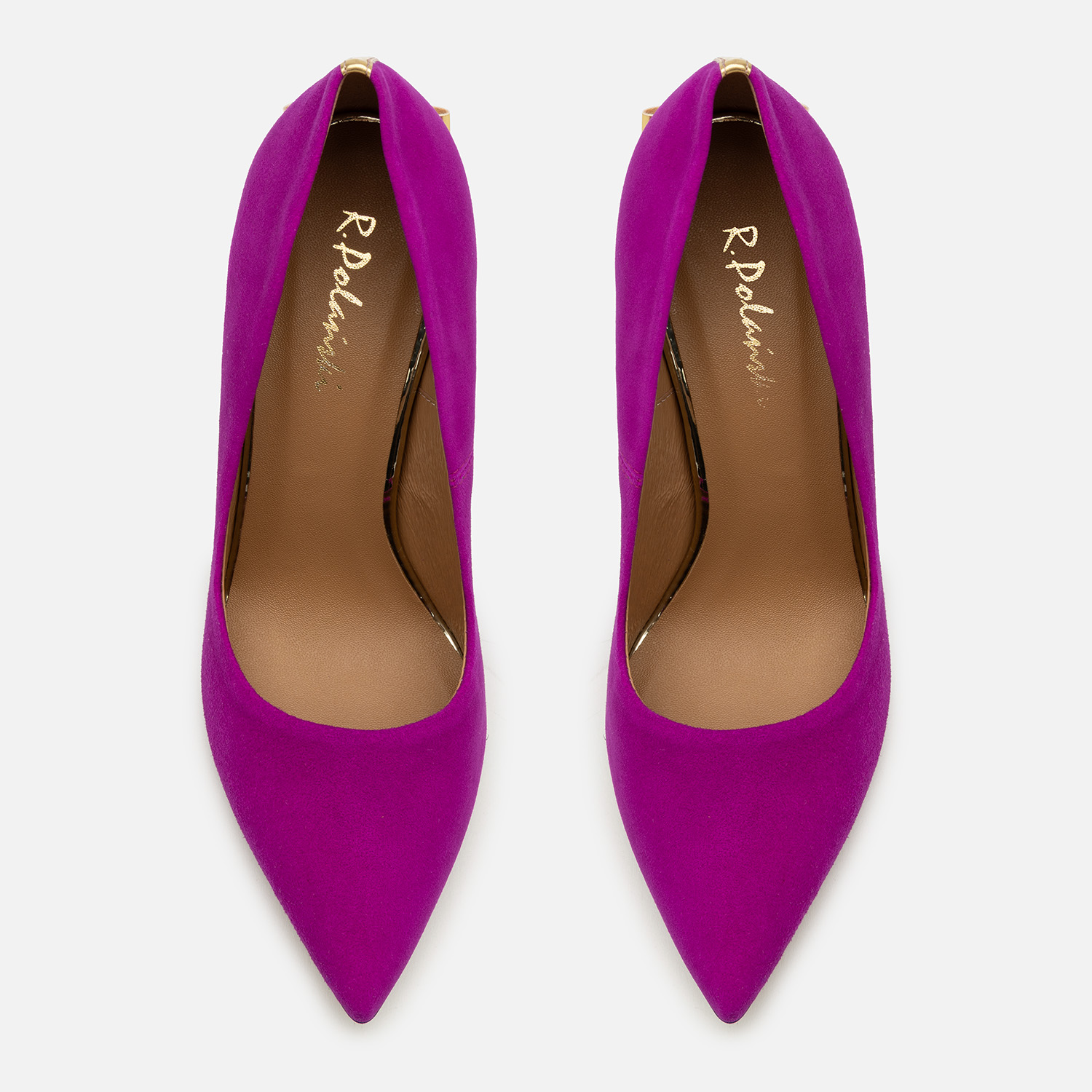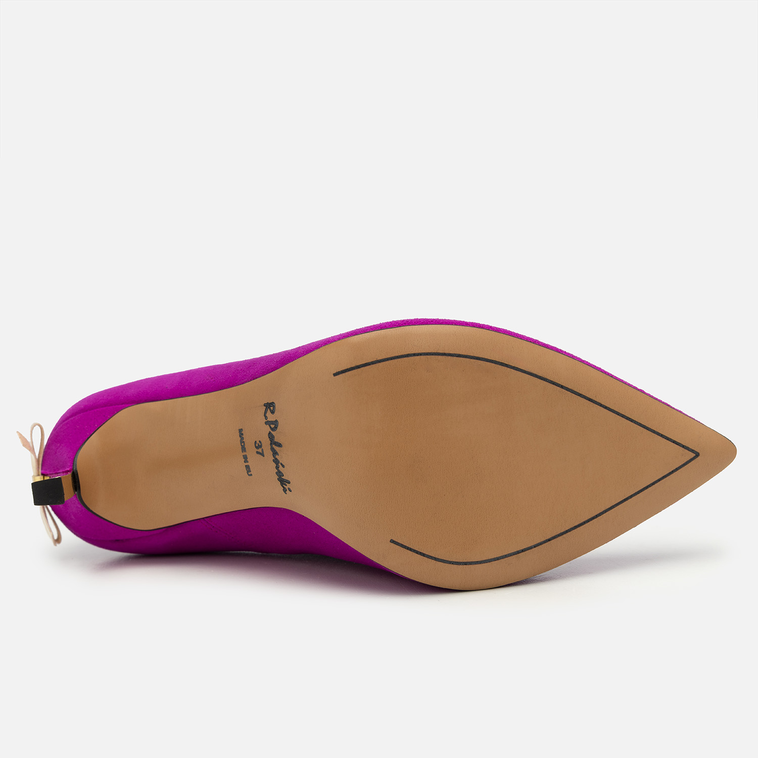 Głęboki, nasycony odcień fuksji na aksamitnej skórze zamszowej przyciąga wzrok i hipnotyzuje. Ten klejnotowy kolor stanowi perfekcyjne tło dla biżuteryjnych detali. Wysoki na 10 cm, smukły obcas oraz spektakularna, ręcznie formowana złota kokarda na pięcie lśnią blaskiem szlachetnego złota. To połączenie jest niezwykle eleganckie i pełne charakteru, tworząc obuwie, które jest prawdziwym dziełem sztuki.