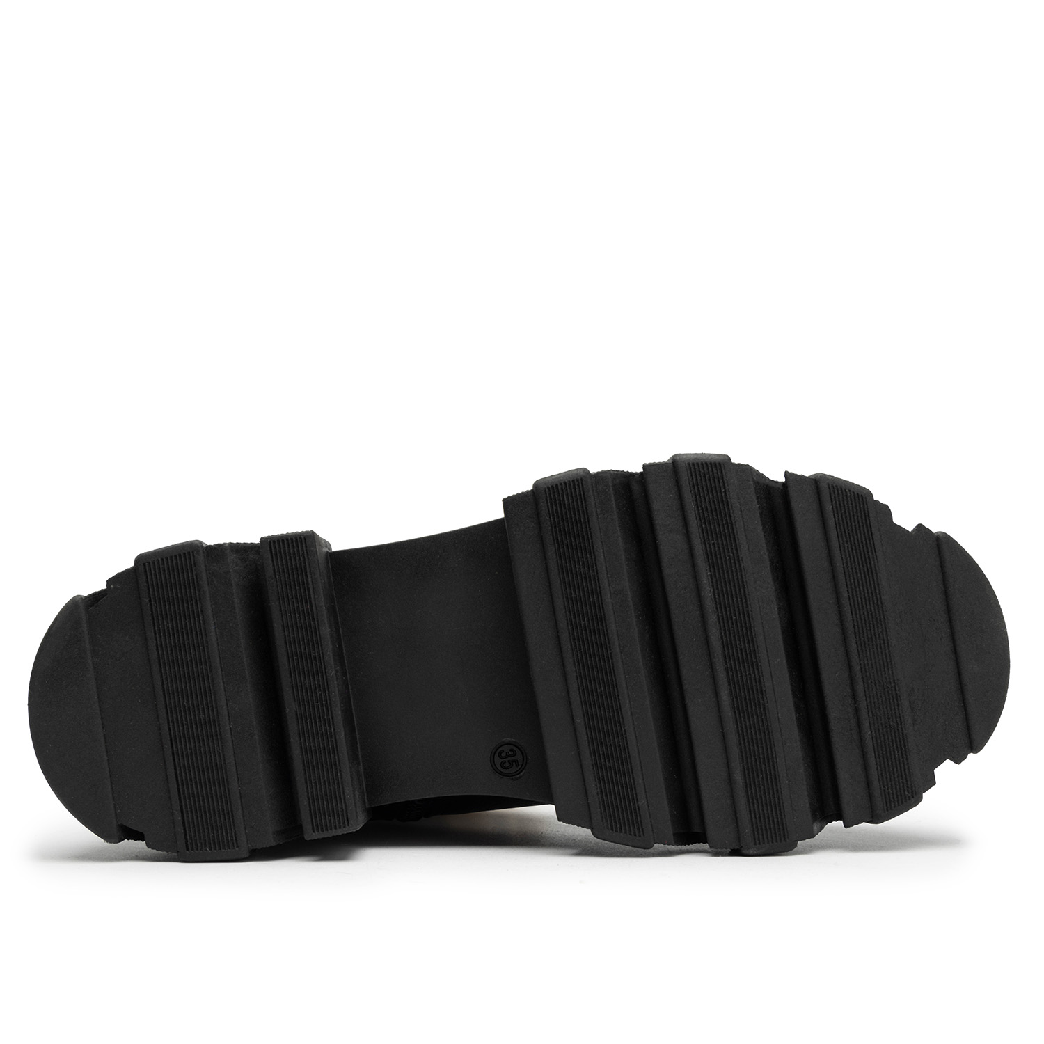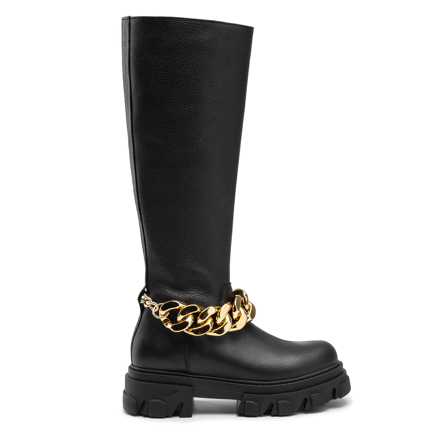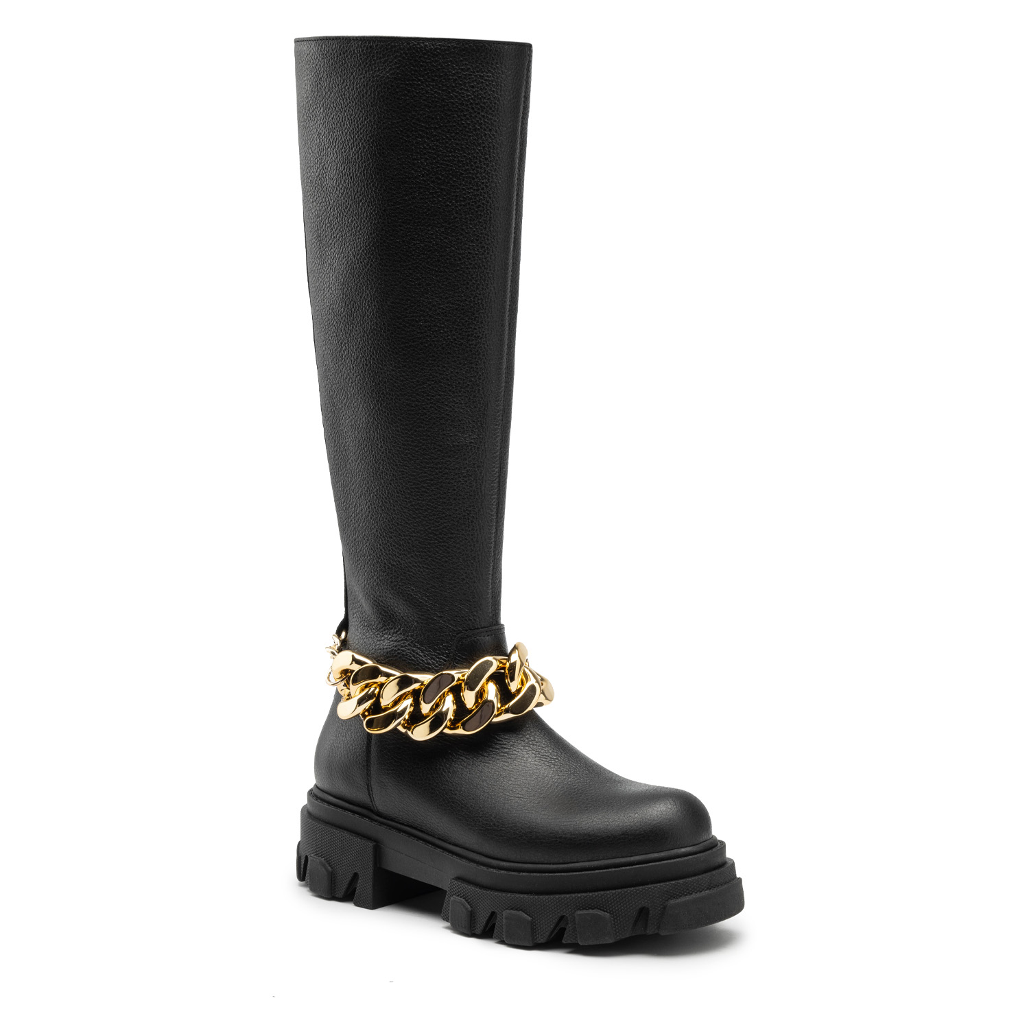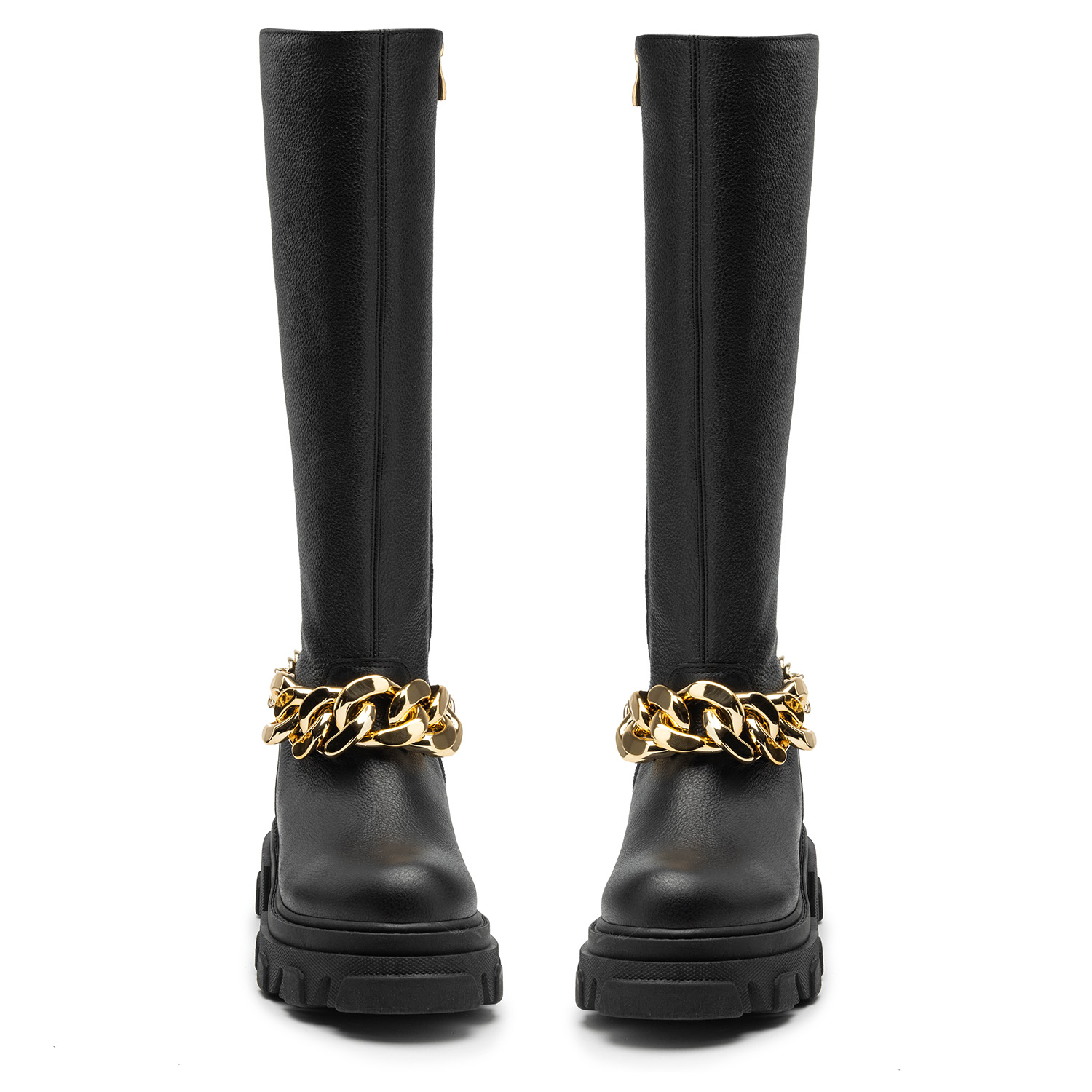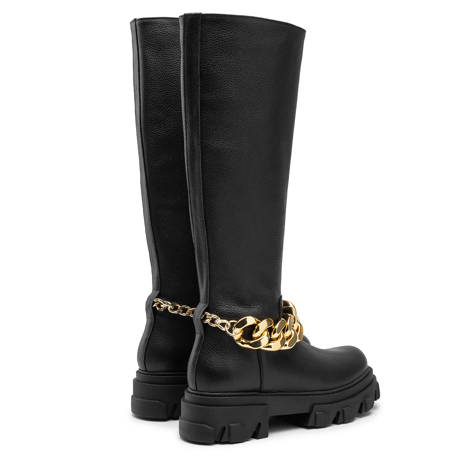 Jeśli marzysz o oryginalnym dopełnieniu zimowej stylizacji, czarne kozaki ze złotym łańcuszkiem to doskonały wybór. Prezentowane kozaki posiadają długą cholewkę sięgającą do kolana, a całkowita wysokość buta stanowi 46,1 centymetrów. Kozaki idealnie komponują się zarówno z krótkimi kurtkami, jak i długimi płaszczami, mogą być zakładane do sukienek, a także na wąskie spodnie. Mocnym punktem prezentowanych kozaków jest dodatek w postaci złotego łańcucha wokół kostki. Buty mogą być zakładane za pomocą suwaka lub po prostu wsuwane. Kozaki są na platformie, wysokość obcasa to 4 centymetry, a podeszwa posiada żłobienia typu ”traktor” - to wszystko sprawia, że chodzenie nawet po śliskich i nierównych nawierzchniach nie będzie sprawiać problemów.