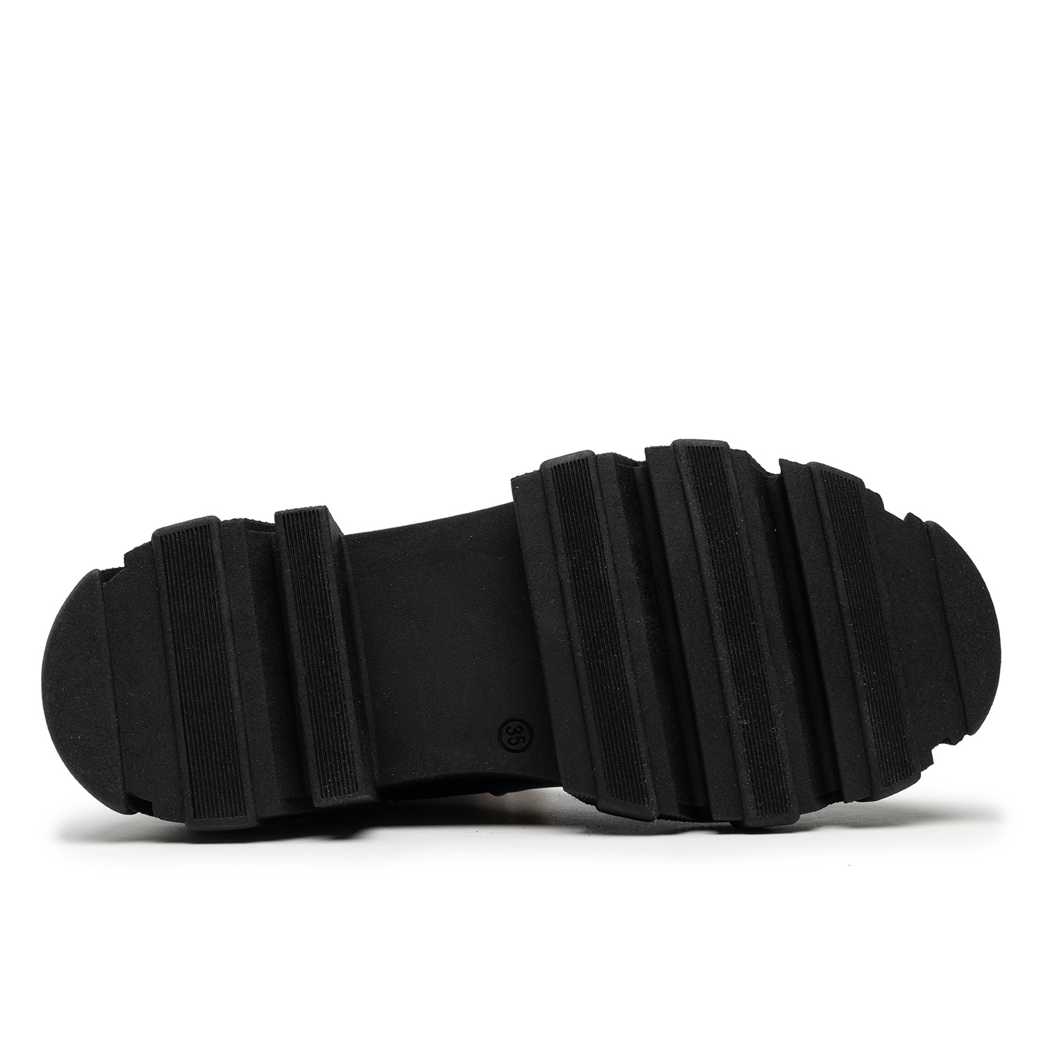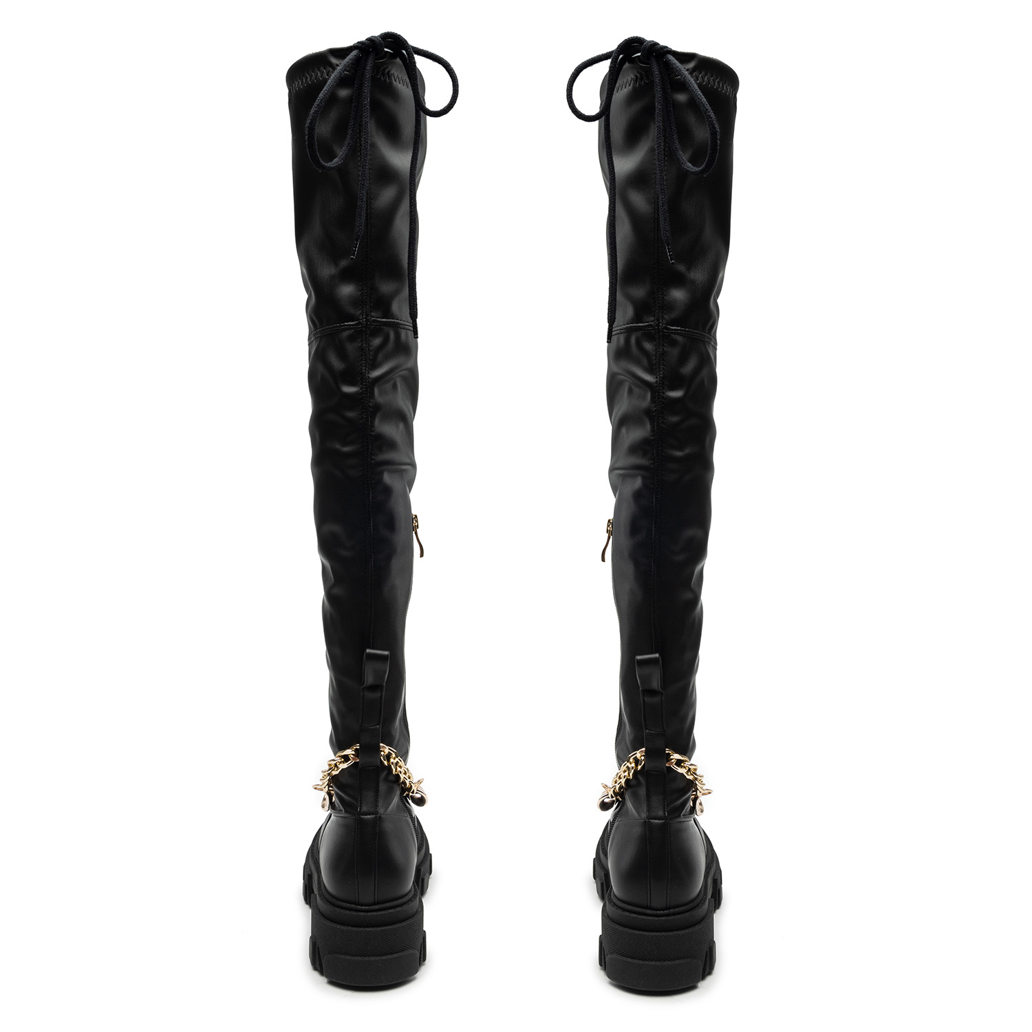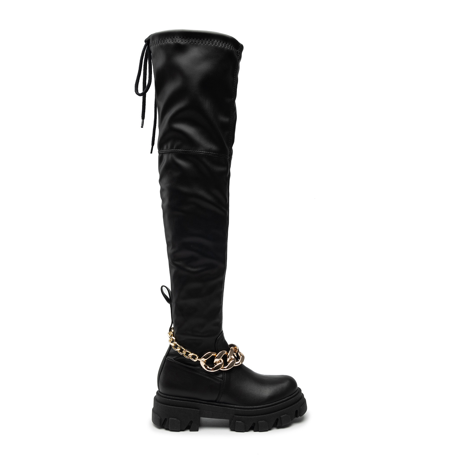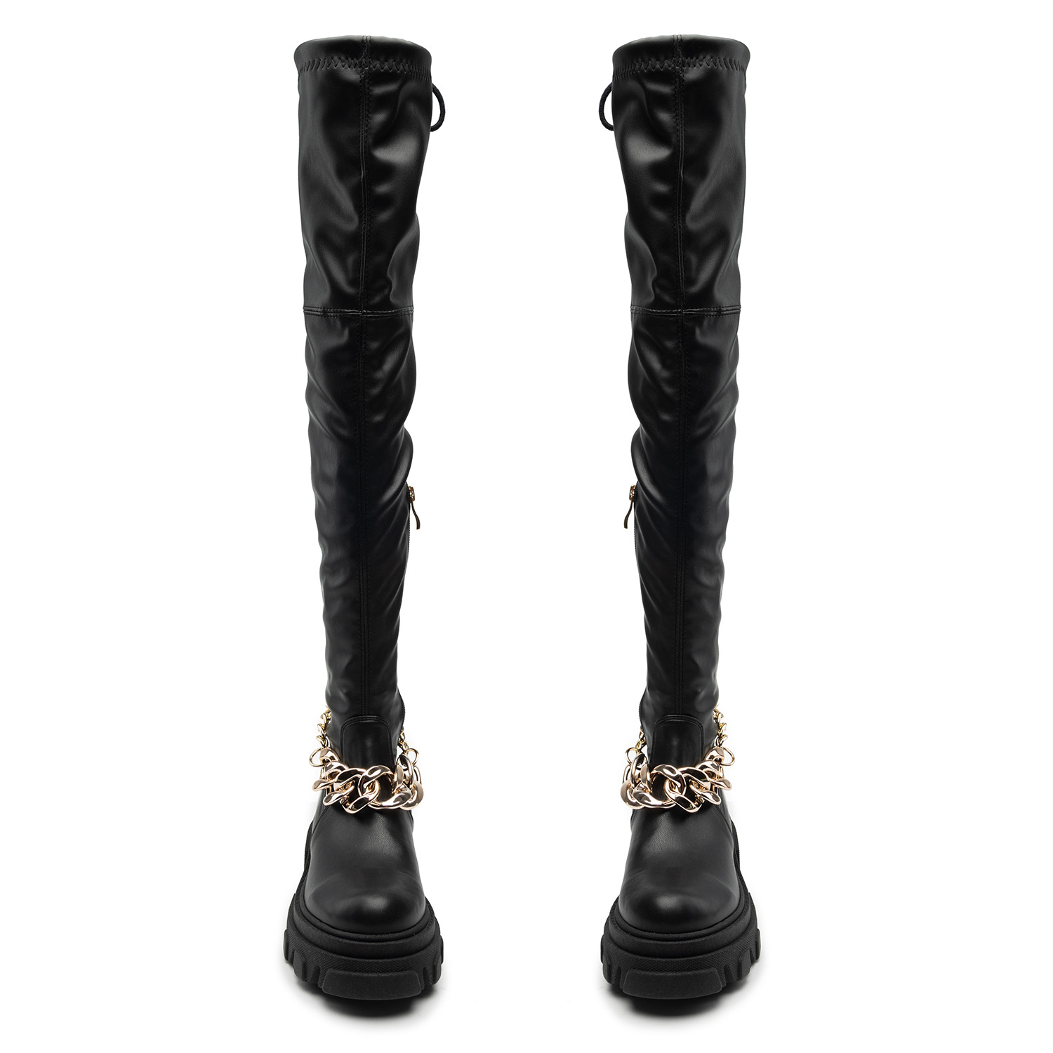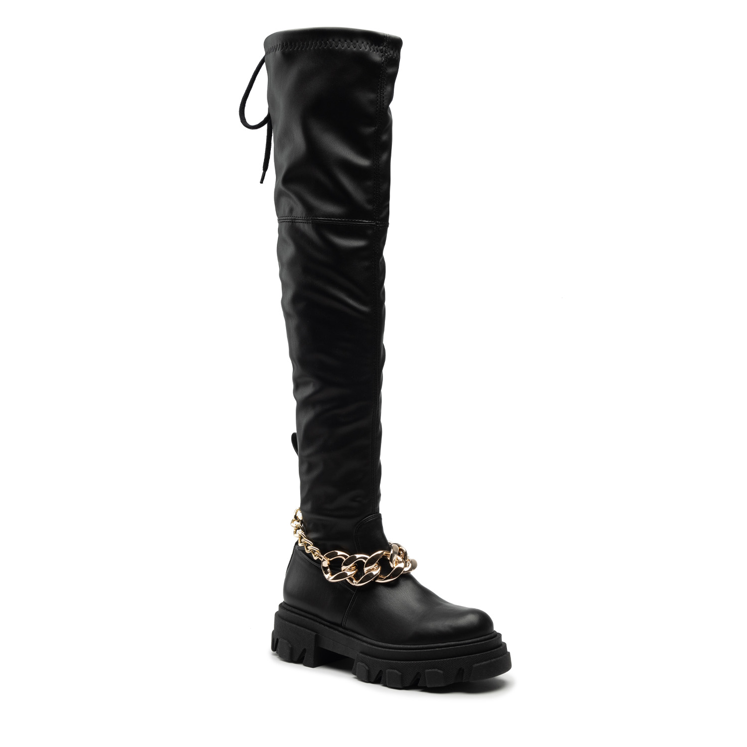 CzarnyJeśli marzysz o oryginalnym dopełnieniu zimowej stylizacji, czarne kozaki ze złotym łańcuszkiem to doskonały wybór. Prezentowane kozaki posiadają niesamowicie długą cholewkę sięgającą aż za kolano, a całkowita wysokość buta stanowi aż 75 centymetrów. Kozaki idealnie komponują się zarówno z krótkimi kurtkami, jak i długimi płaszczami, mogą być zakładane do sukienek, a także na wąskie spodnie. Mocnym punktem prezentowanych kozaków jest dodatek w postaci złotego łańcucha wokół kostki oraz materiałowe wiązania tuż przy zakończeniu cholewki z tyłu. Buty mogą być zakładane za pomocą suwaka lub po prostu wsuwane. Kozaki są na platformie, wysokość obcasa to 5,5 centymetra, a podeszwa posiada żłobienia typu ”traktor” - to wszystko sprawia, że chodzenie nawet po śliskich i nierównych nawierzchniach nie będzie sprawiać problemów.