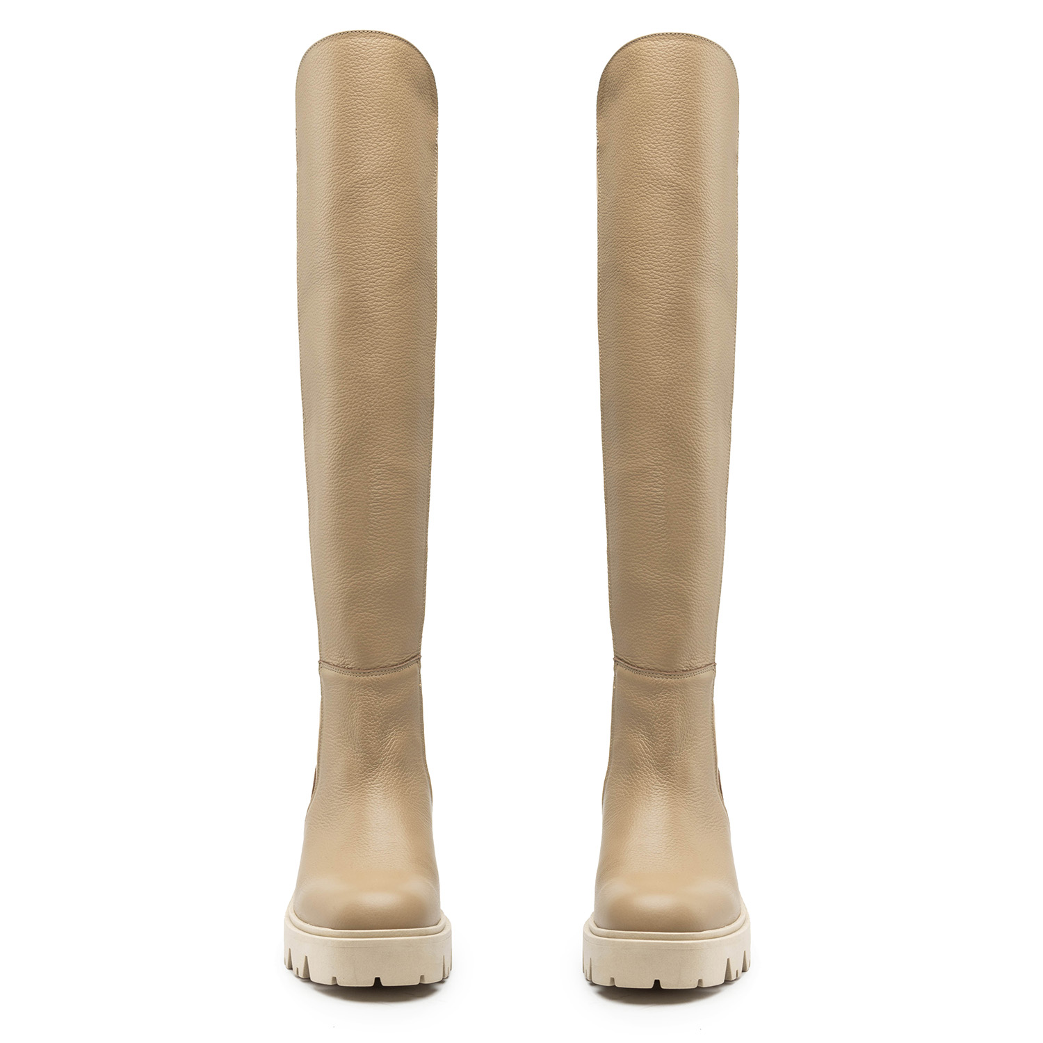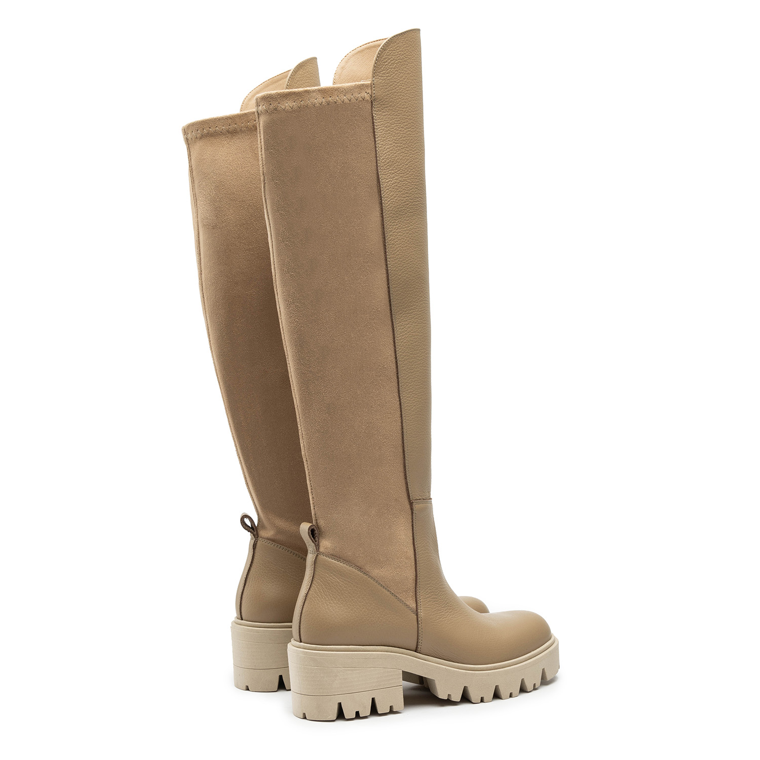 Beżowy Lico/Beżowy ZamszKozaki na niskiej, ale solidnej platformie to absolutny must have jesienno-zimowego sezonu. Stabilny słupek o wysokości 5,7 cm przyczynia się do komfortowego chodzenia przez wiele godzin w ciągu dnia, a pogrubiona podeszwa ze specjalnie wyciętym bieżnikiem gwarantuje idealną przyczepność buta do podłoża. To, co wyróżnia kozaki, to bez wątpienia oryginalnie wycięta cholewka, która skutecznie chroni skórę przed ujemnymi temperaturami. Obuwie wykonane z połączenia naturalnej skóry licowej oraz tworzywa wysokiego gatunku doskonale dopasowuje się do stopy, co zwiększa wygodę podczas użytkowania. Model doskonale prezentuje się do codziennych stylizacji. Kozaki zestawione z dopasowanymi rurkami, elegancką sukienką lub spódnicą świetnie podkreślą ubiór i dopełnią całość. Codzienne wyjście do pracy stanie się przyjemnością.