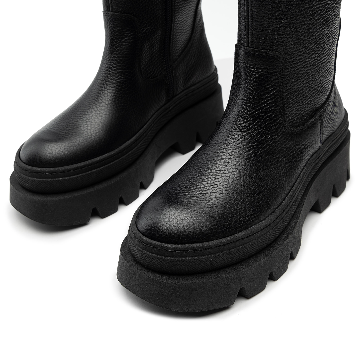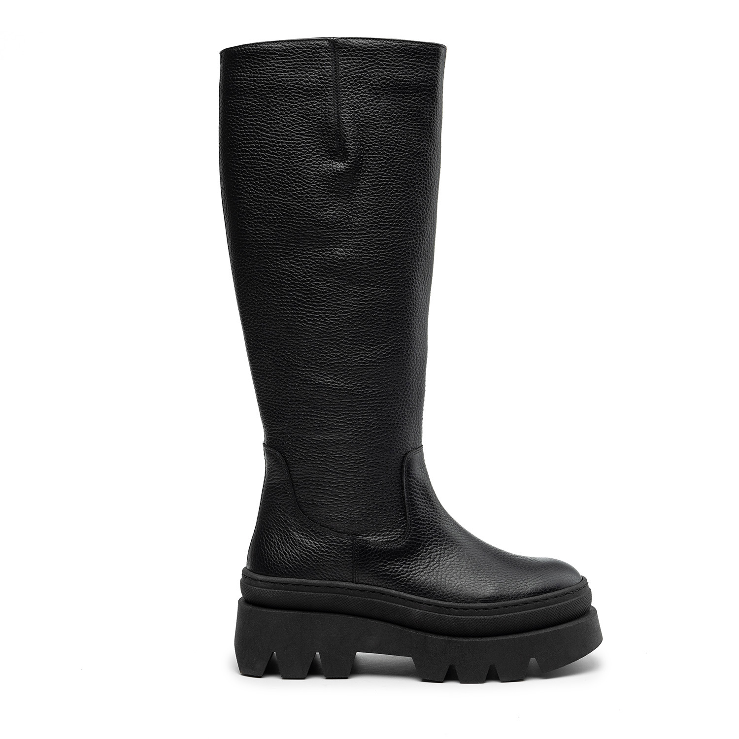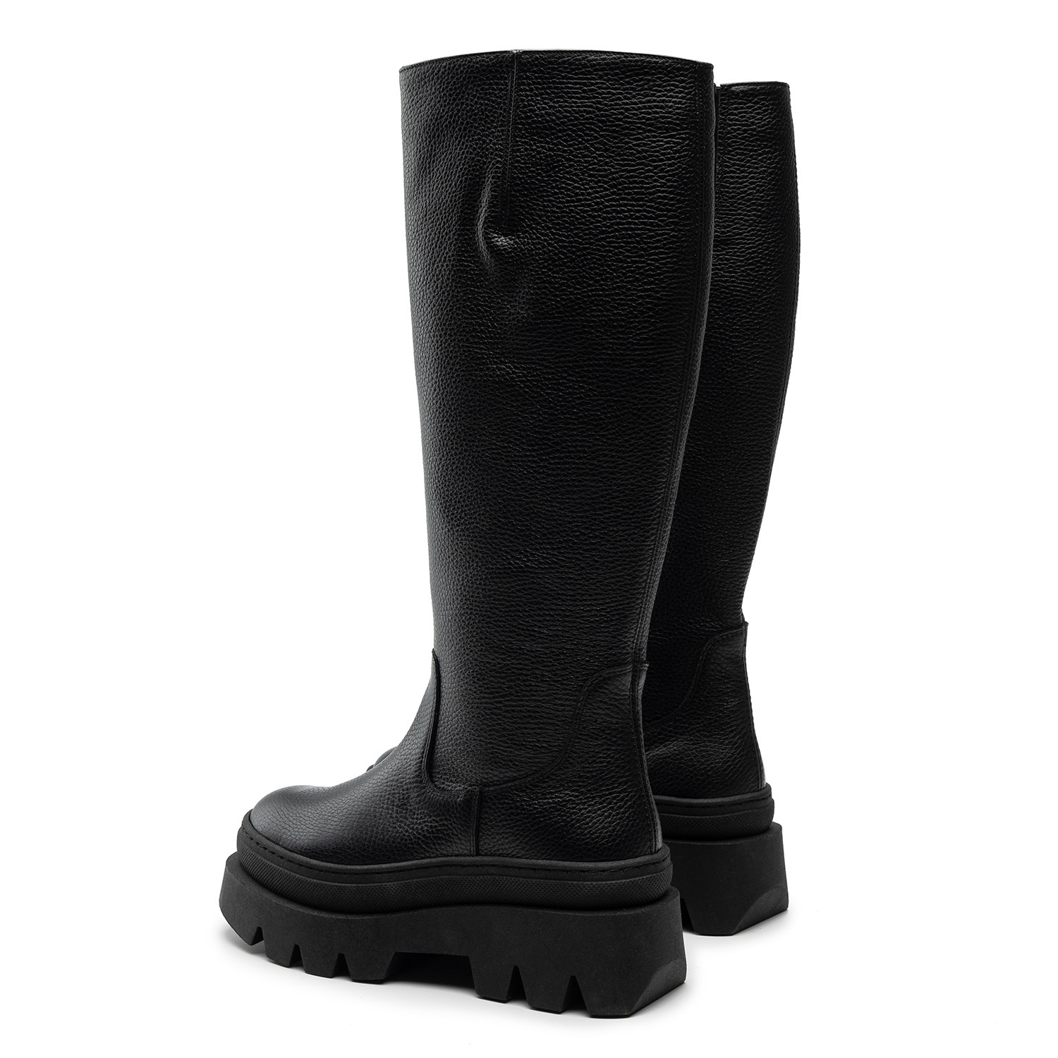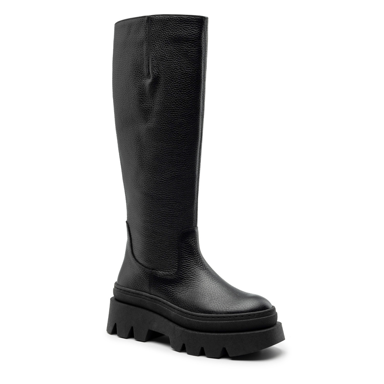 Czarny LicoDamskie, wysokie kozaki wykonane z naturalnej skóry licowej to idealny model na jesienno-zimowy sezon. Płaska, a jednocześnie solidna podeszwa o grubości 3 cm gwarantuje niesamowitą wygodę podczas chodzenia oraz swobodę ruchu niezależnie od nawierzchni. Suwak dyskretnie umieszczony na wewnętrznej stronie zapewnia sprawne zakładanie i ściąganie obuwia, a cholewka o całkowitej wysokości 45 cm skutecznie ochroni przed zimnem. Solidne kozaki damskie nadadzą charakteru każdej stylizacji — niezależnie od preferowanego stylu. Klasyczny, czarny kolor sprawia, że obuwie pasuje do wszystkiego. Model doskonale wygląda w połączeniu z obcisłymi dżinsami, eleganckimi sukienkami oraz materiałowymi spodniami. Kozaki z powodzeniem przyciągną wzrok, podkreślając ubiór i świetnie sprawdzą się podczas całodziennych wyjść do pracy.