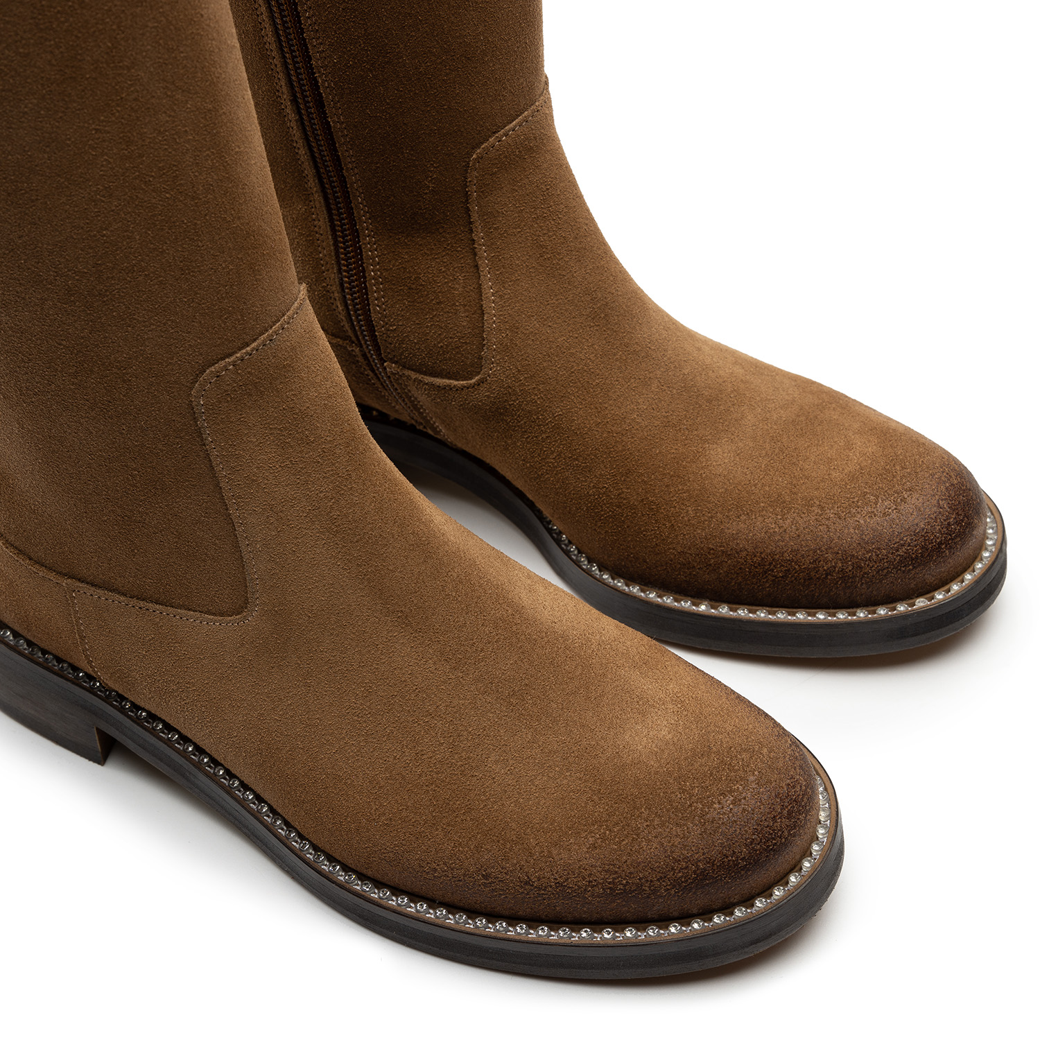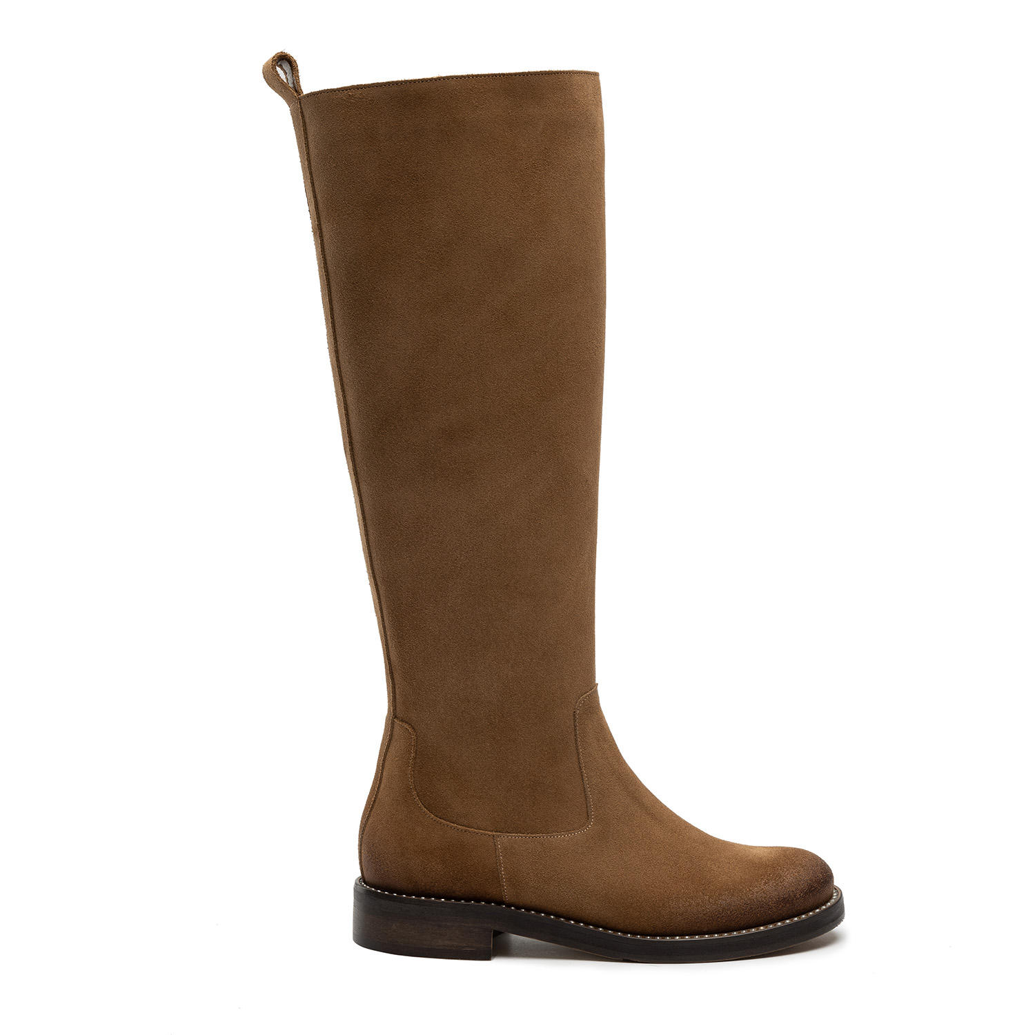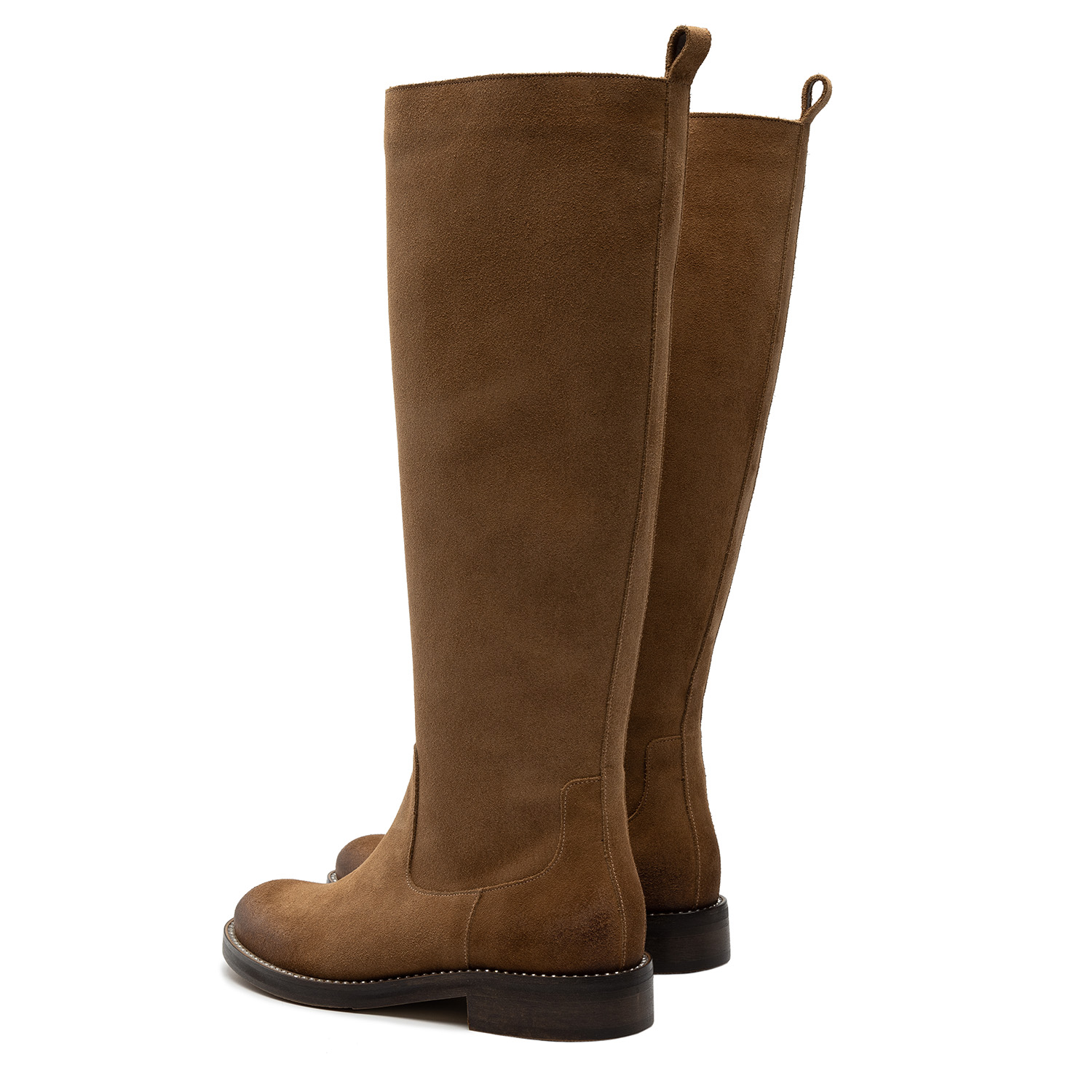 Kozaki sięgające do kolana to idealny sposób na optyczne wysmuklenie nóg. Buty wyprodukowane zostały na bazie naturalnej beżowej skóry zamszowej. Komfort ich użytkowania gwarantuje skórzane wnętrze wraz z wyściełającą je wkładką oraz płaska podeszwa z szerokim obcasem z wysokogatunkowego tworzywa. Okrągły nosek obuwia nie krępuje swobody palców u stóp, a suwak przechodzący przez całą wysokość buta stanowi wygodny sposób zapięcia i umożliwia przyleganie obuwia do nogi.