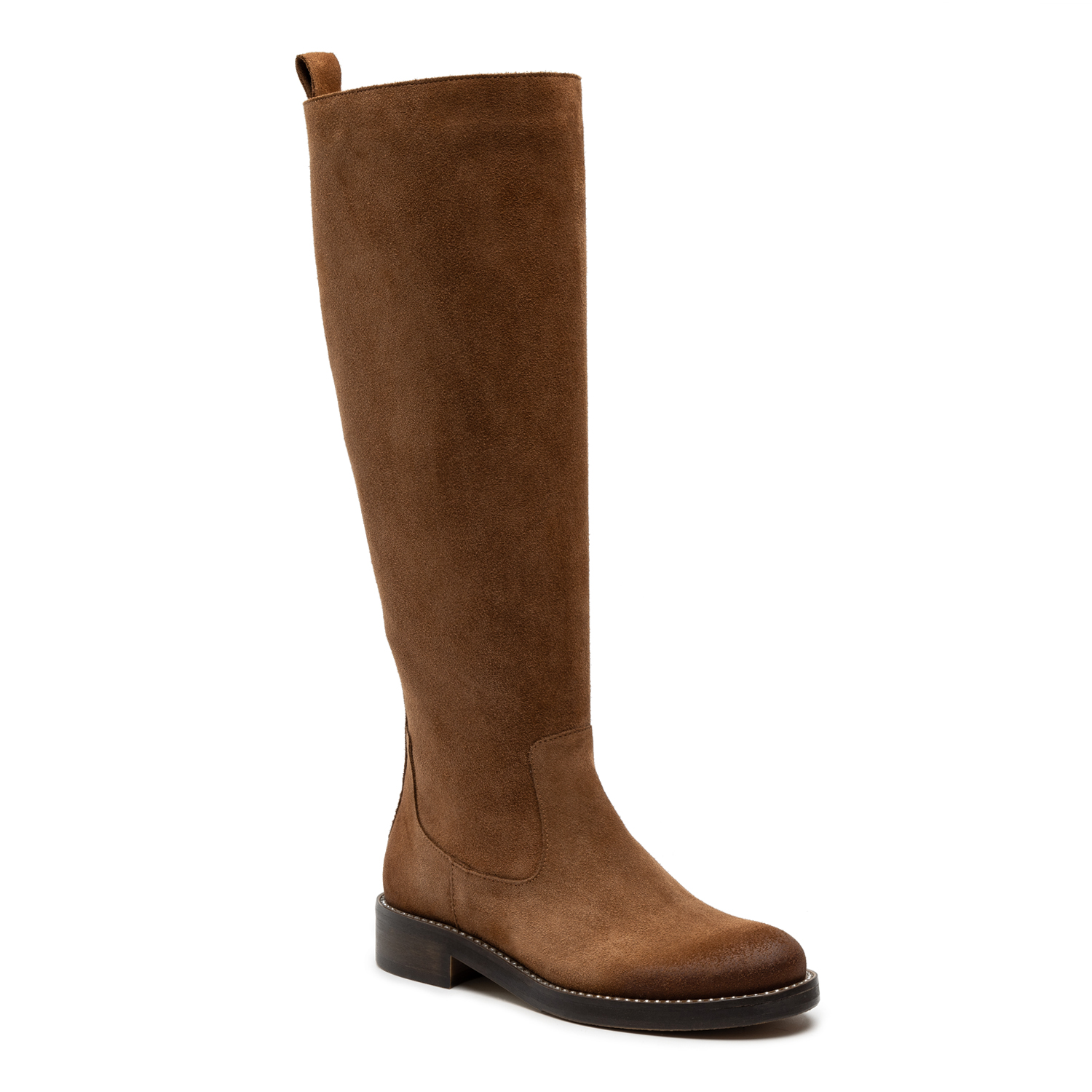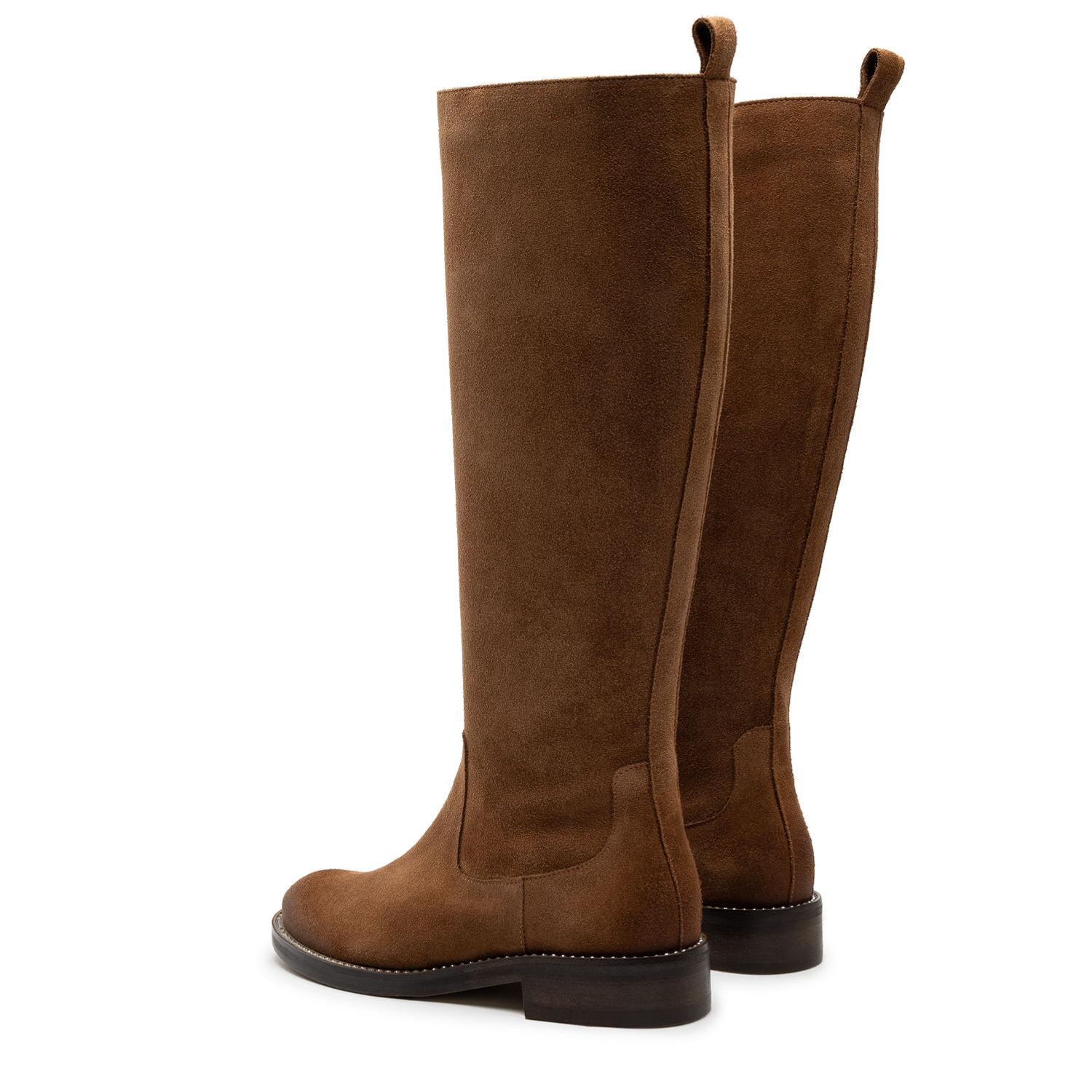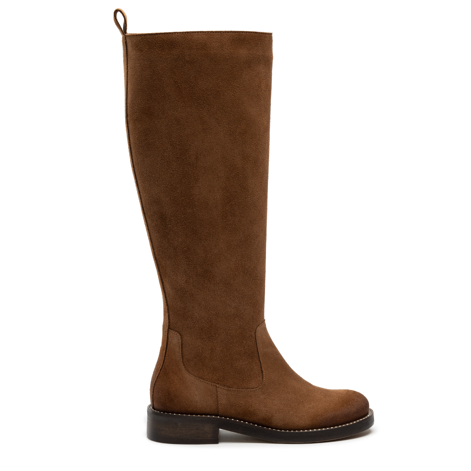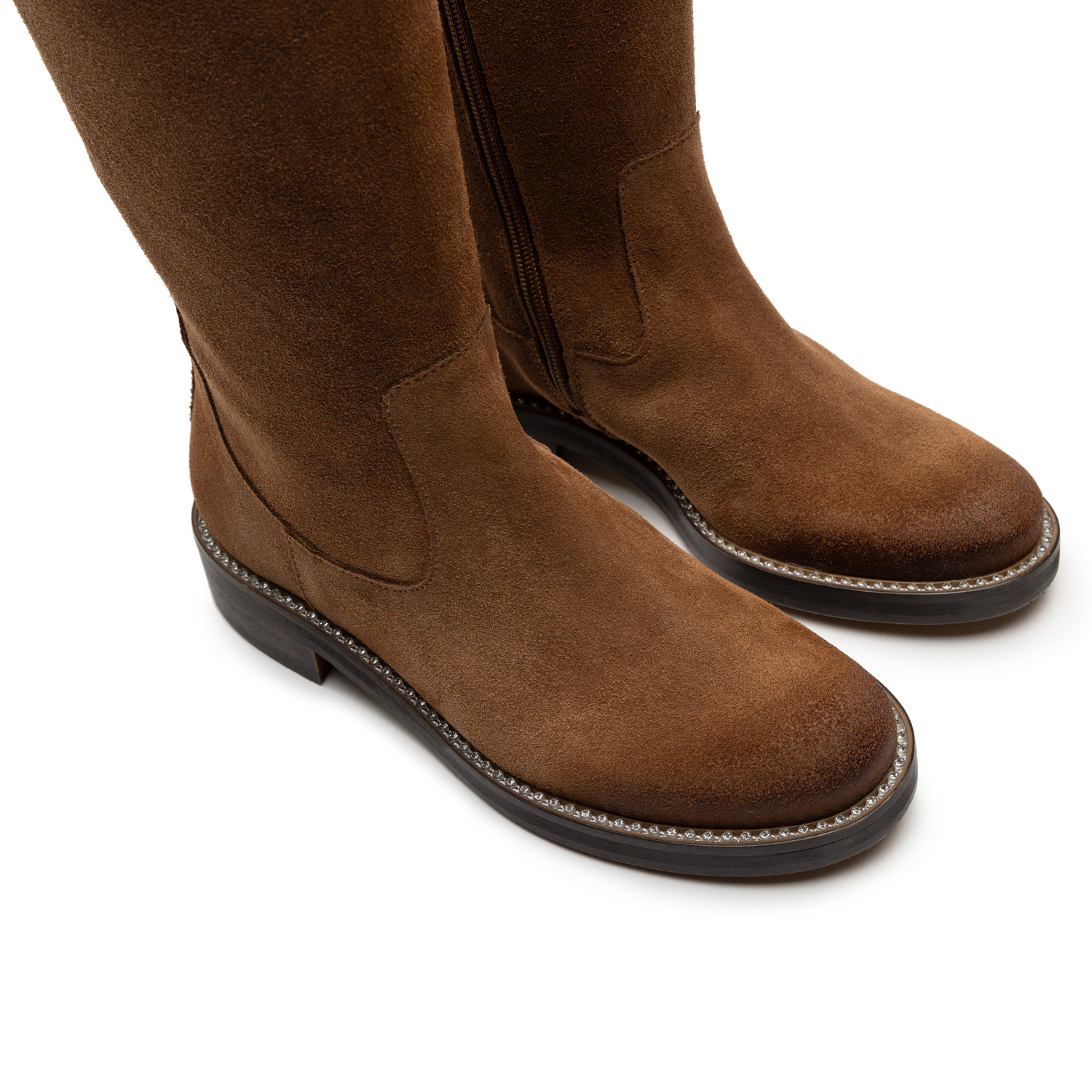 Kozaki sięgające do kolana to idealny sposób na optyczne wysmuklenie nóg. Buty wyprodukowane zostały na bazie naturalnej brązowej skóry zamszowej. Komfort ich użytkowania gwarantuje skórzane wnętrze wraz z wyściełającą je wkładką oraz płaska podeszwa z szerokim obcasem z wysokogatunkowego tworzywa. Okrągły nosek obuwia nie krępuje swobody palców u stóp, a suwak przechodzący przez całą wysokość buta stanowi wygodny sposób zapięcia i umożliwia przyleganie obuwia do nogi.