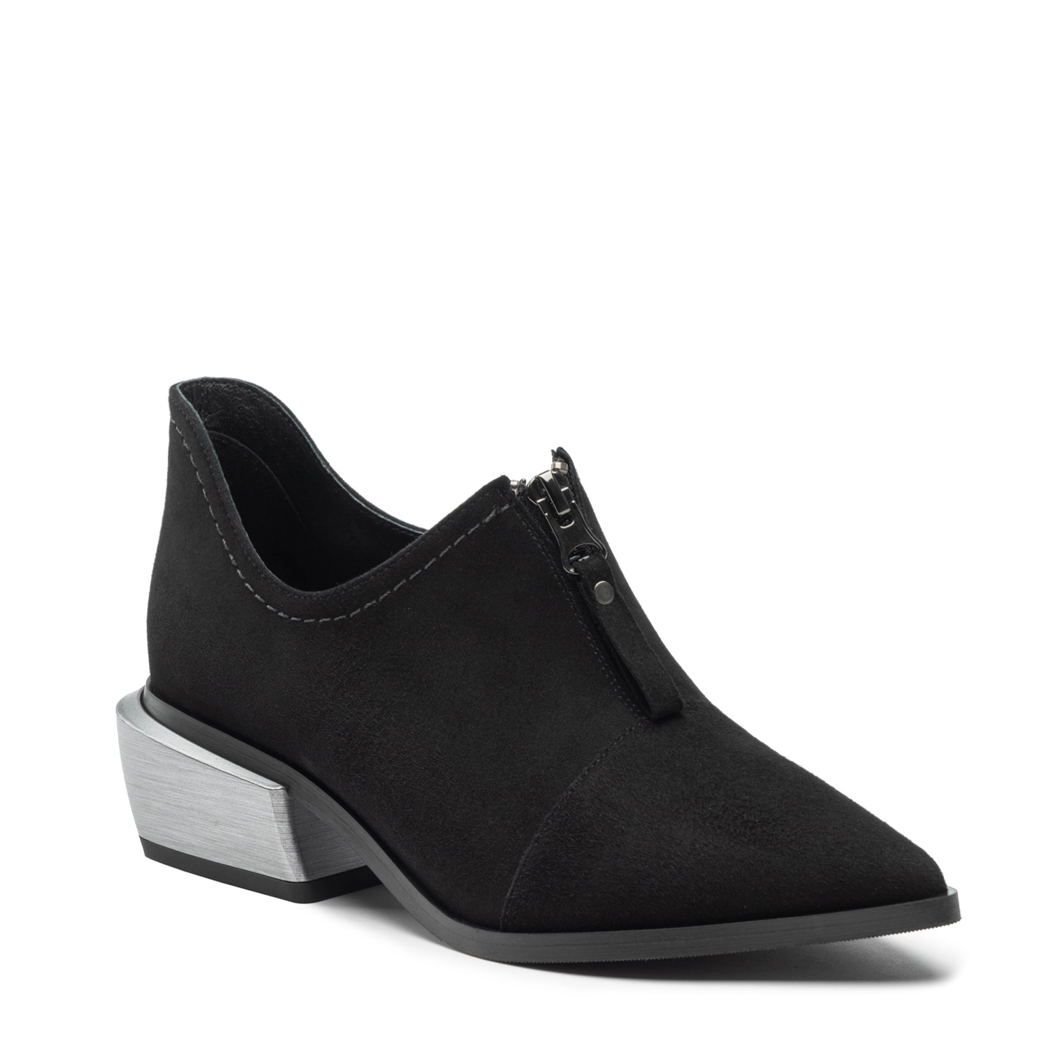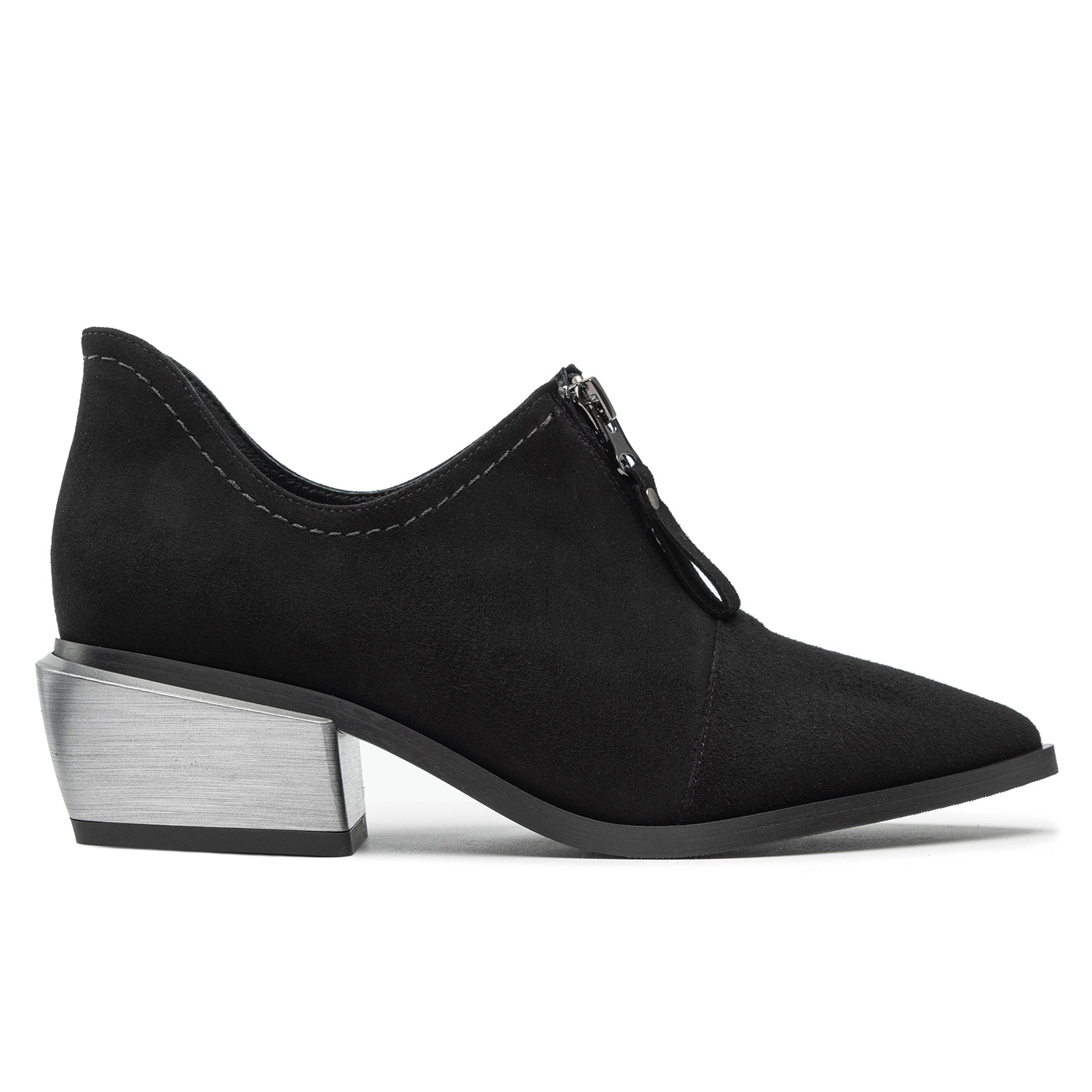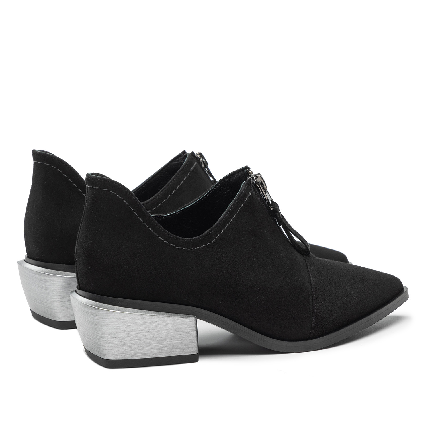 Wygodne, skórzane półbuty z powodzeniem sprawdzą się w każdej garderobie. Klasyczny, czarny wariant elegancko prezentuje się zarówno w zestawieniu skóry zamszowej, jak i licowej. Oryginalny, klockowaty obcas z błyszczącym efektem dodaje nowoczesnego wyglądu całemu modelowi, a także przyciąga uwagę i podkreśla cały ubiór. Nosek uformowany w modny szpic sprawia, że nogi wydają się dłuższe, a wygodny suwak umieszczony z przodu cholewki nie tylko ułatwia zakładanie butów, ale również pełni funkcję ozdoby. Półbuty to propozycja dla wszystkich kobiet, które cenią sobie paryski szyk i elegancję, a jednocześnie chcących czuć się komfortowo i wygodnie podczas chodzenia. Obuwie świetnie pasuje do materiałowych, luźnych spodni zestawionych z klasyczną białą koszulą, a także luźnych sukienek oraz szerszych spódnic.