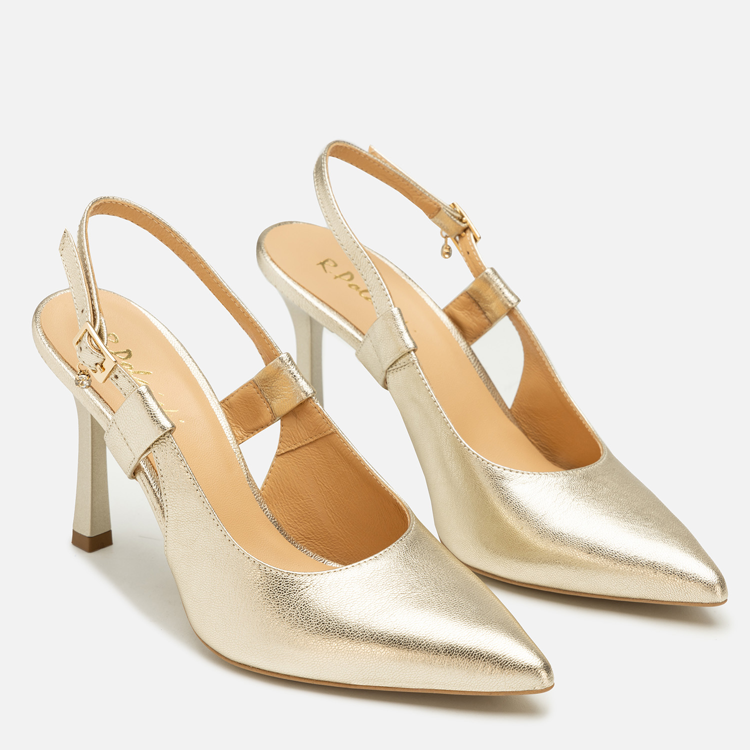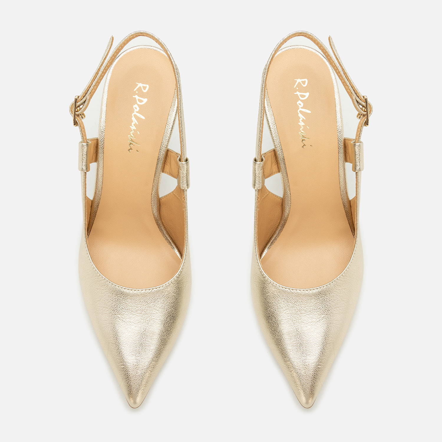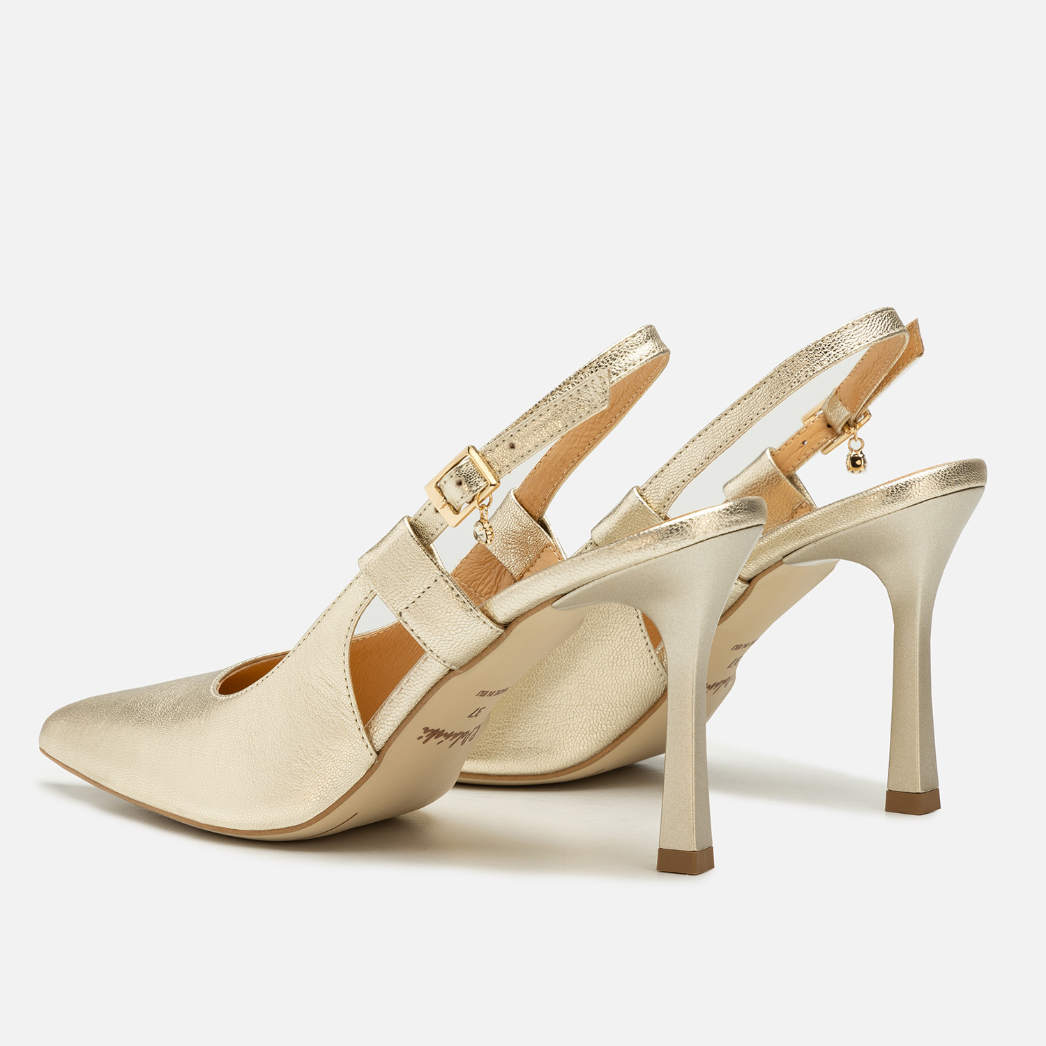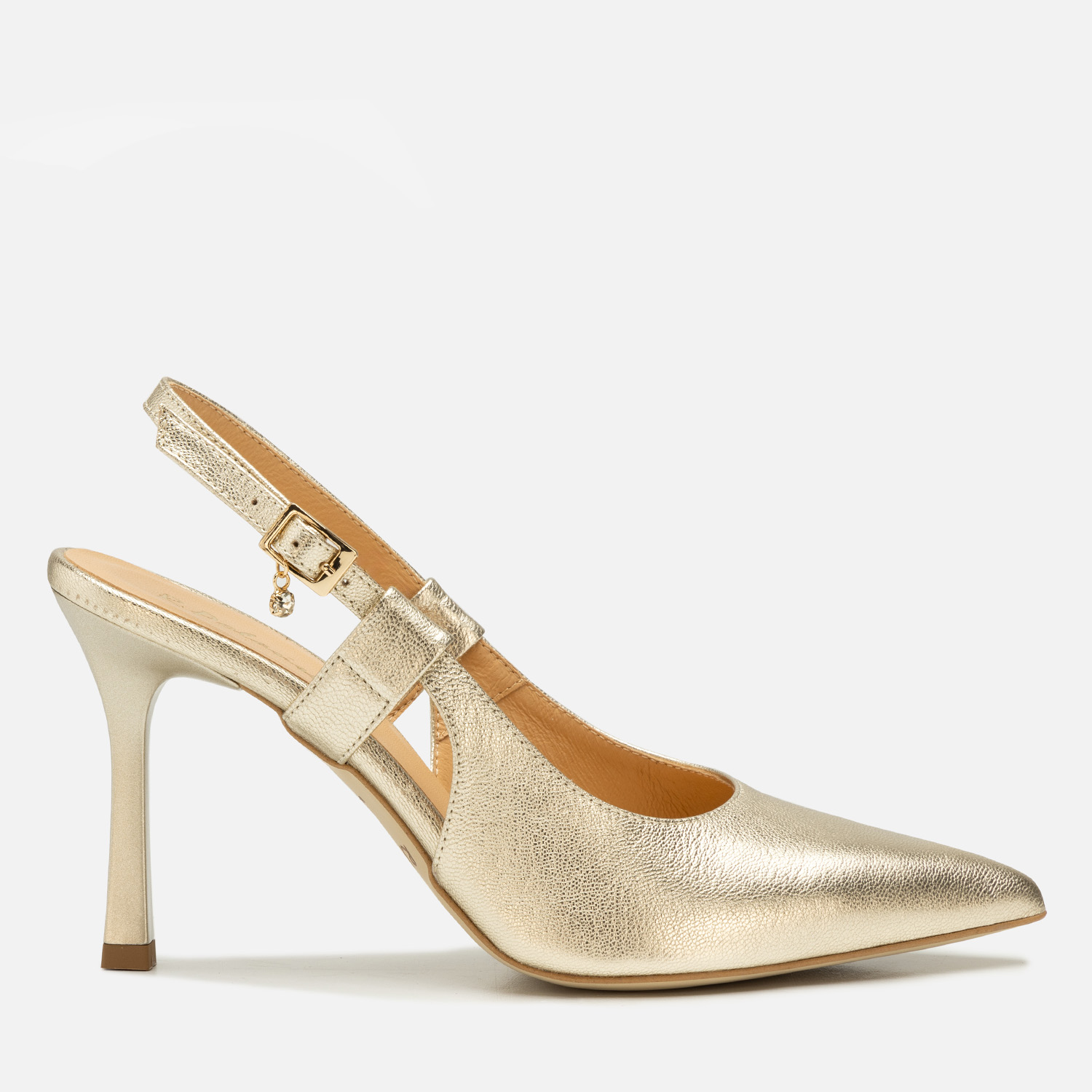 Sandały na szpilce o wysokości prawie 9 cm to obuwie, którego wierzchnią warstwę wyprodukowano z naturalnej skóry, zaś obcasy i podeszwy z wysokogatunkowego tworzywa. Spód butów wyścieła skórzana wkładka gwarantująca komfort stopy podczas ich użytkowania. Obuwie jest otwarte z tyłu, natomiast zakrywa palce stóp. Z przodu zdobi je szpiczasty nosek dający wizualne wrażenie wysmuklenia stopy. Sandały są zapinane za pomocą umieszczonej z boku połyskliwej sprzączki, do której przymocowano niewielki wiszący gadżet biżuteryjny. Buty mają intensywny kolor w wielu odcieniach.