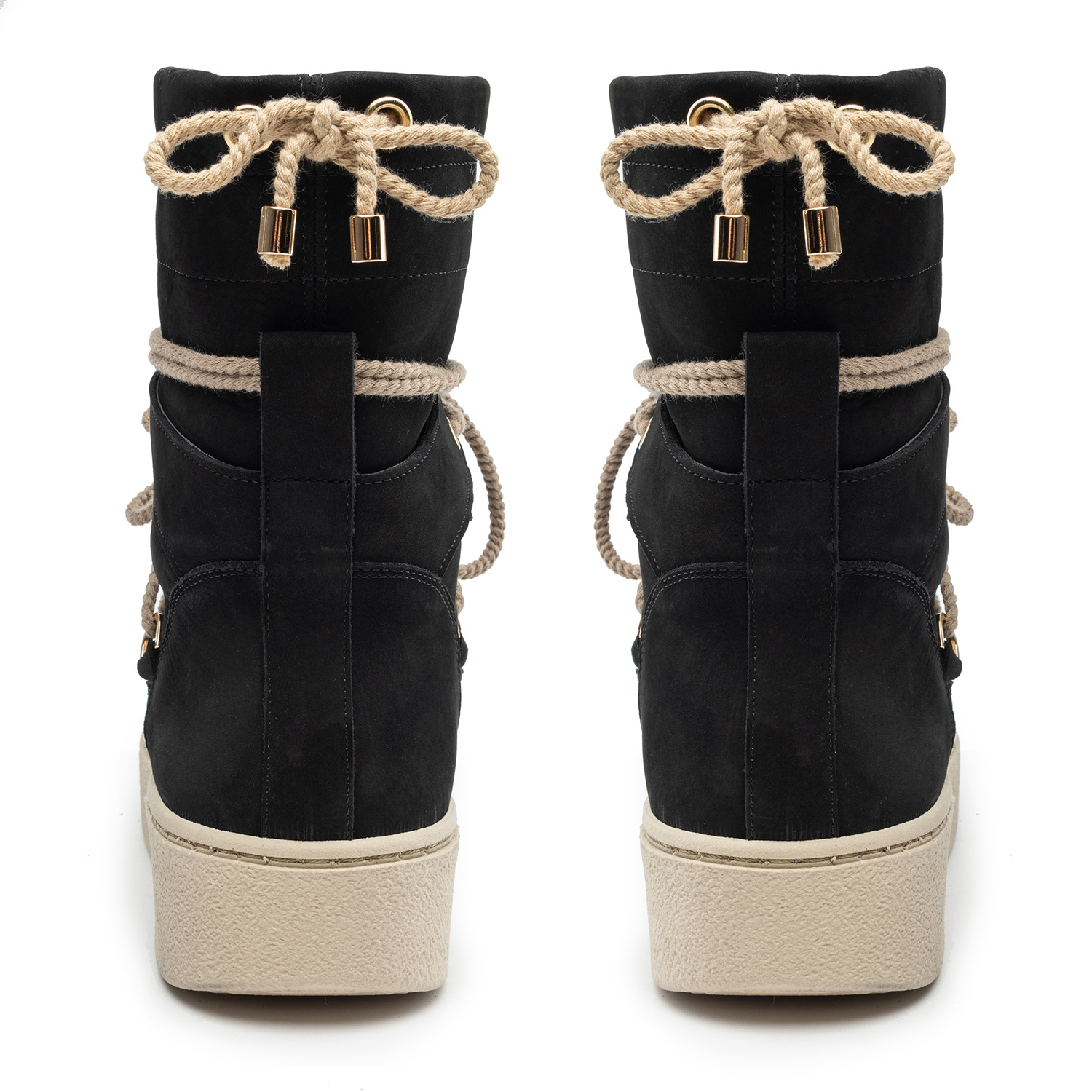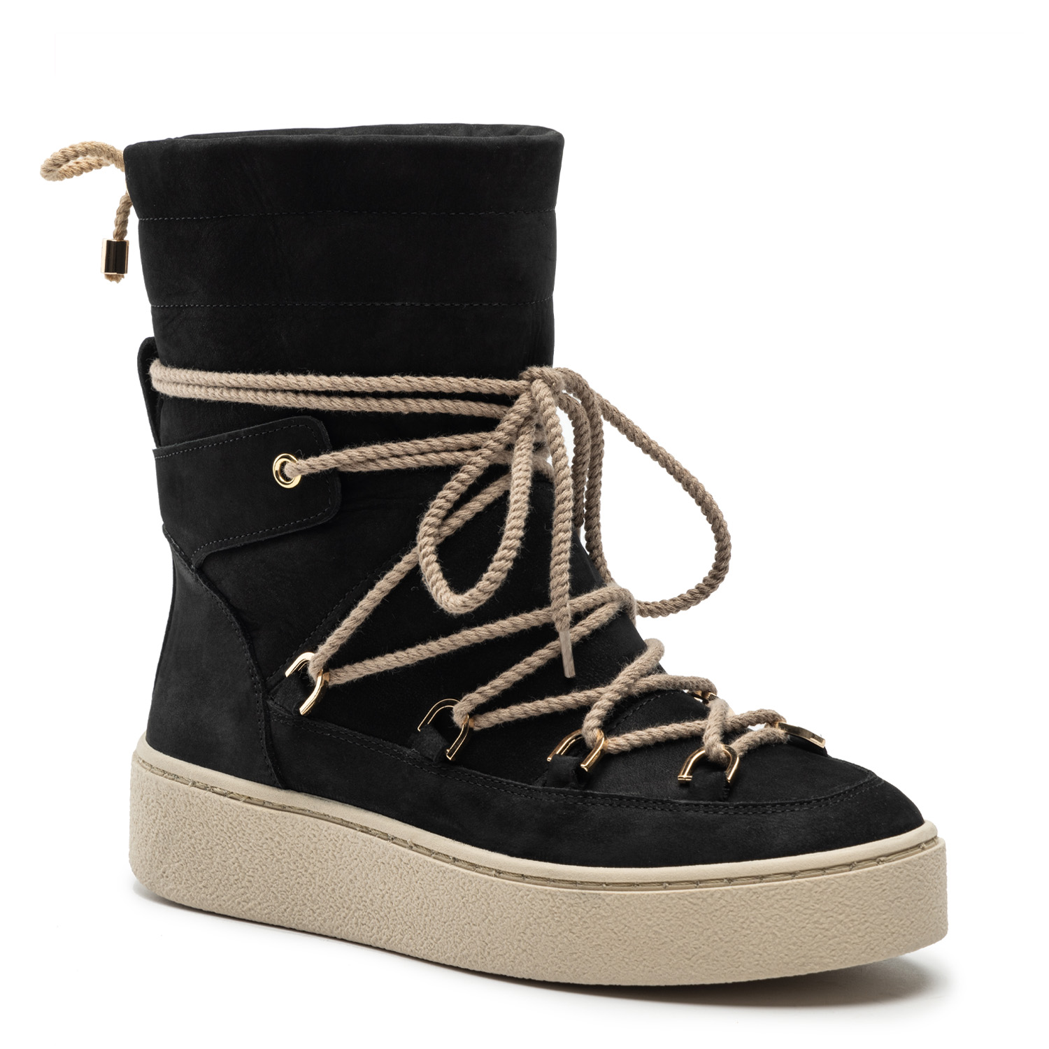 Damskie śniegowce to obowiązkowa propozycja dla wszystkich, którzy cenią sobie wygodę i utrzymanie ciepła podczas niskich temperatur. Model obuwia wykonany z naturalnej, licowej skóry oraz wysokogatunkowego tworzywa. W środku wyściełany został ociepleniem, które skutecznie utrzymuje ciepło, a ozdobne sznurowadła umożliwiają idealne dopasowanie butów do własnych preferencji. Płaska podeszwa wykonana z wysokogatunkowego tworzywa o grubości 3 cm stanowi świetny izolator od podłoża, a tłoczony bieżnik zapobiega ślizganiu się po nawierzchniach pokrytych lodem i śniegiem. Solidna cholewka o całkowitej wysokości 21 cm gwarantuje doskonałą ochronę przed mrozem. Śniegowce doskonale prezentują się w różnych stylizacjach, dodając im charakteru i przyciągając wzrok. Można je łączyć z wszelkimi stylizacjami — wygodnym dresem, sportowymi spodniami, codziennymi dżinsami, a także spódnicami lub sukienkami.