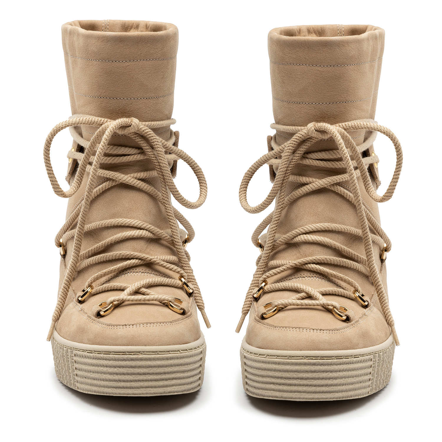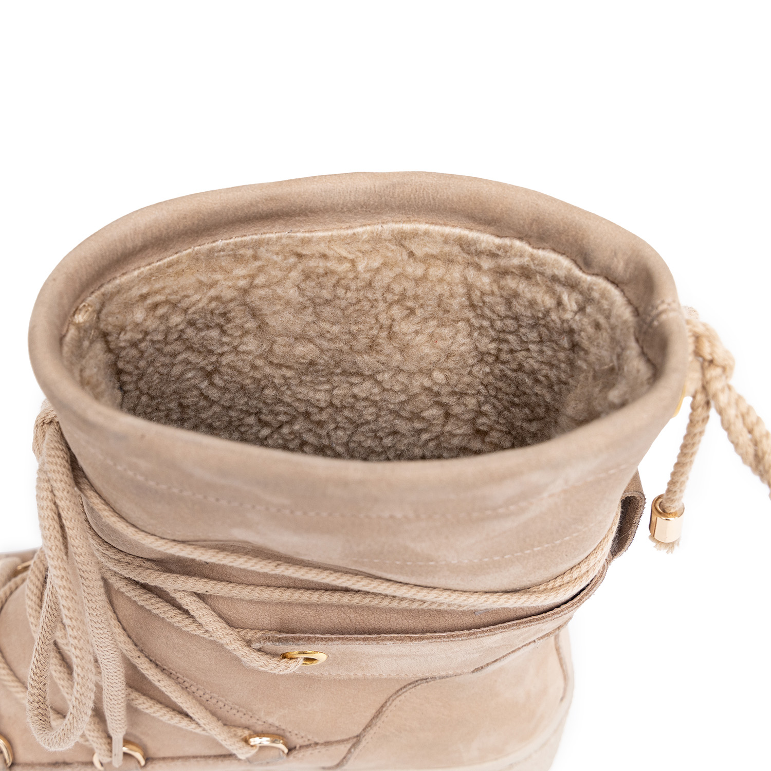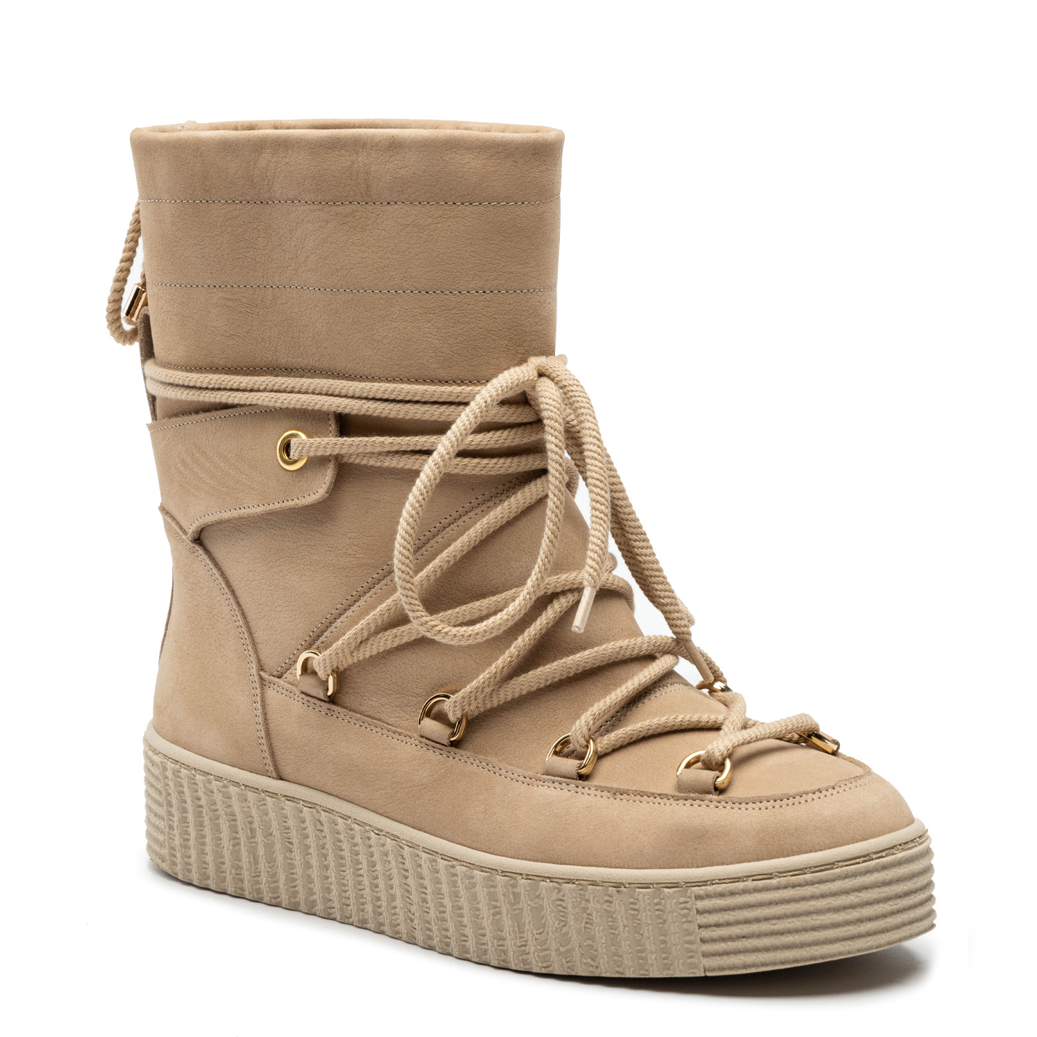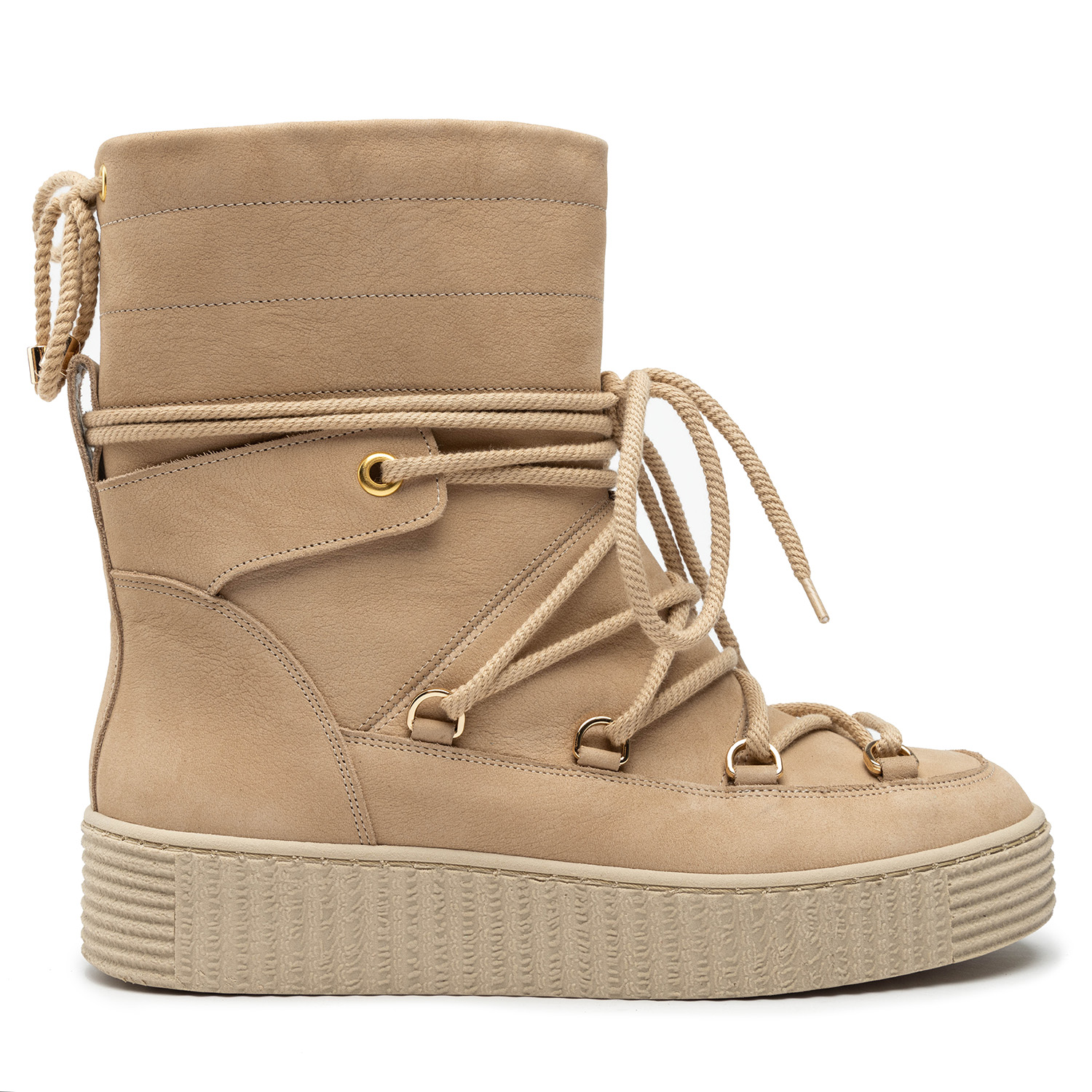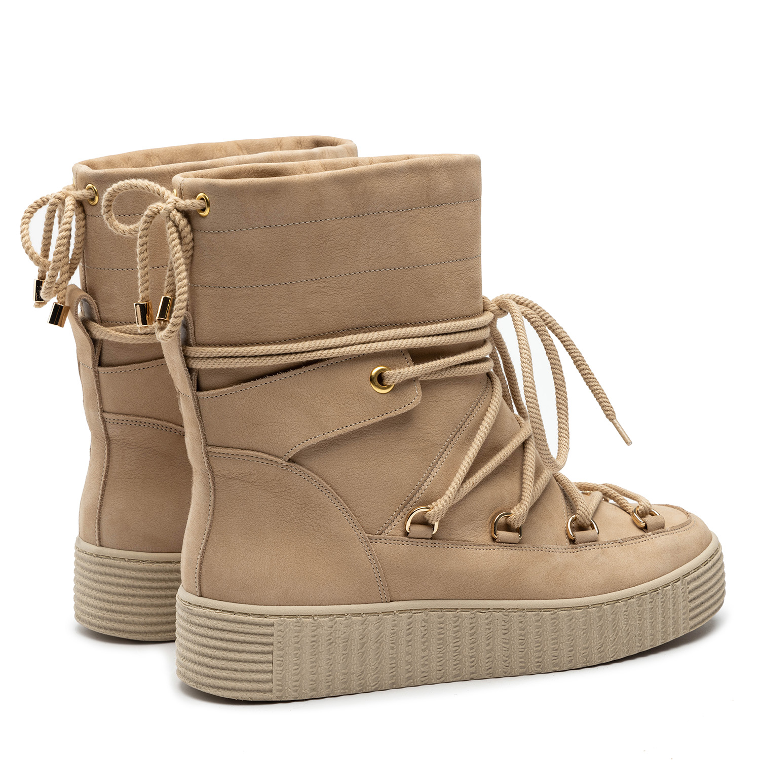 Damskie śniegowce to obowiązkowa propozycja dla wszystkich, którzy cenią sobie wygodę i utrzymanie ciepła podczas niskich temperatur. Model obuwia wykonany z naturalnej, nubukowej skóry, w środku wyściełany ociepleniem, które skutecznie utrzymuje ciepło, a ozdobne sznurowadła umożliwiają idealne dopasowanie butów do własnych preferencji. Płaska podeszwa wykonana z wysokogatunkowego tworzywa o grubości 3 cm stanowi świetny izolator od podłoża, a tłoczony bieżnik zapobiega ślizganiu się po nawierzchniach pokrytych lodem i śniegiem. Solidna cholewka o całkowitej wysokości 21 cm gwarantuje doskonałą ochronę przed mrozem. Śniegowce doskonale prezentują się w różnych stylizacjach, dodając im charakteru i przyciągając wzrok. Można je łączyć z wszelkimi stylizacjami — wygodnym dresem, sportowymi spodniami, codziennymi dżinsami, a także spódnicami lub sukienkami.