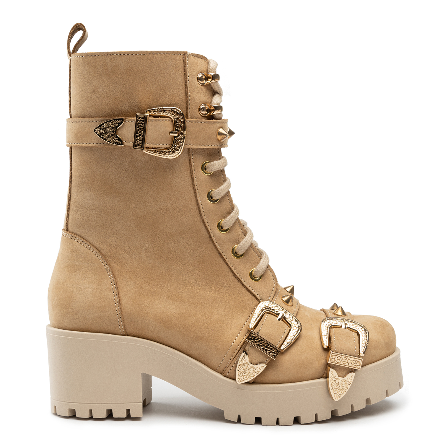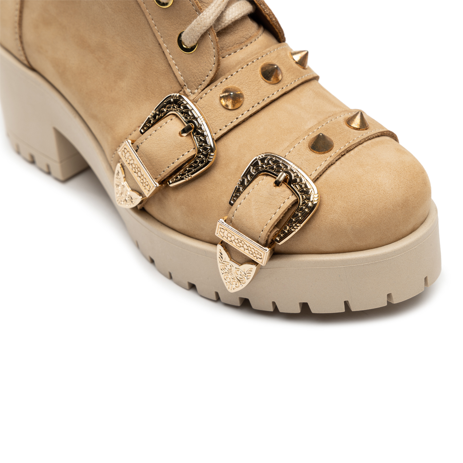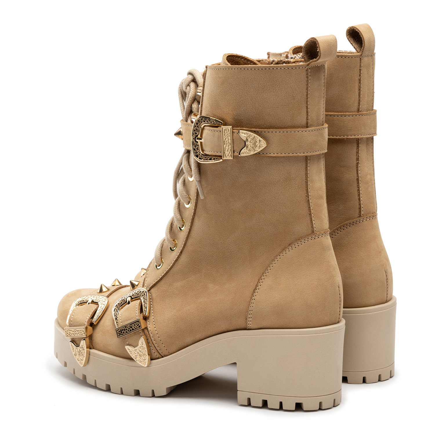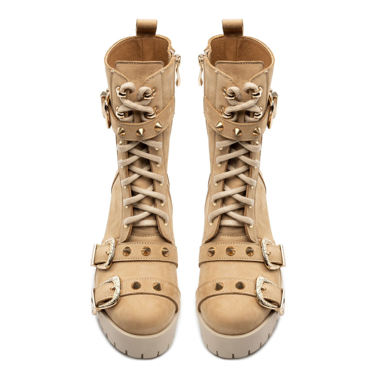 Camel NubukTrapery to masywnie wyglądające obuwie o wysokości ponad 26 cm wyrabiane na bazie naturalnej skóry. Wytworzono z niej nie tylko wierzchnią część buta, ale także jego wnętrze i wkładkę. Jedynie sześciocentymetrowy obcas o formie klocka oraz gruba na niespełna 3 cm podeszwa zostały wyprodukowane z tworzywa. Buty zdobią ciepłe tonacje beżu. Podeszwa ma odcień nieco jaśniejszy niż cały but. Trapery posiadają okrągły nosek i zapinane są na suwak, ale mają także alternatywne zapięcie w postaci sznurówek, Obuwie dekorują złote klamry i ćwieki.