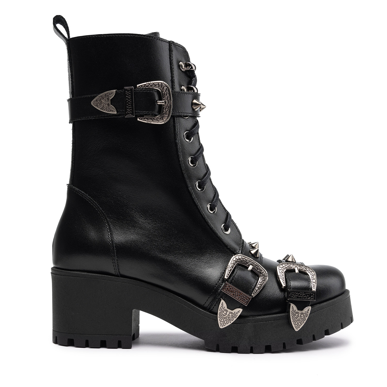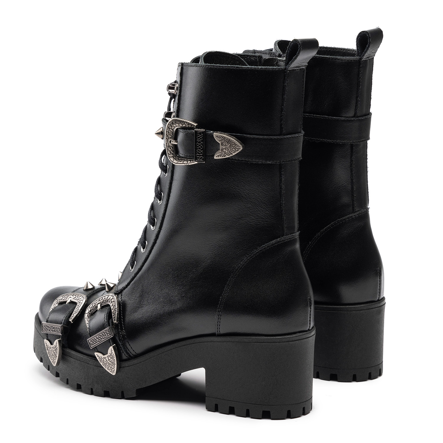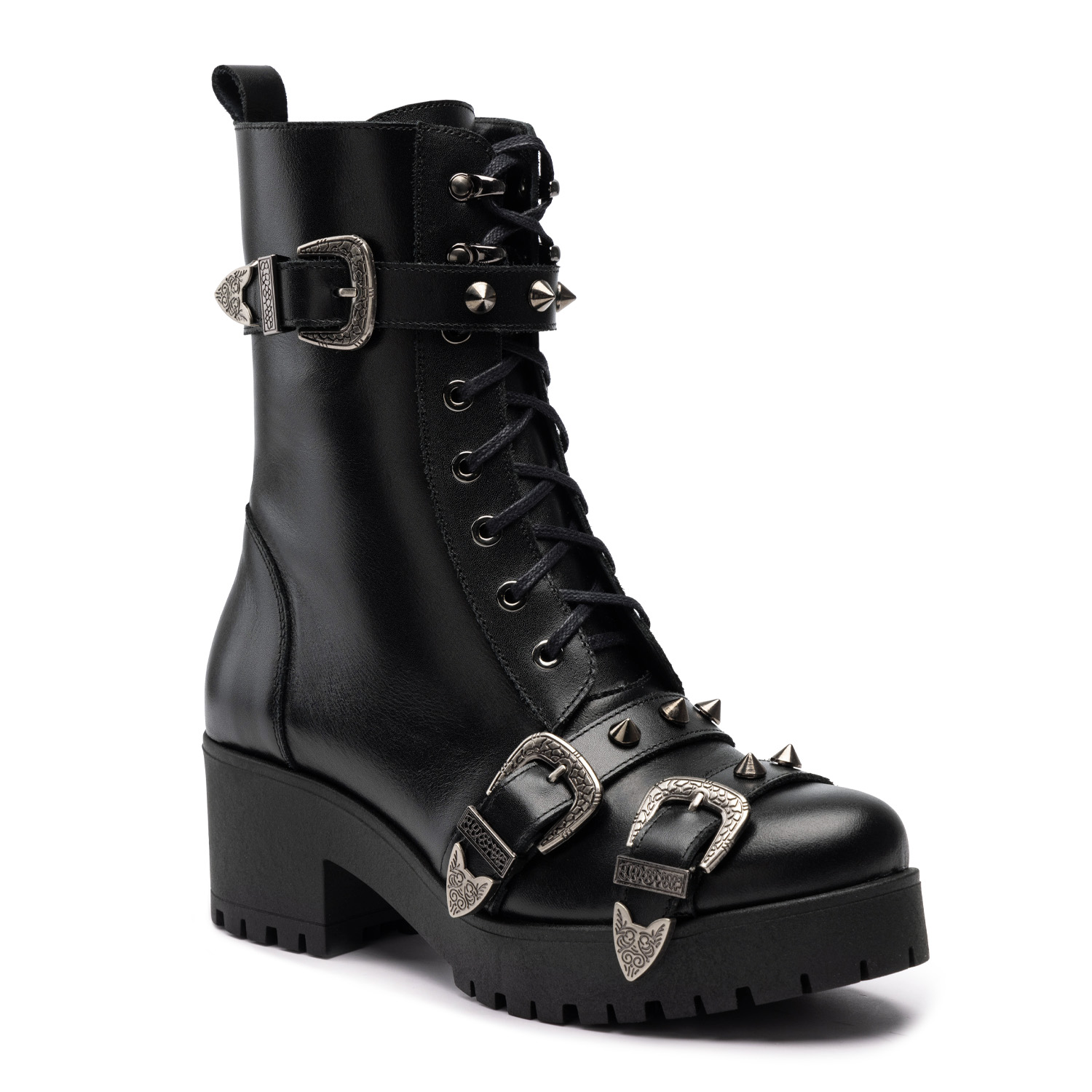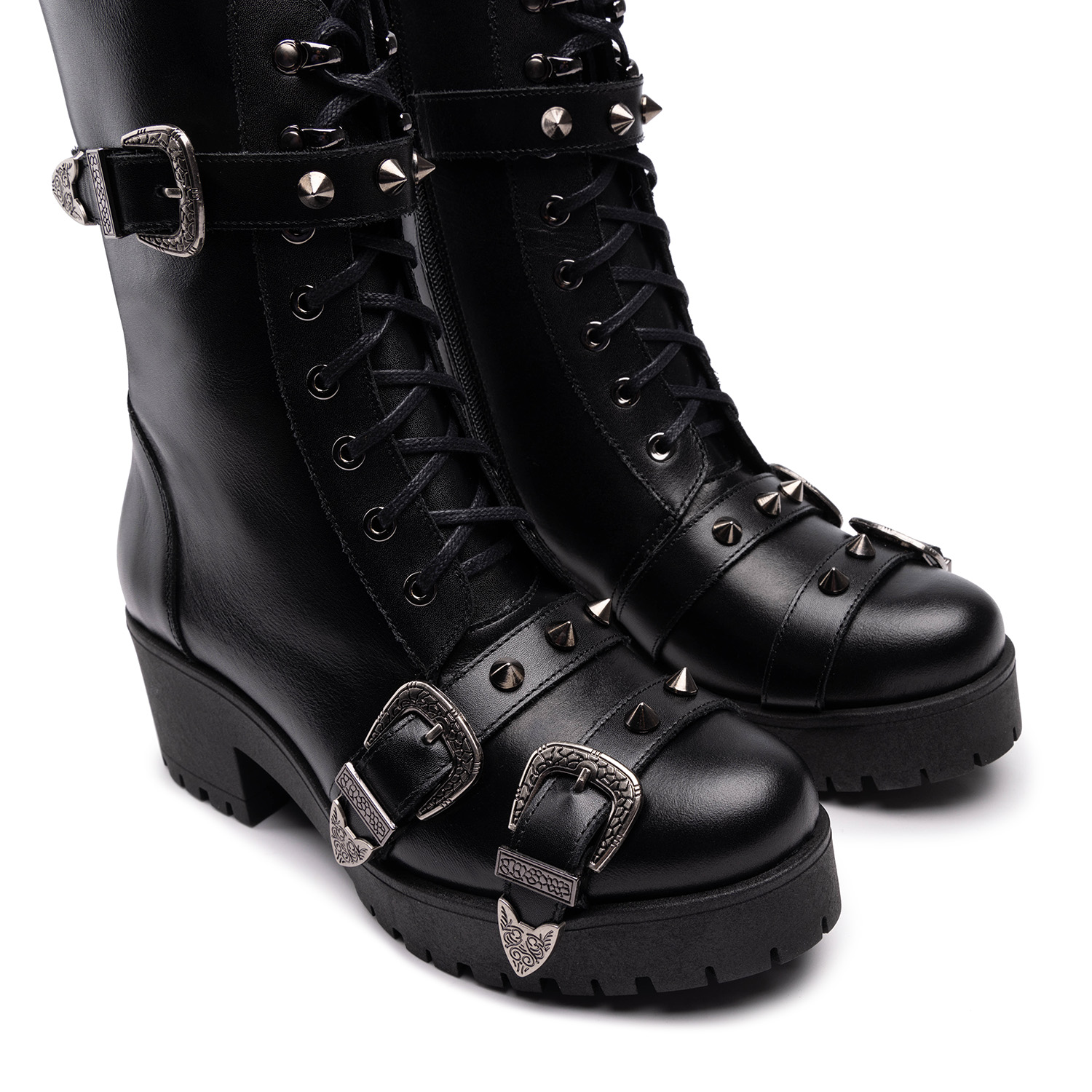 Trapery to masywnie wyglądające obuwie o wysokości ponad 26 cm wyrabiane na bazie naturalnej skóry. Wytworzono z niej nie tylko wierzchnią część buta, ale także jego wnętrze i wkładkę. Jedynie sześciocentymetrowy obcas o formie klocka oraz gruba na niespełna 3 cm podeszwa zostały wyprodukowane z tworzywa. Buty w głębokiej czarnej kolorystce zdobią złote klamry i ćwieki. Trapery posiadają okrągły nosek i zapinane są na suwak, ale mają także alternatywne zapięcie w postaci sznurówek.