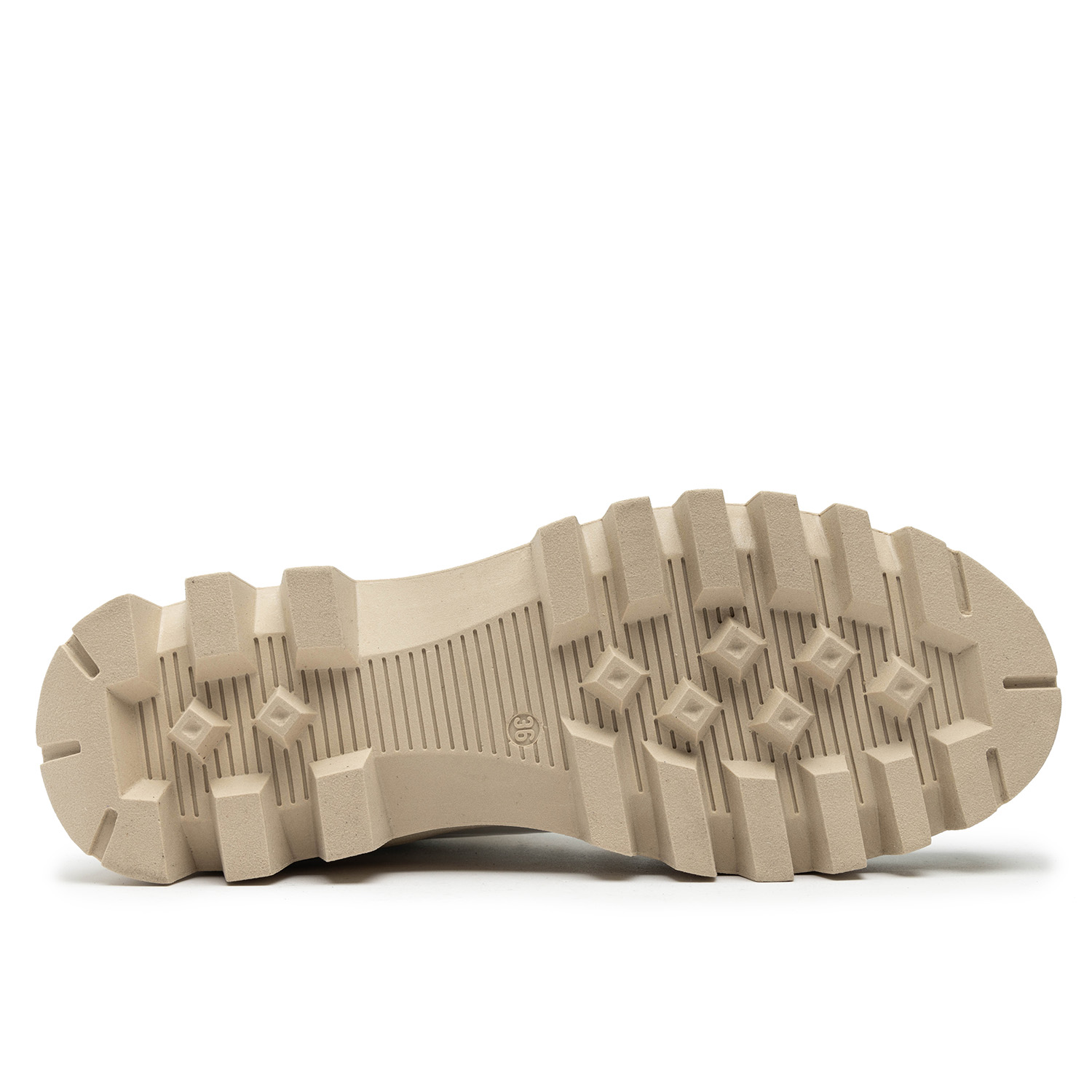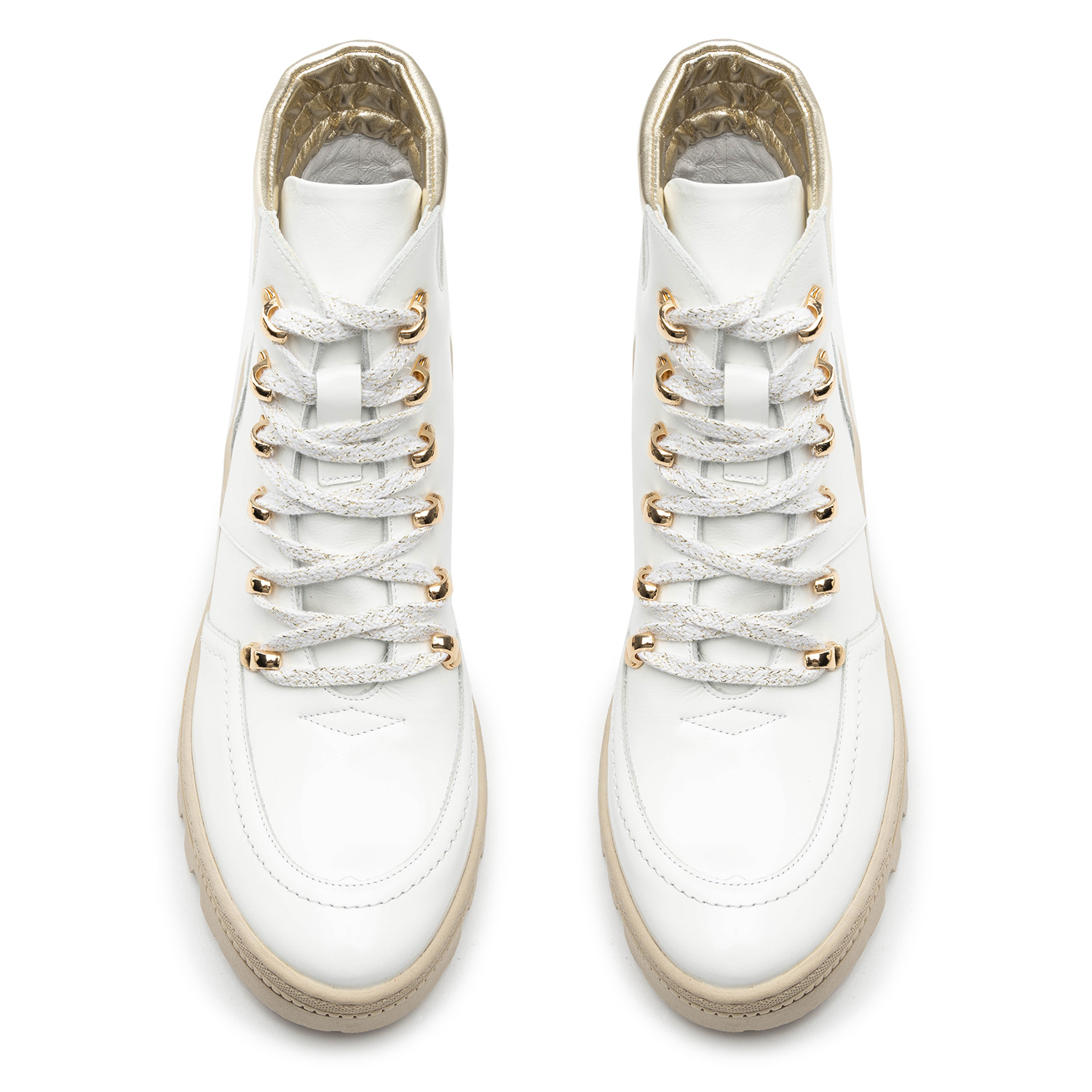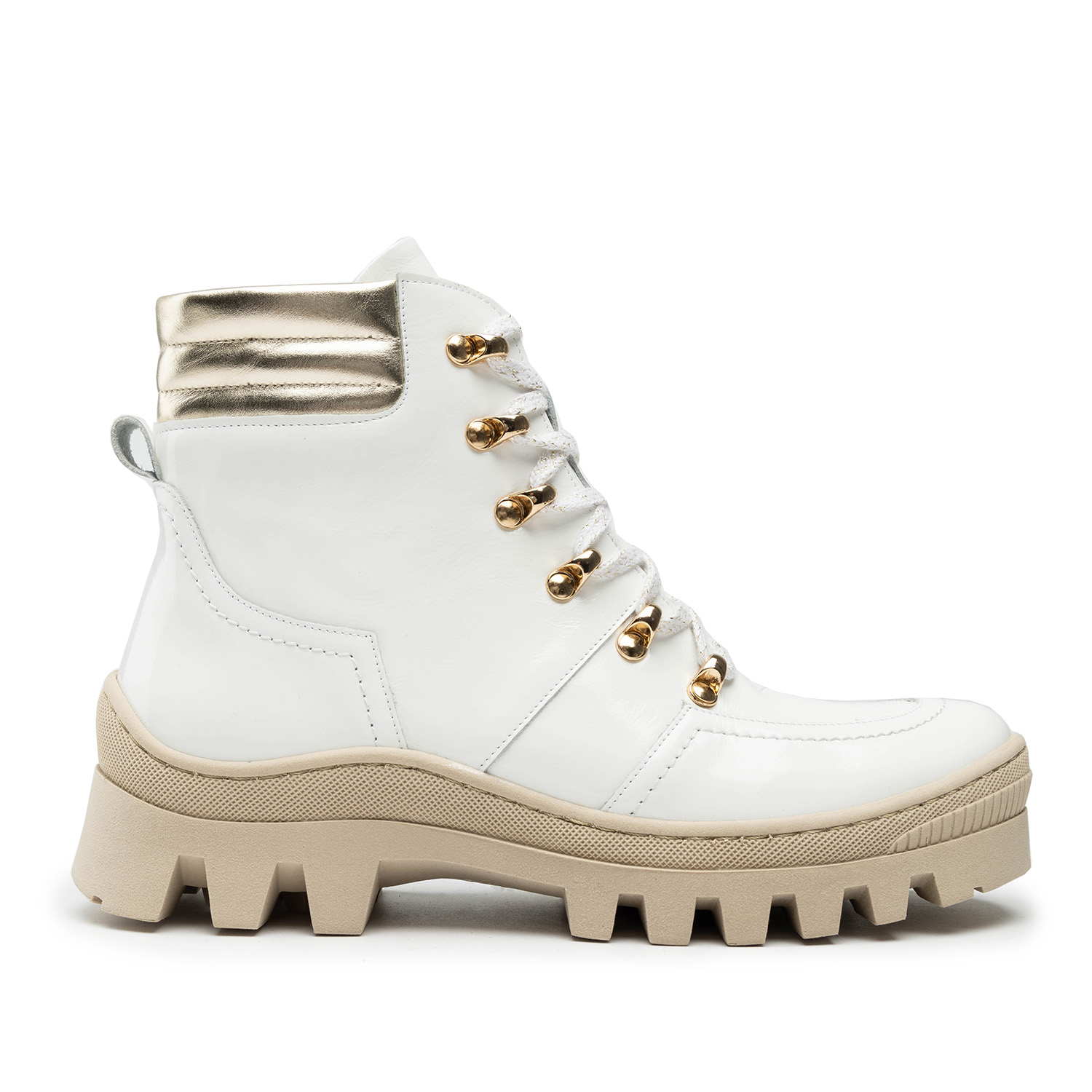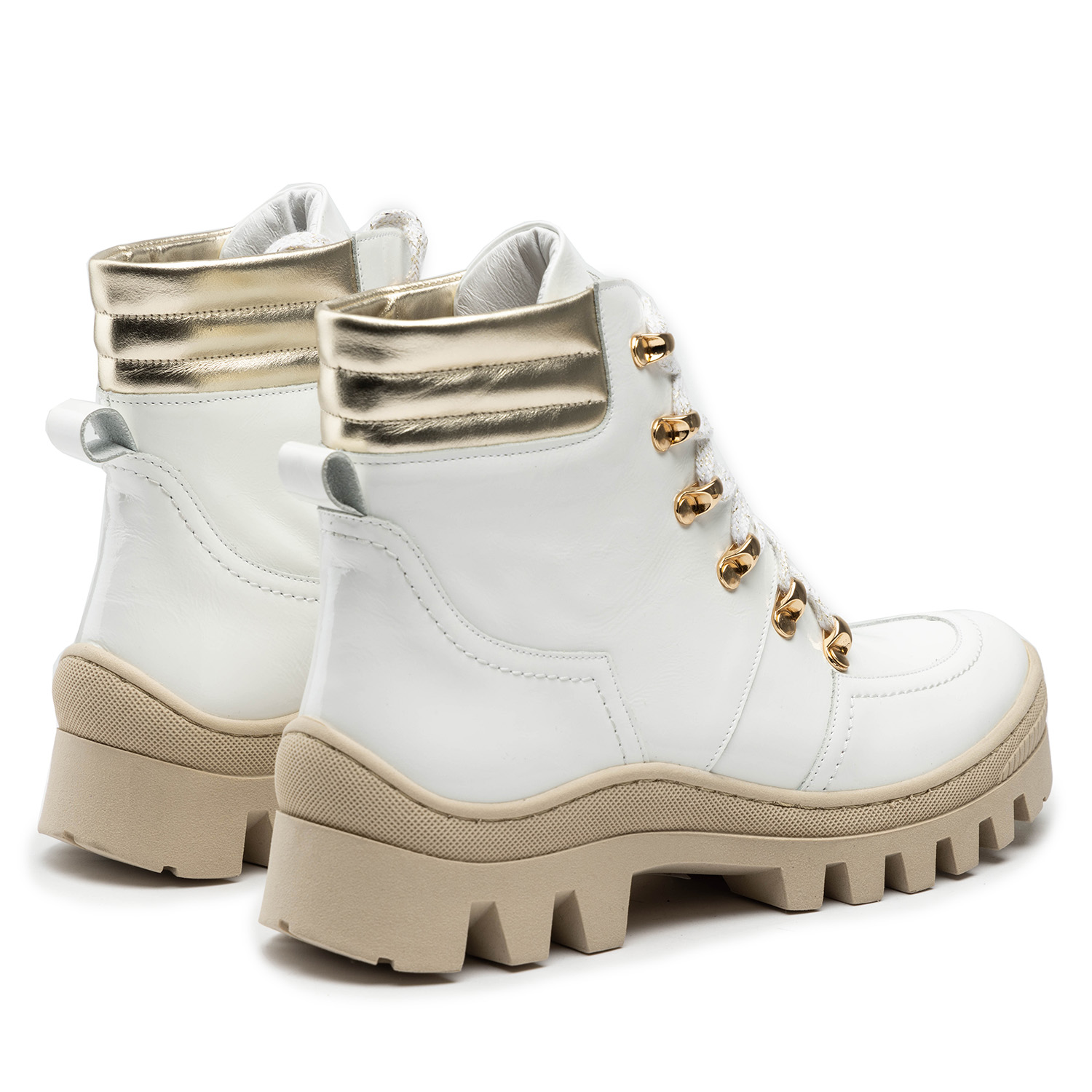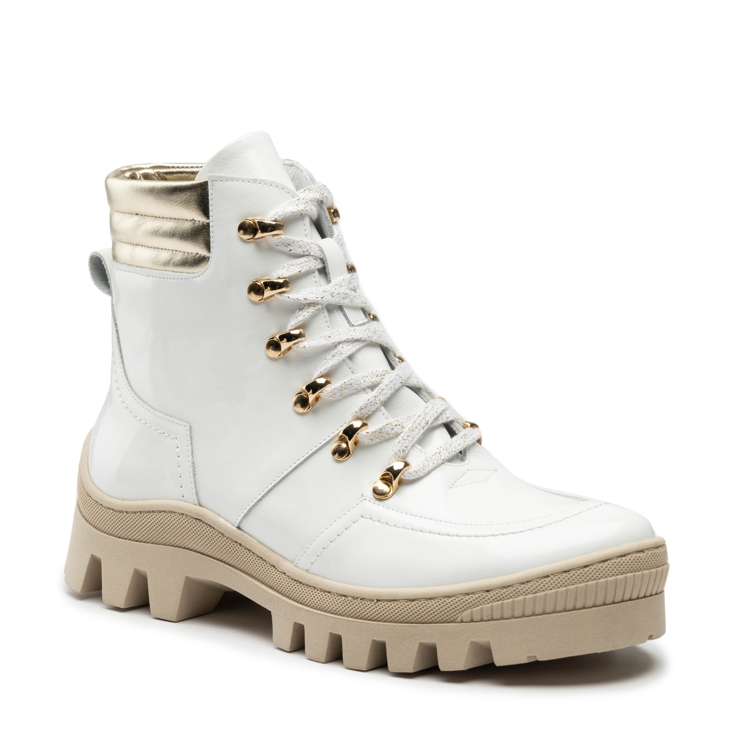 Trapery w białym kolorze ze złotym dodatkiem to doskonała opcja na wzbogacenie jesiennej i zimowej garderoby. Trapery są niesamowicie uniwersalnym obuwiem, odpowiednim zarówno do codziennych, sportowych outfitów, jak i do wykwintnych strojów. Za ich wyborem przemawia przede wszystkim komfort i wygoda podczas użytkowania, a niewysoka, gruba podeszwa z licznymi żłobieniami sprawdzi się nawet w ekstremalnych warunkach i nierównych gruntach. Trapery dostępne w naszym, sklepie są wykonywane z użyciem wysokiej klasy skóry naturalnej lakierowanej, natomiast elementy takie jak podeszwy i obcas są wykonane z dobrego gatunkowo tworzywa sztucznego. Dobranie wybitnych jakościowo materiałów, odpowiednia impregnacja i staranna pielęgnacja pozwoli cieszyć się obuwiem przez wiele sezonów. Subtelne dodatki w kolorze złotym przy sznurówkach lub z tyłu cholewki dodają całej stylizacji charakteru i unikalności.