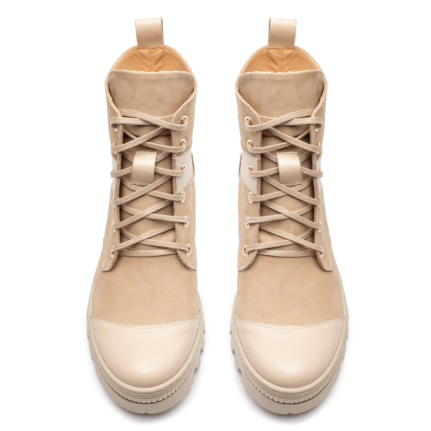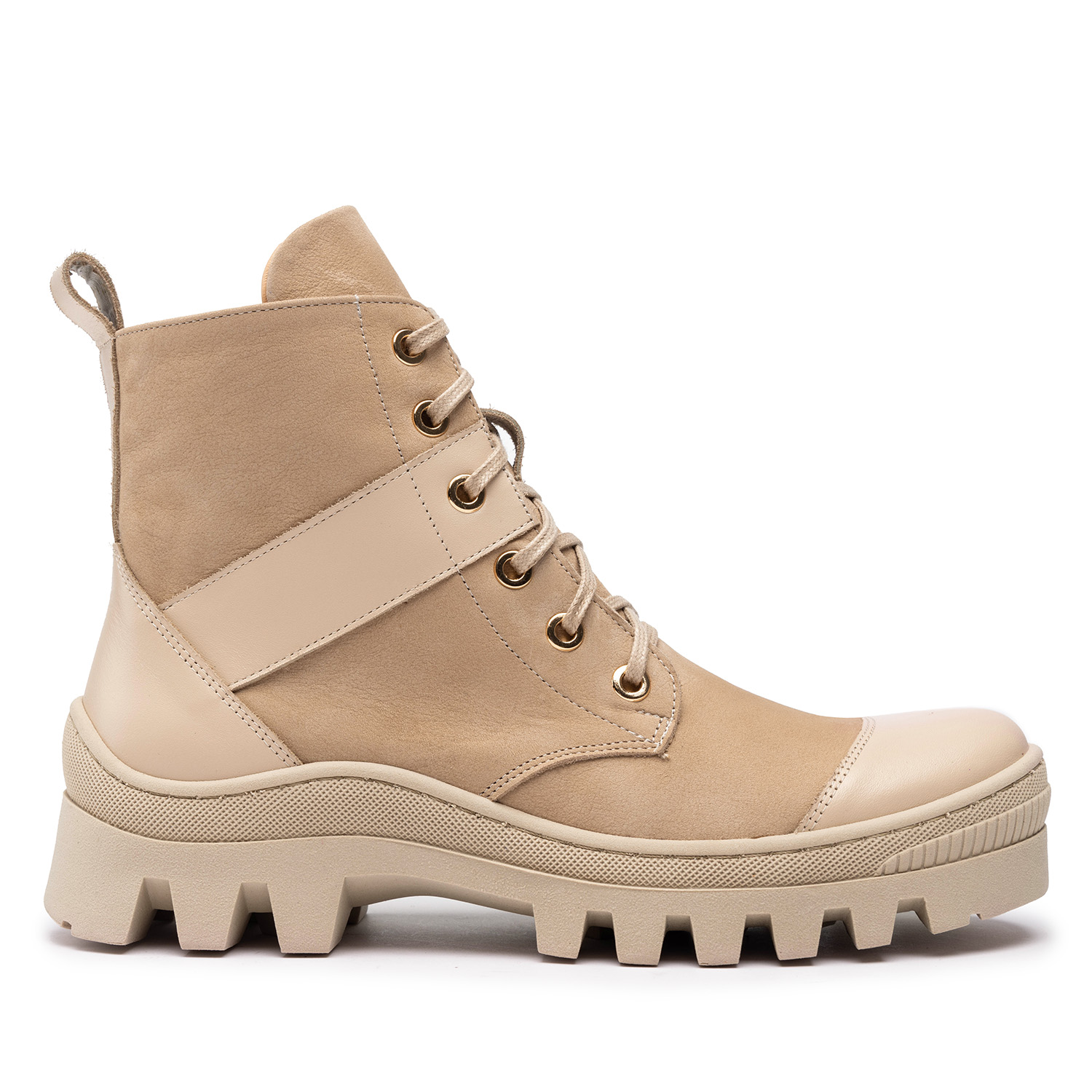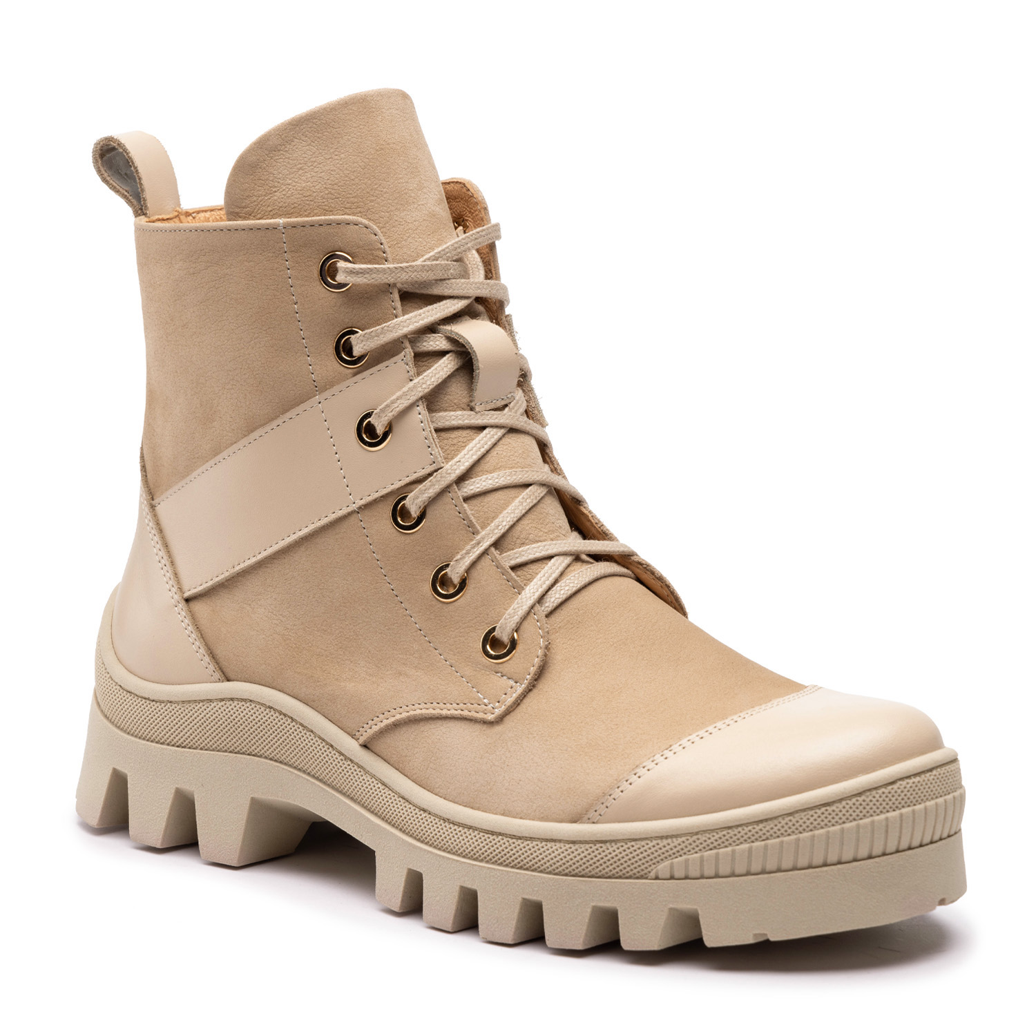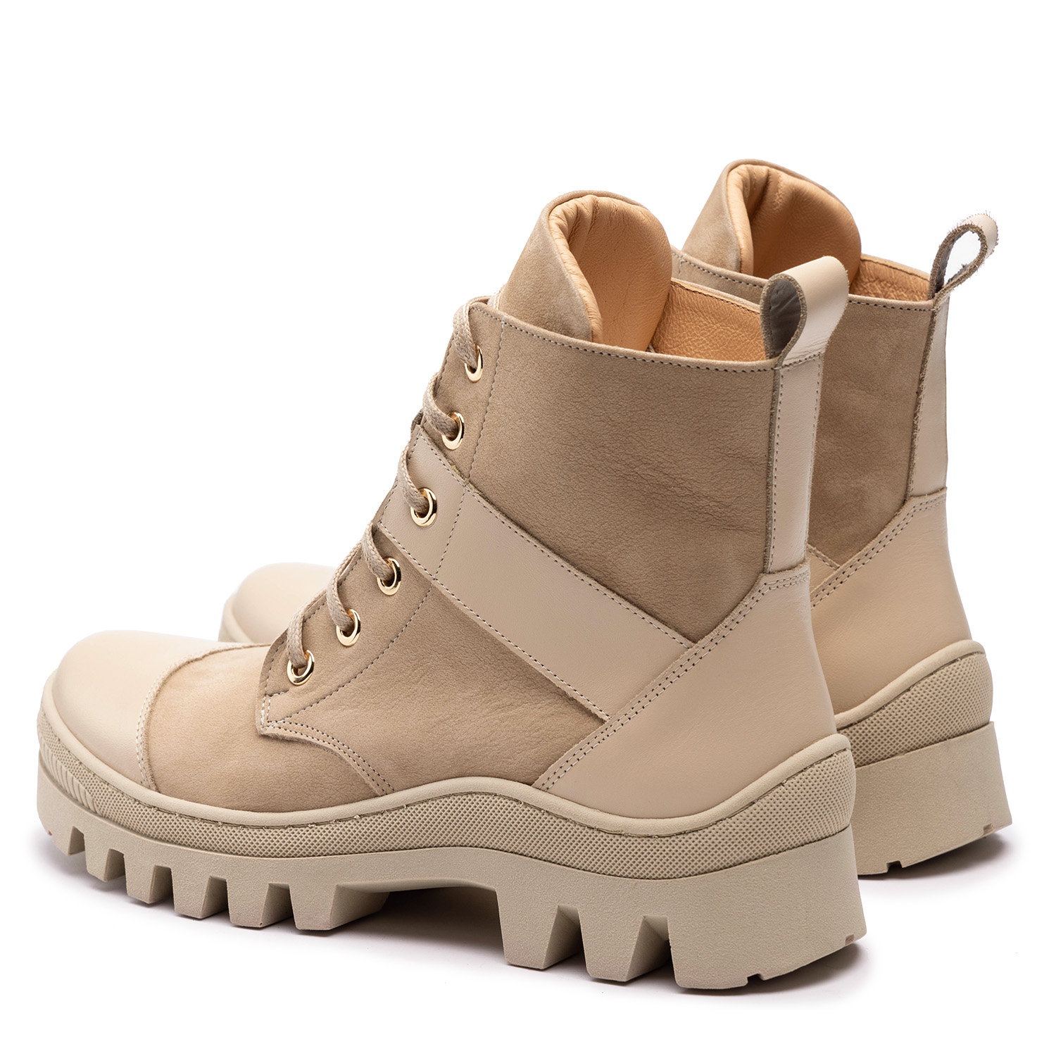 Ekri Nubuk/Ekri LicoKlasyczne trapery o łagodnym wykończeniu i materiałowych sznurówkach, w dwóch wersjach kolorystycznych — czarnej oraz beżowej, doskonale nadają się na długie zimowe wędrówki, jak również pasują do casualowych, a nawet wieczorowych stylizacji. Trapery są wykonane z wysokiej jakości materiałów pochodzenia naturalnego — skóry nubuk oraz skóry licowej, obecnej na wykończeniach buta. Gruba, wysoka na 3,5 centymetrów podeszwa z wyżłobieniami typu traktor zapewni równowagę i stabilność podczas chodzenia nawet po grząskich i bardzo nierównych lub śliskich gruntach. Oprócz podeszwy na platformie również obcas jest lekko podwyższony, o łącznej wysokości 6 cm. Dzięki zastosowaniu elementów łączonych z różnego typu materiałów trapery nie wydają się toporne i są ciekawą alternatywą dla klasycznych zimowych botków.